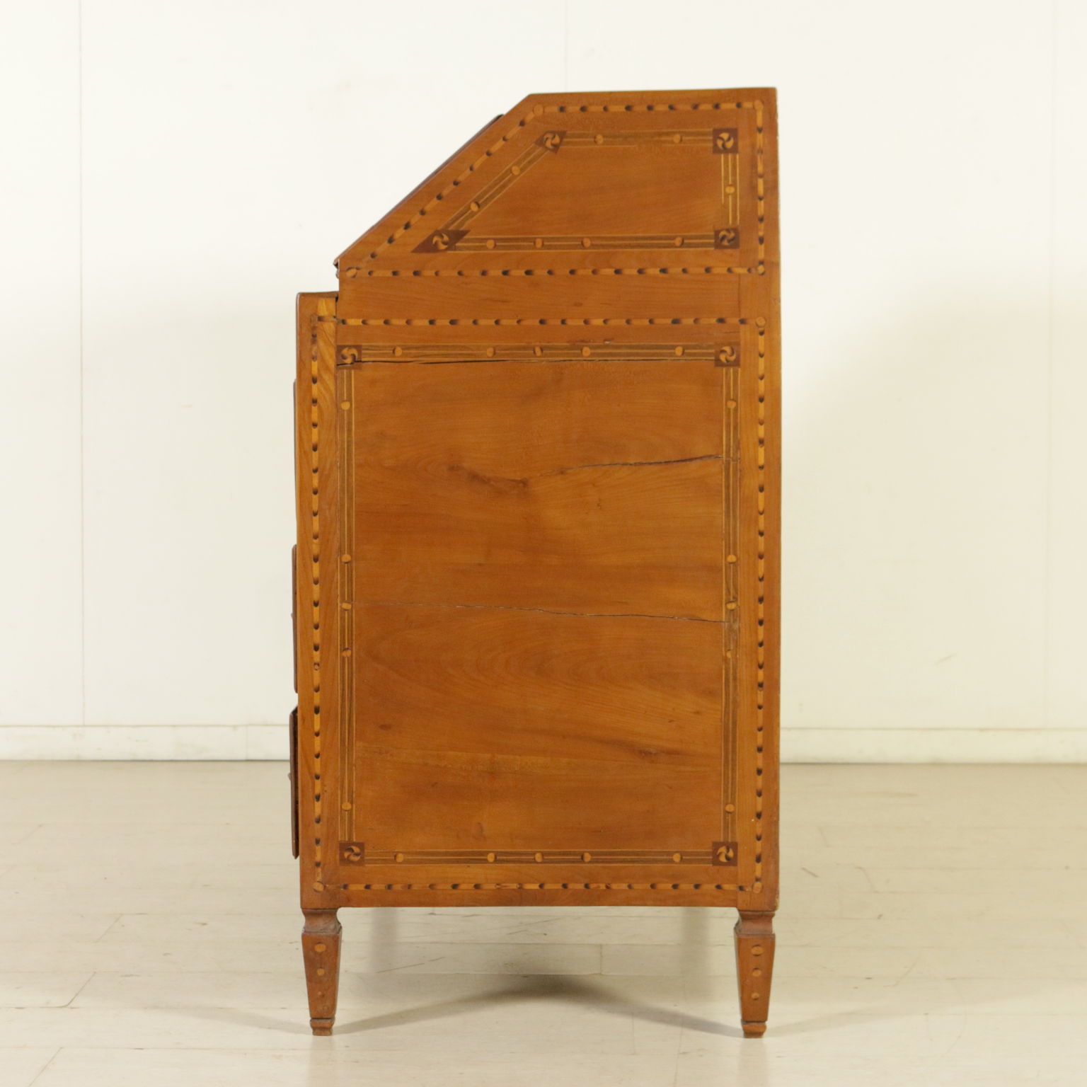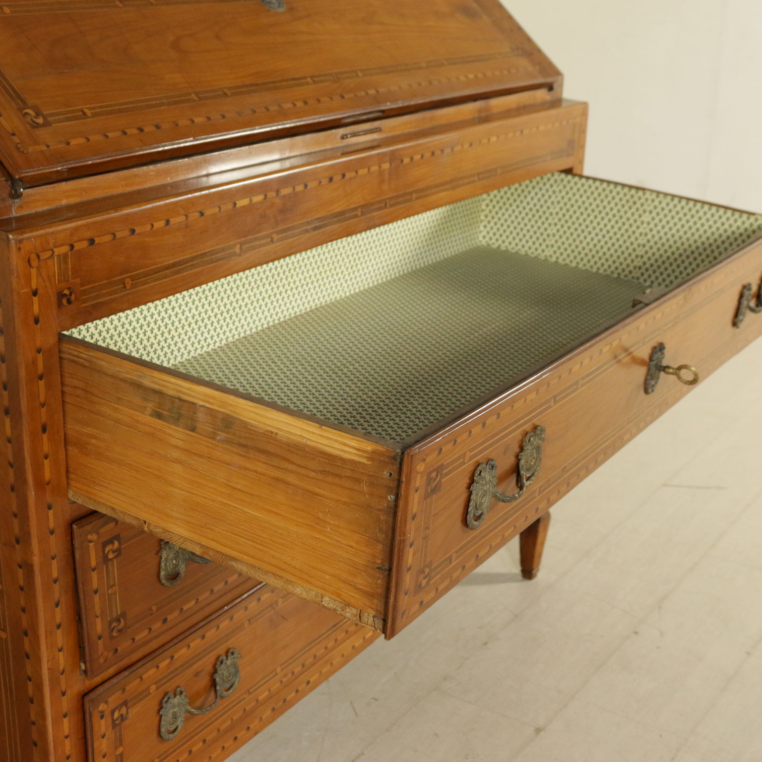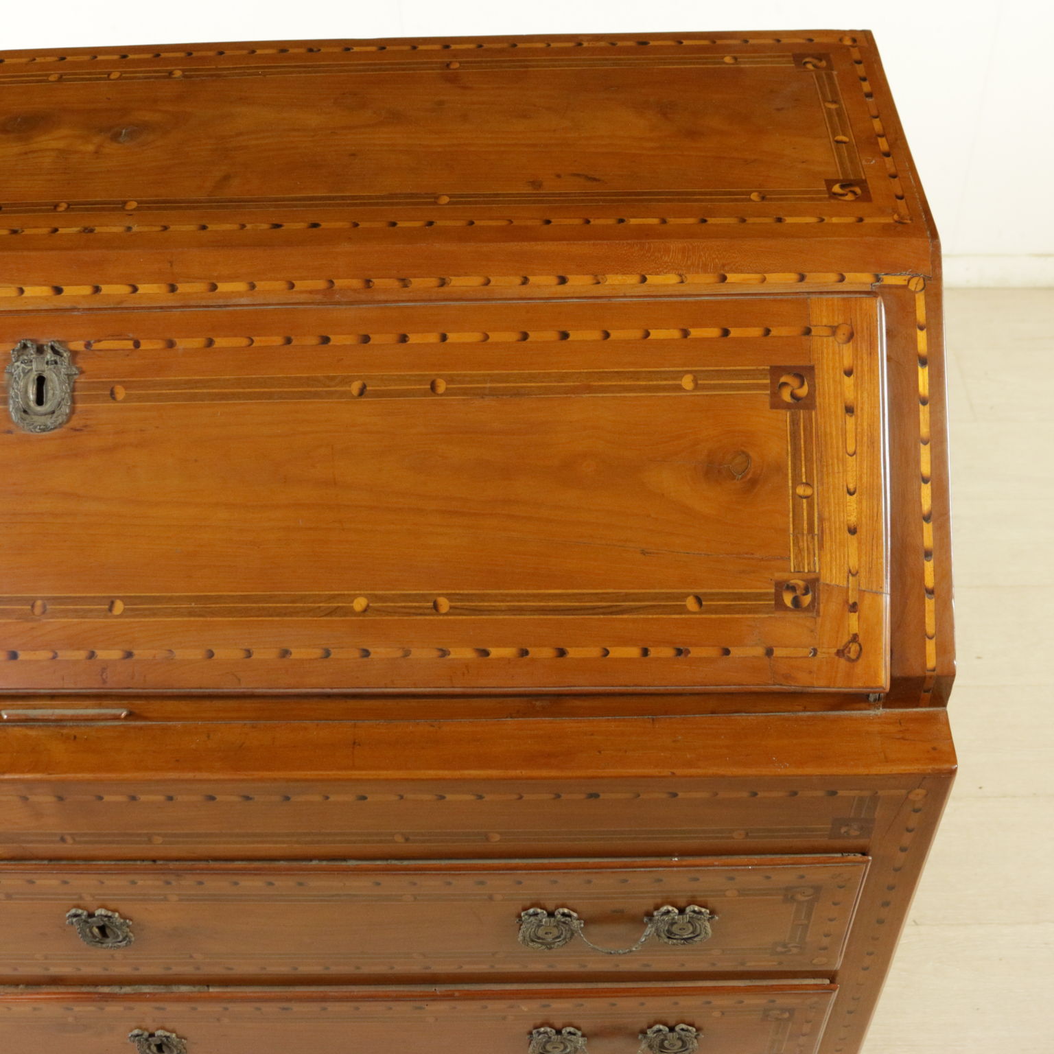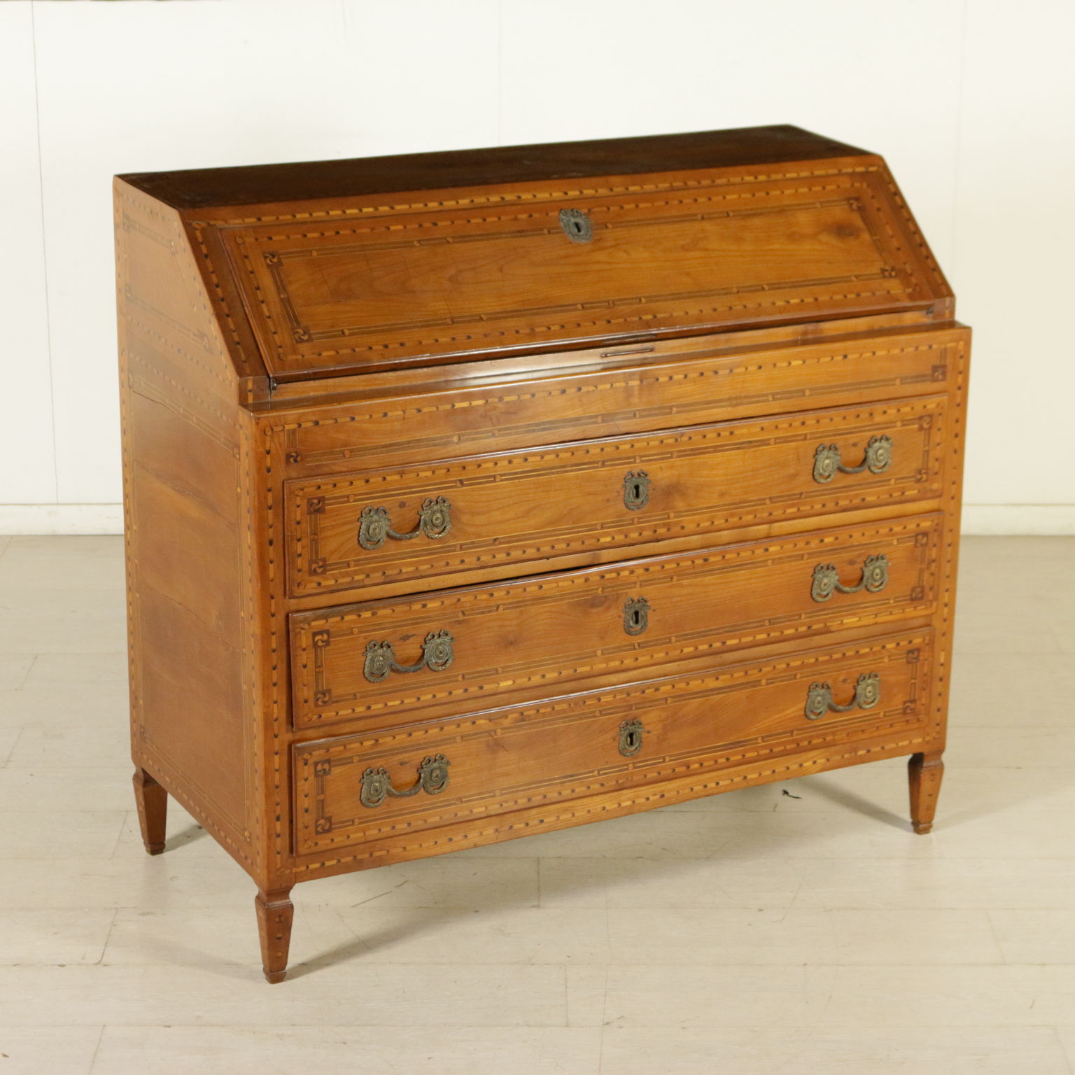 Elegant limelight with three drawers straight from the foot is composed of. Features tilting door, four small drawers interior with hinged and sliding top secret. Intarsia a toppo in maple and walnut.