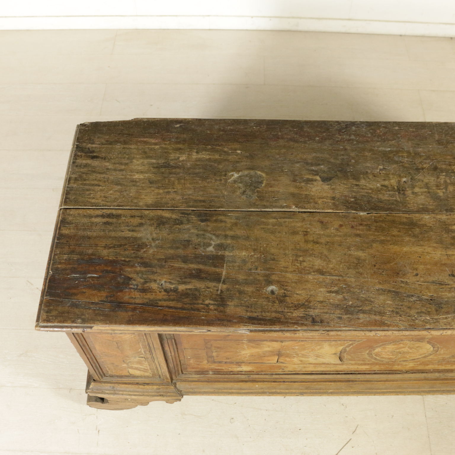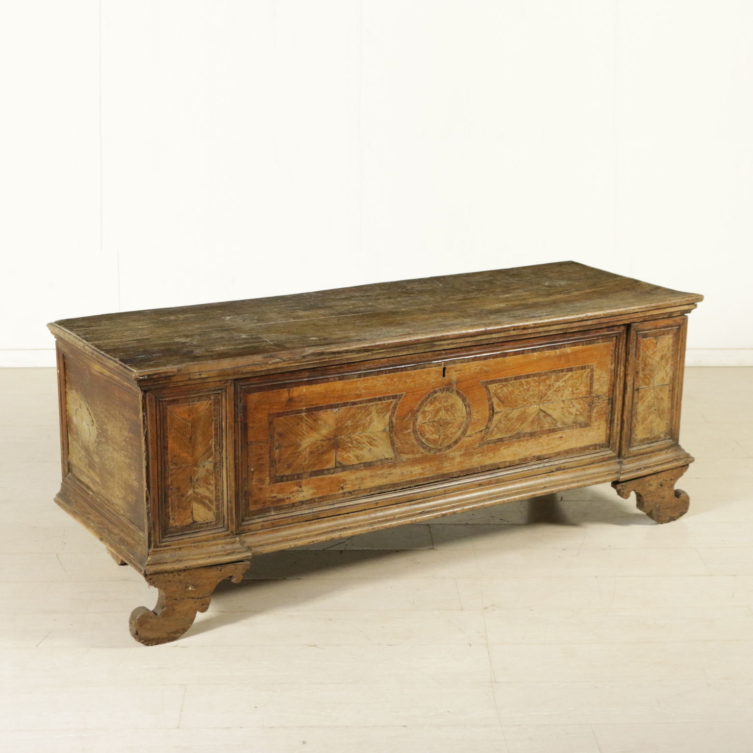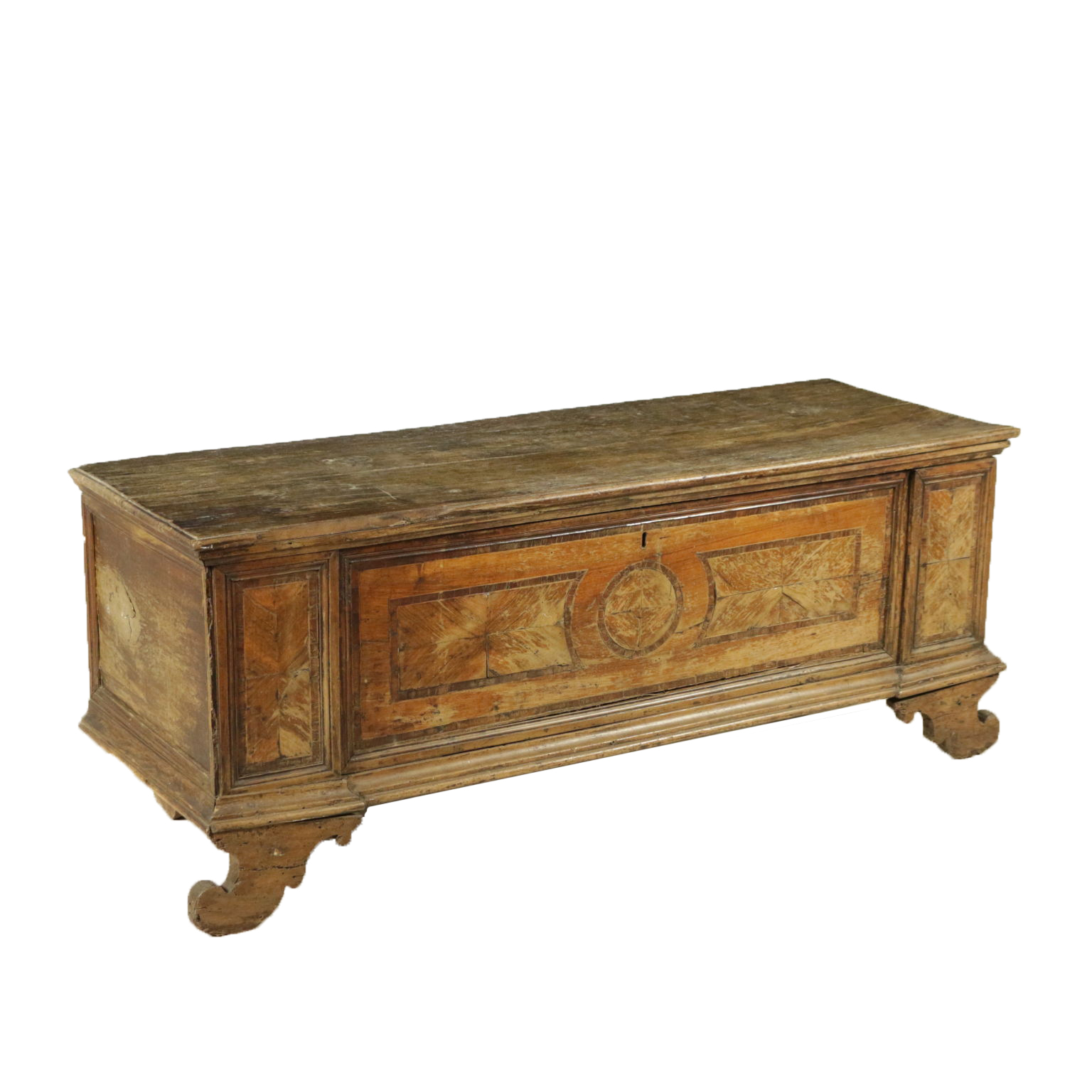 Chest lastronata on the front with reserves in walnut veined and threads. Bracket feet and the floor opening. Antiques, Italy, first half of the '700.