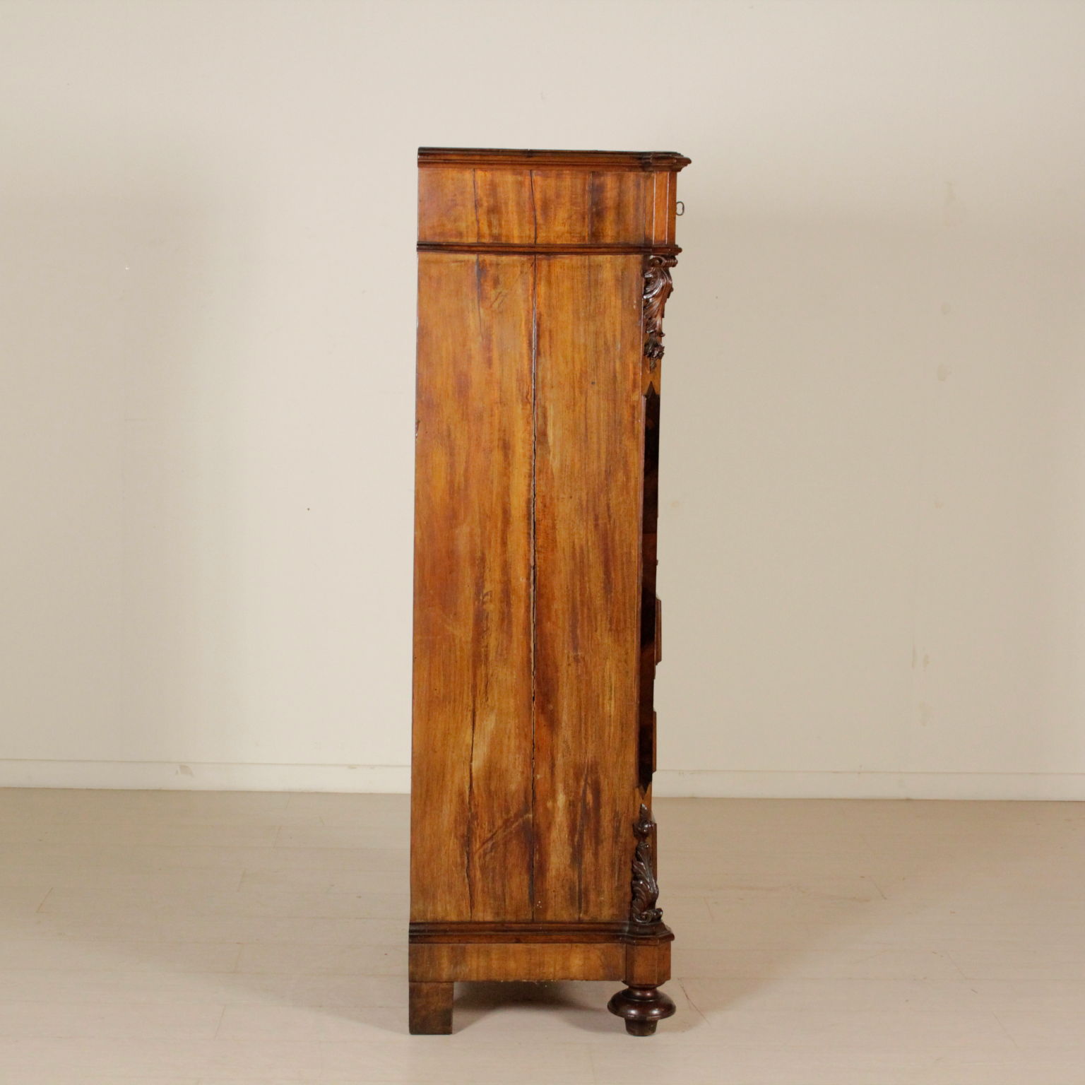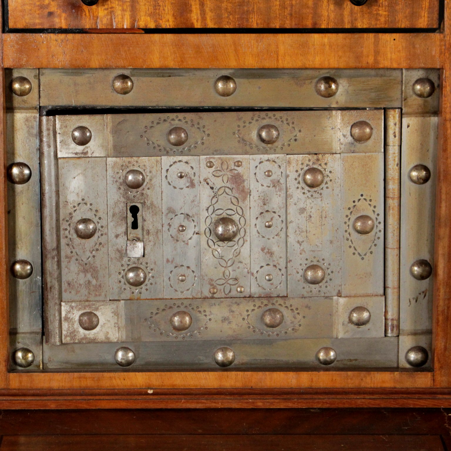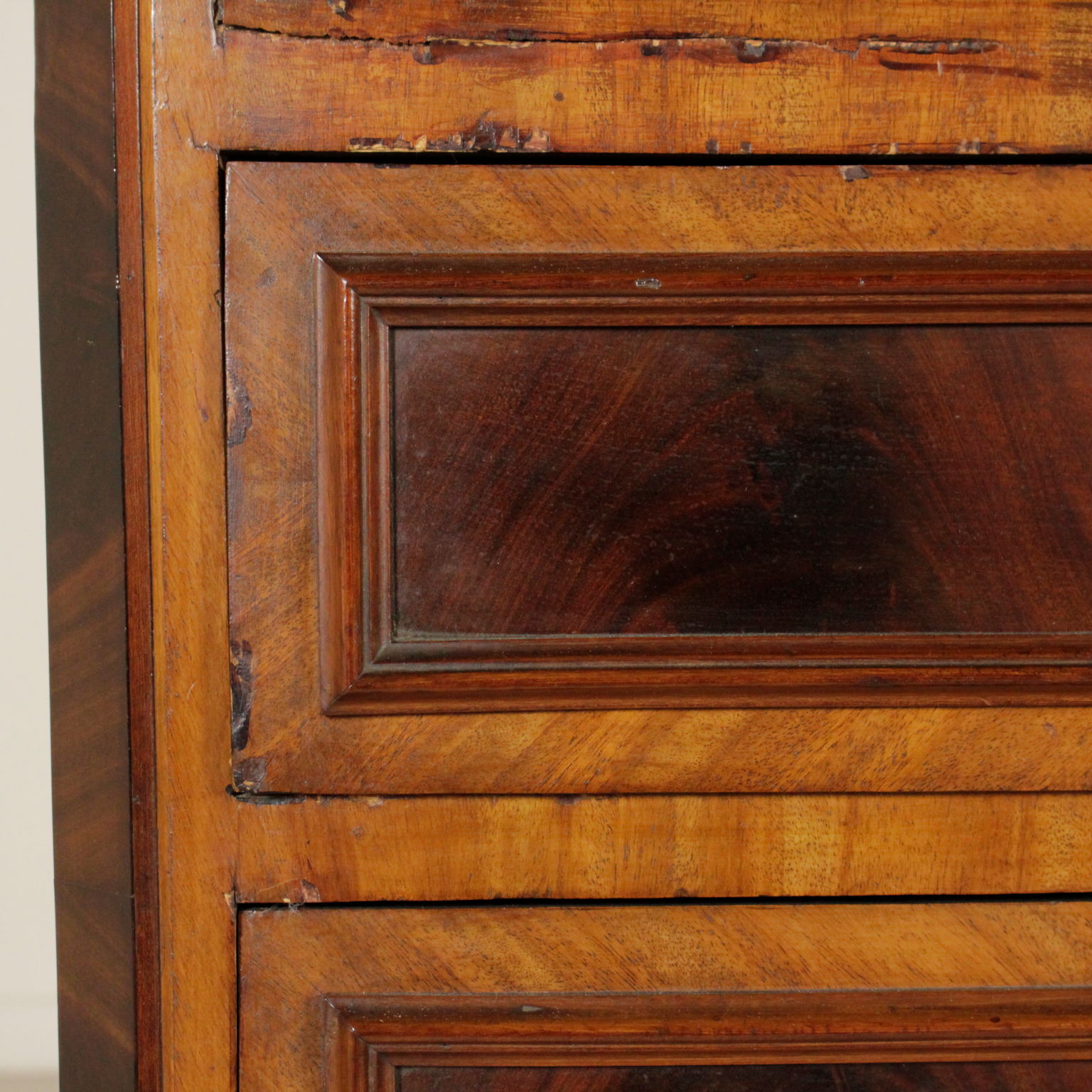 Small secretaire, three drawers plus another one under the top. The drop-leaf door hides a drawer and a metal safe that needs restoration. Uprights with tiles and carvings. Cathedral mahogany veneer. Manufactured in Italy, second half of the 19th century.