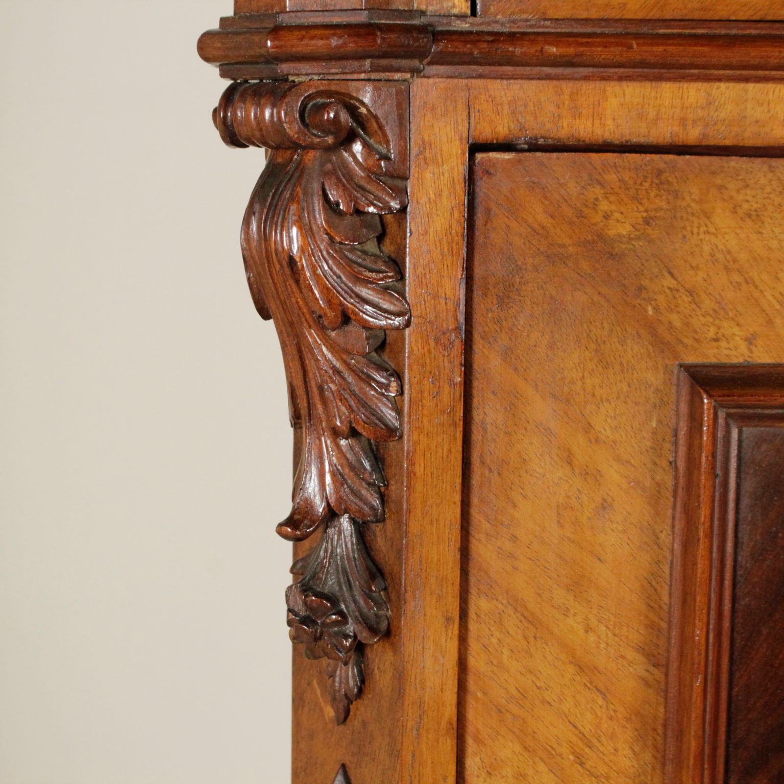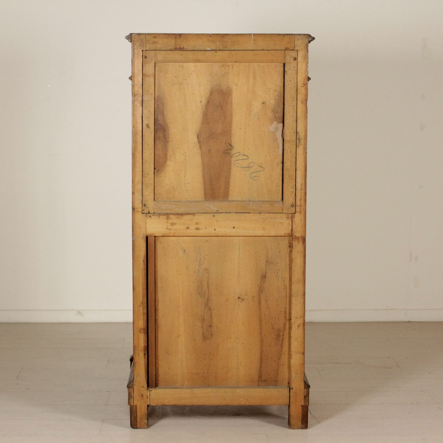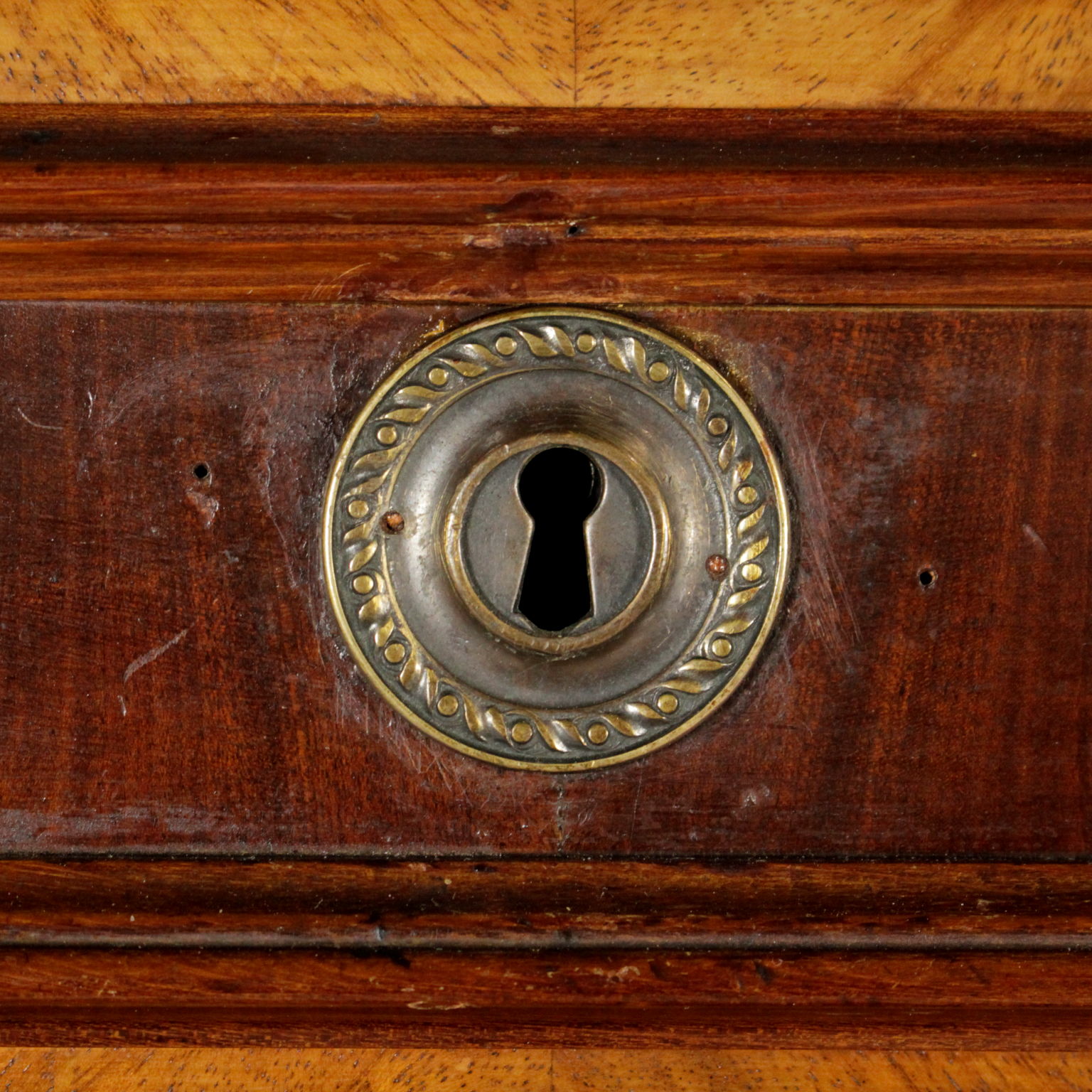 Small secretaire, three drawers plus another one under the top. The drop-leaf door hides a drawer and a metal safe that needs restoration. Uprights with tiles and carvings. Cathedral mahogany veneer. Manufactured in Italy, second half of the 19th century.