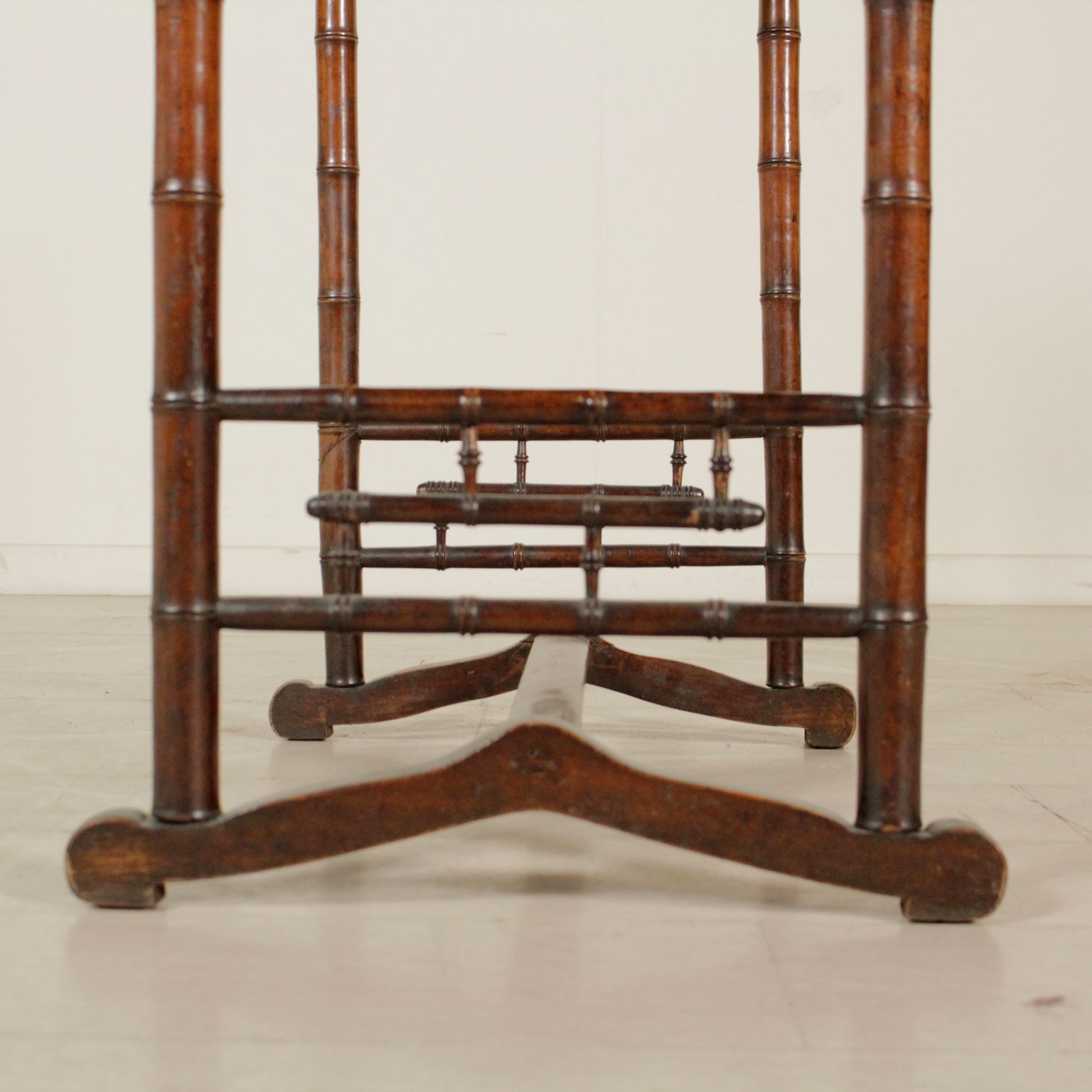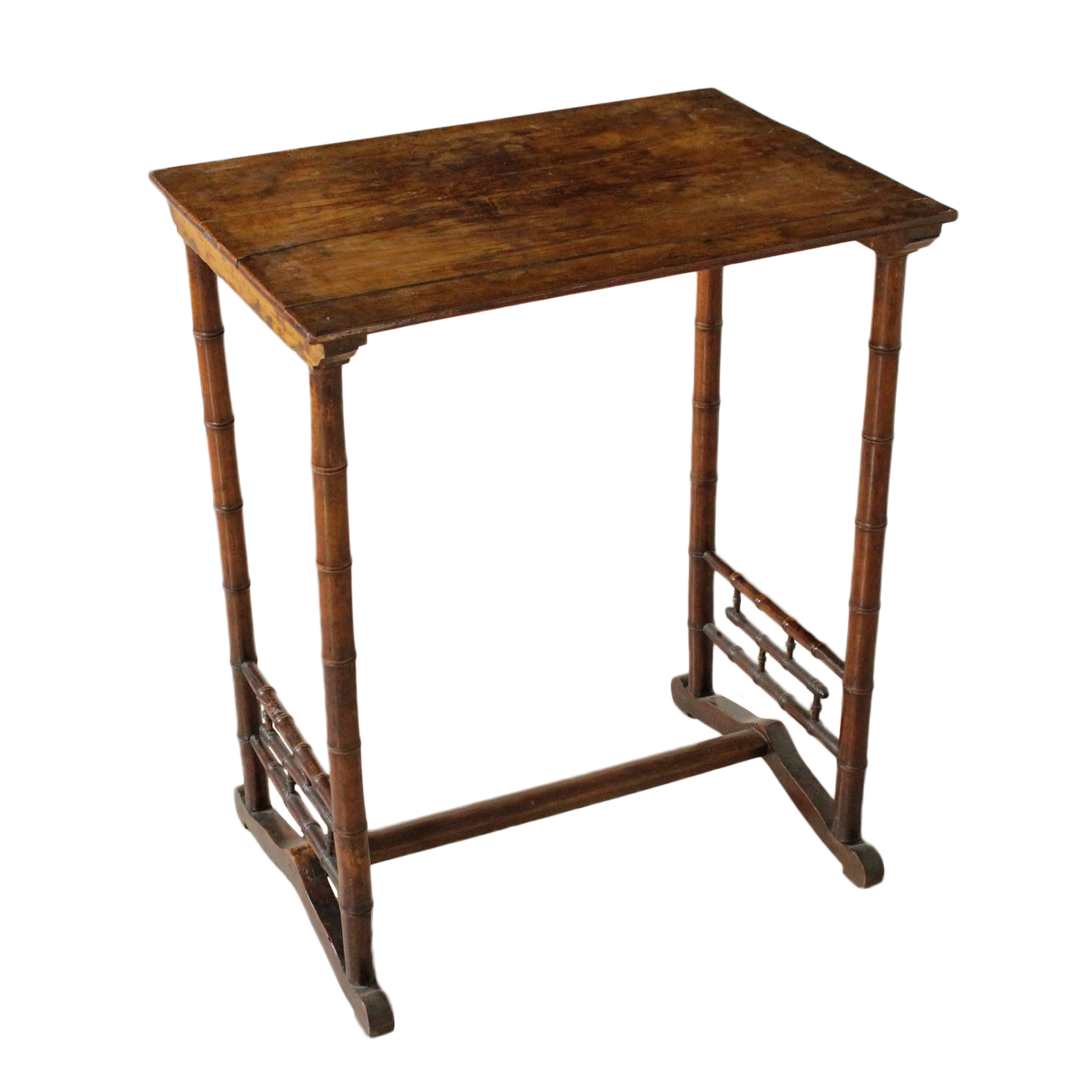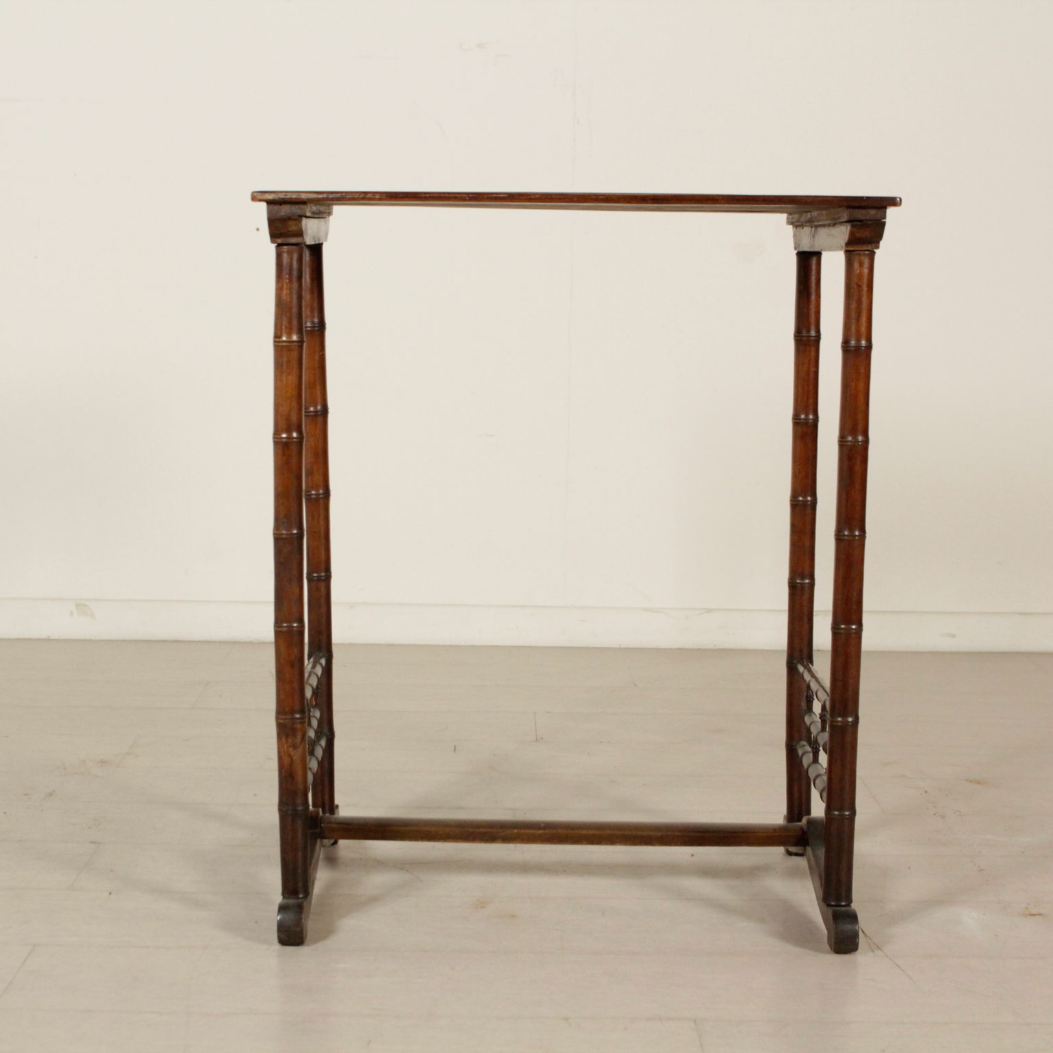 A coffee table, cherry wood. Carved legs and crossbeams, bamboo effect. Rectangular top. Manufactured in Italy, second half of the 19th century.