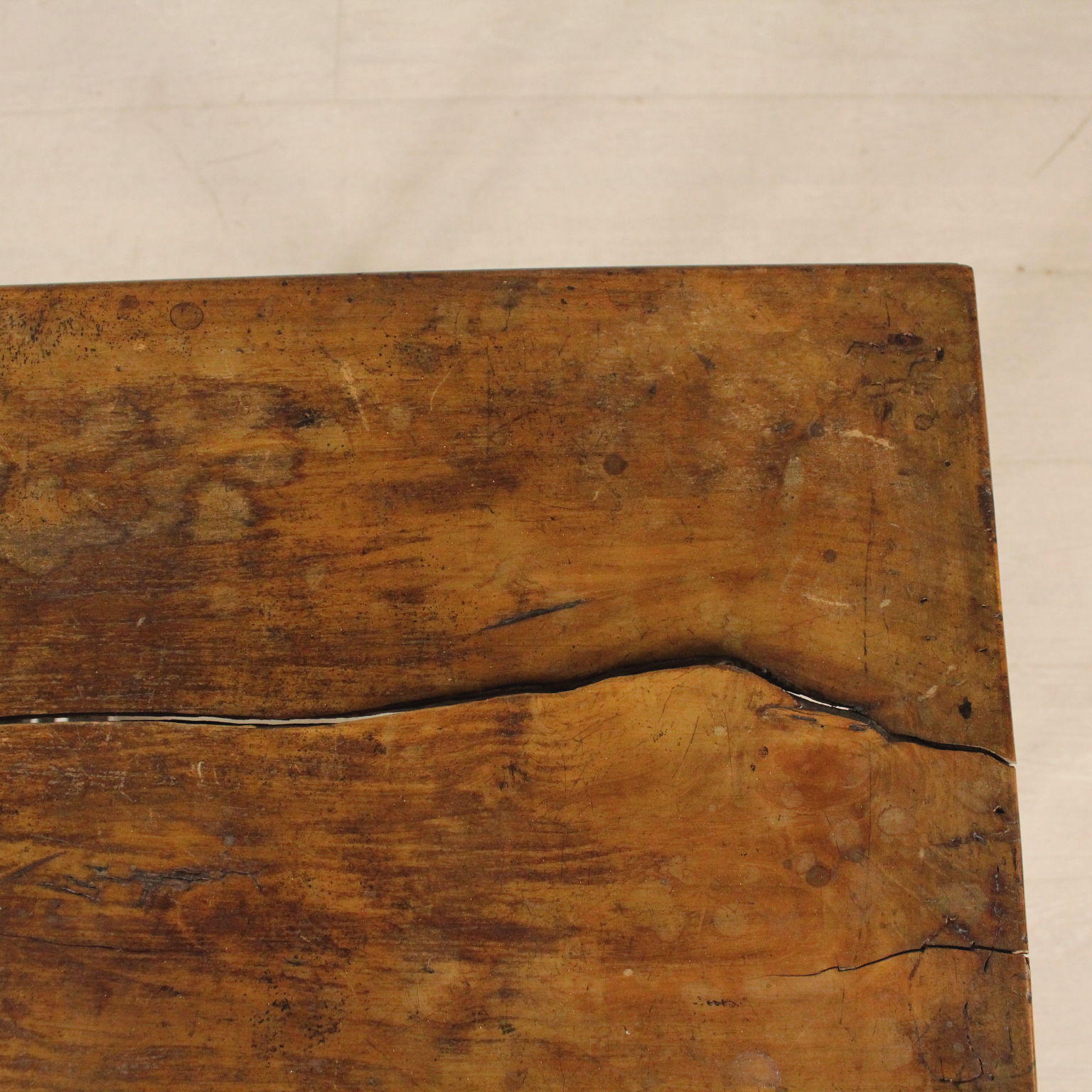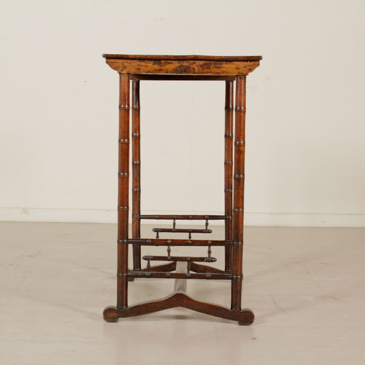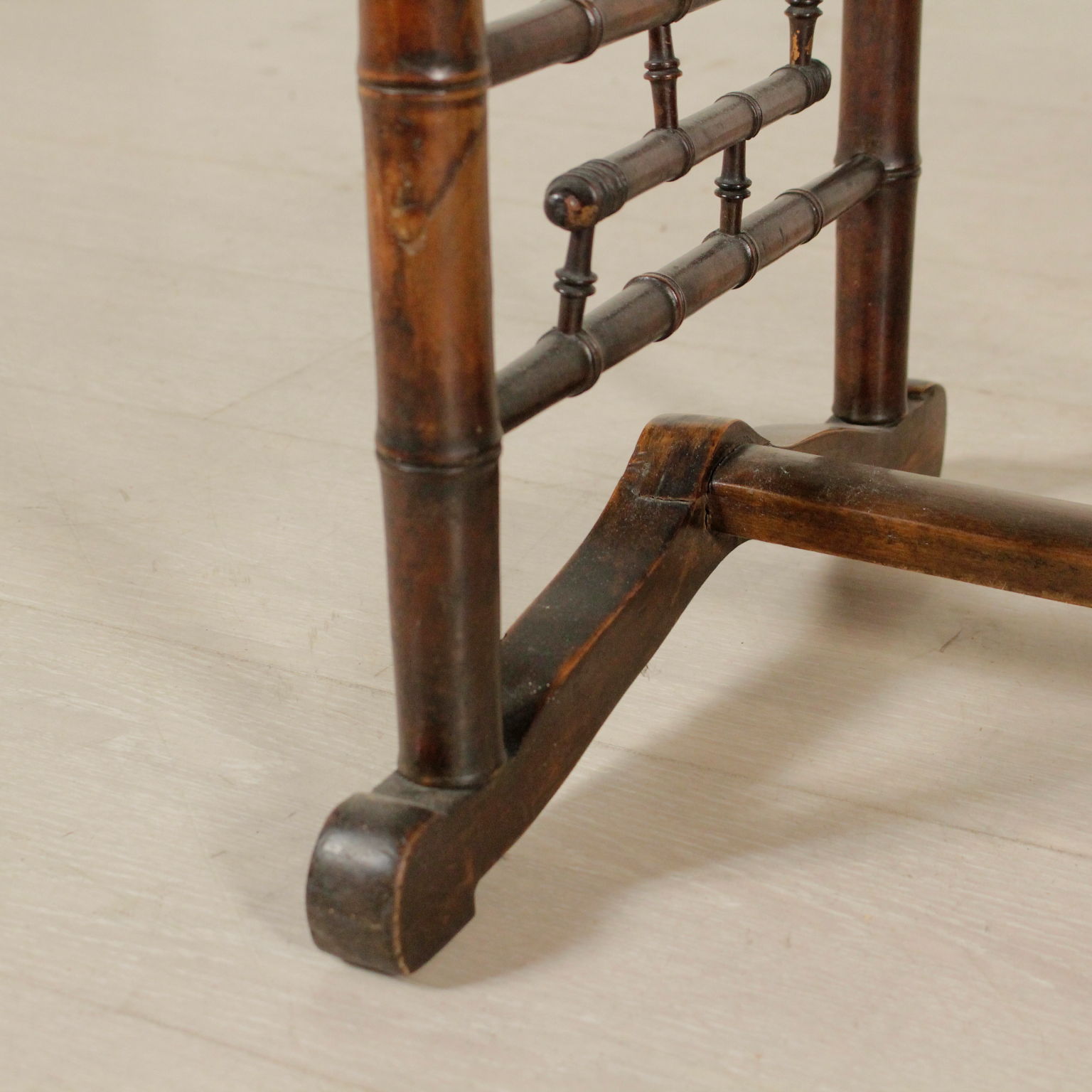 A coffee table, cherry wood. Carved legs and crossbeams, bamboo effect. Rectangular top. Manufactured in Italy, second half of the 19th century.
