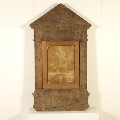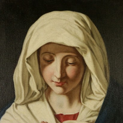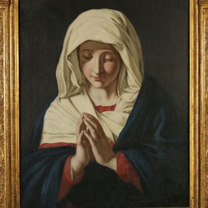 Oil on canvas. An impressive copy of the 'Madonna Orante' by Giovan Battista Salvi called 'Il Sassoferrato'. This painting has countless copies: one is held at the National Gallery in London, another version in the Accademia Carrara in Bergamo, one at the Pinacoteca del Castello Sforzesco in Milan and another in the museum of Todi. The high number of copies and reproductions made more recently, such as ours, proves the success that had (and still has) the image of the young Virgin in prayer. With an absorbed look and the face humbly lowered, she is depicted with elementary colors (white, red and blue) and with delicate shades on the face and the hands. The original versions was made by Guido Reni and it spread by Jean Baron's engraving of this painting, on which Sassoferrato based his composition. The painting, restored and relined, is presented in a frame with tympanum of the late 1800s, Renaissance style, carved and gilded with grotesque representations. The back of the frame is covered and partially reconstructed with antique wood (17th century).