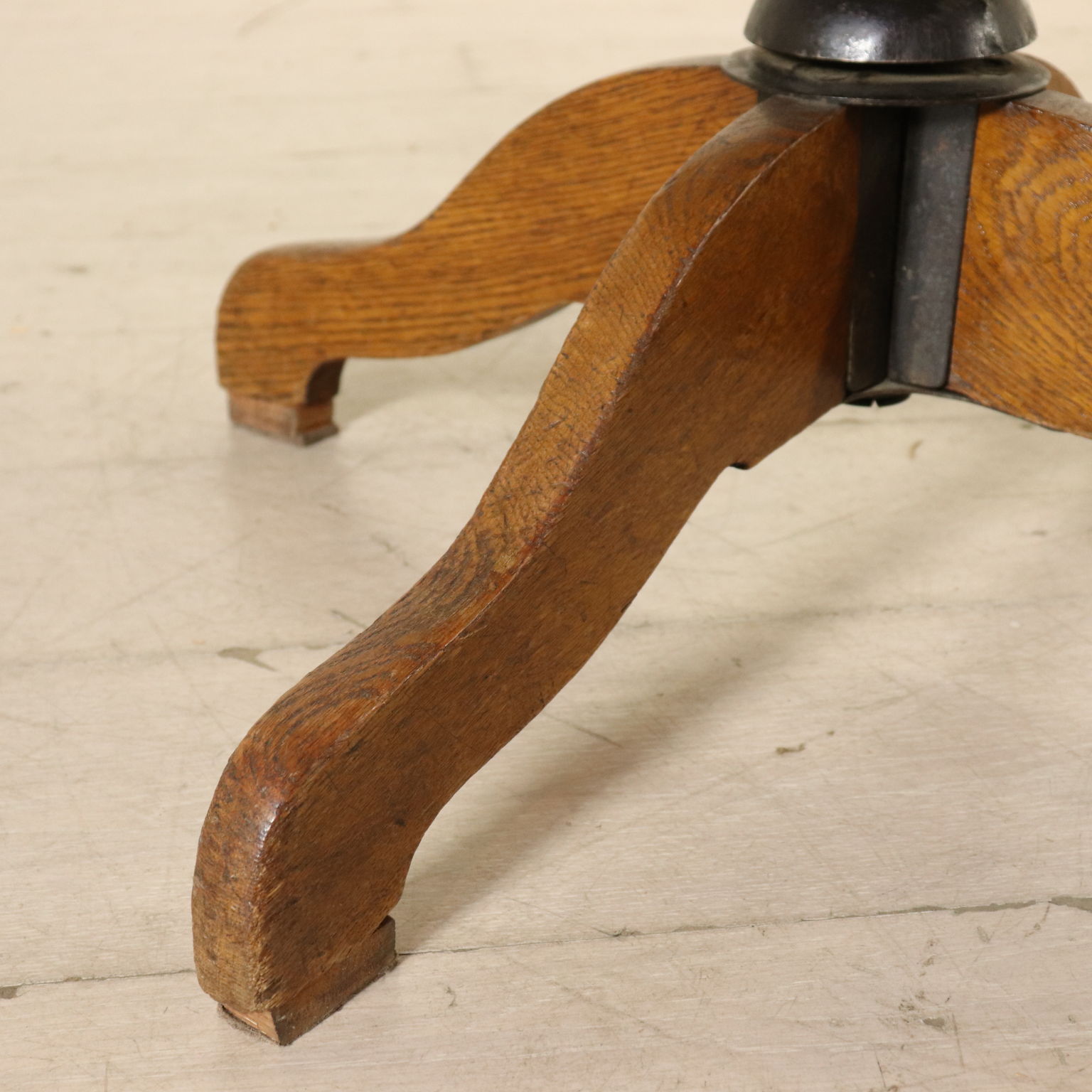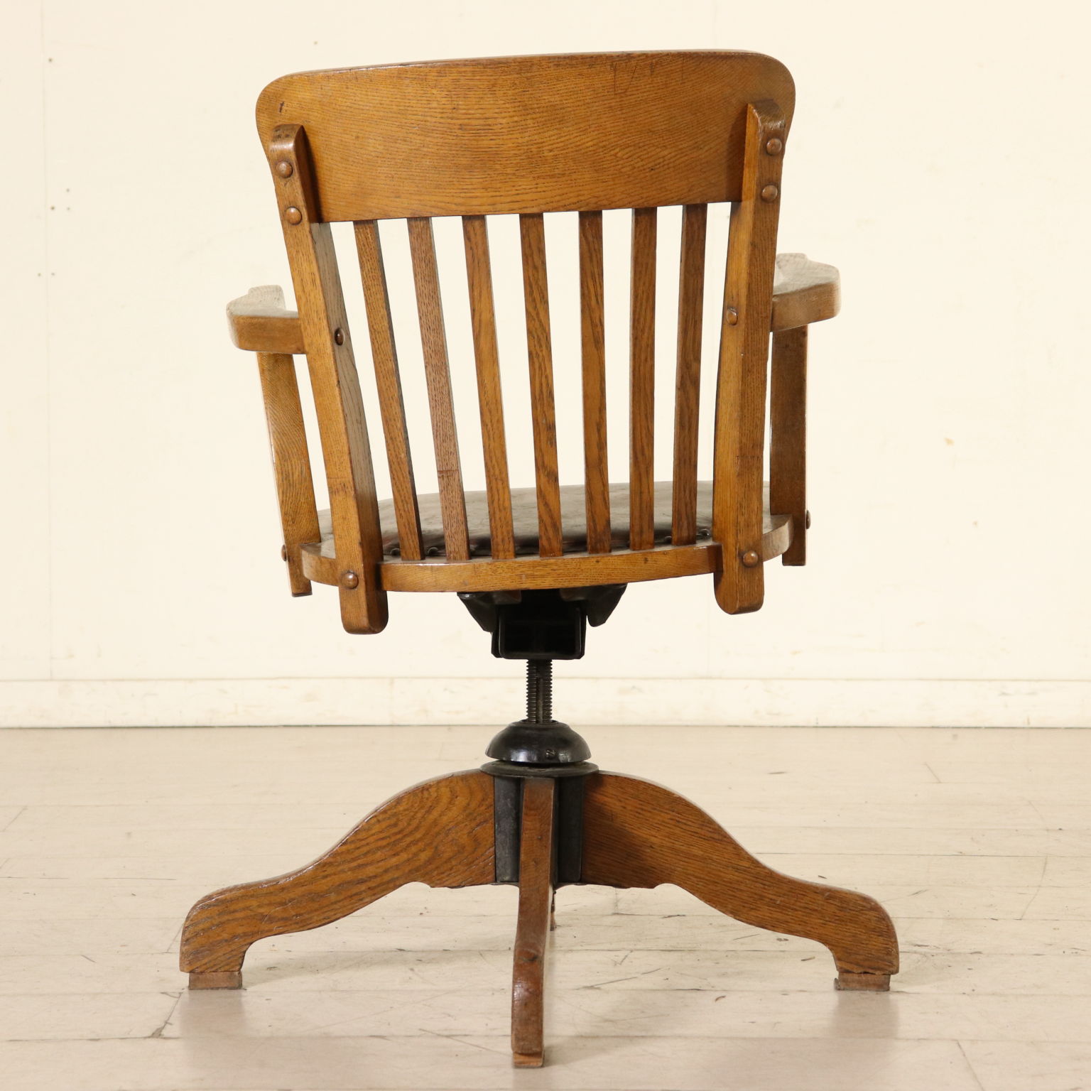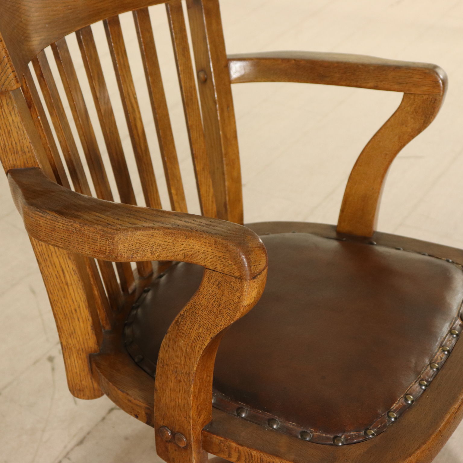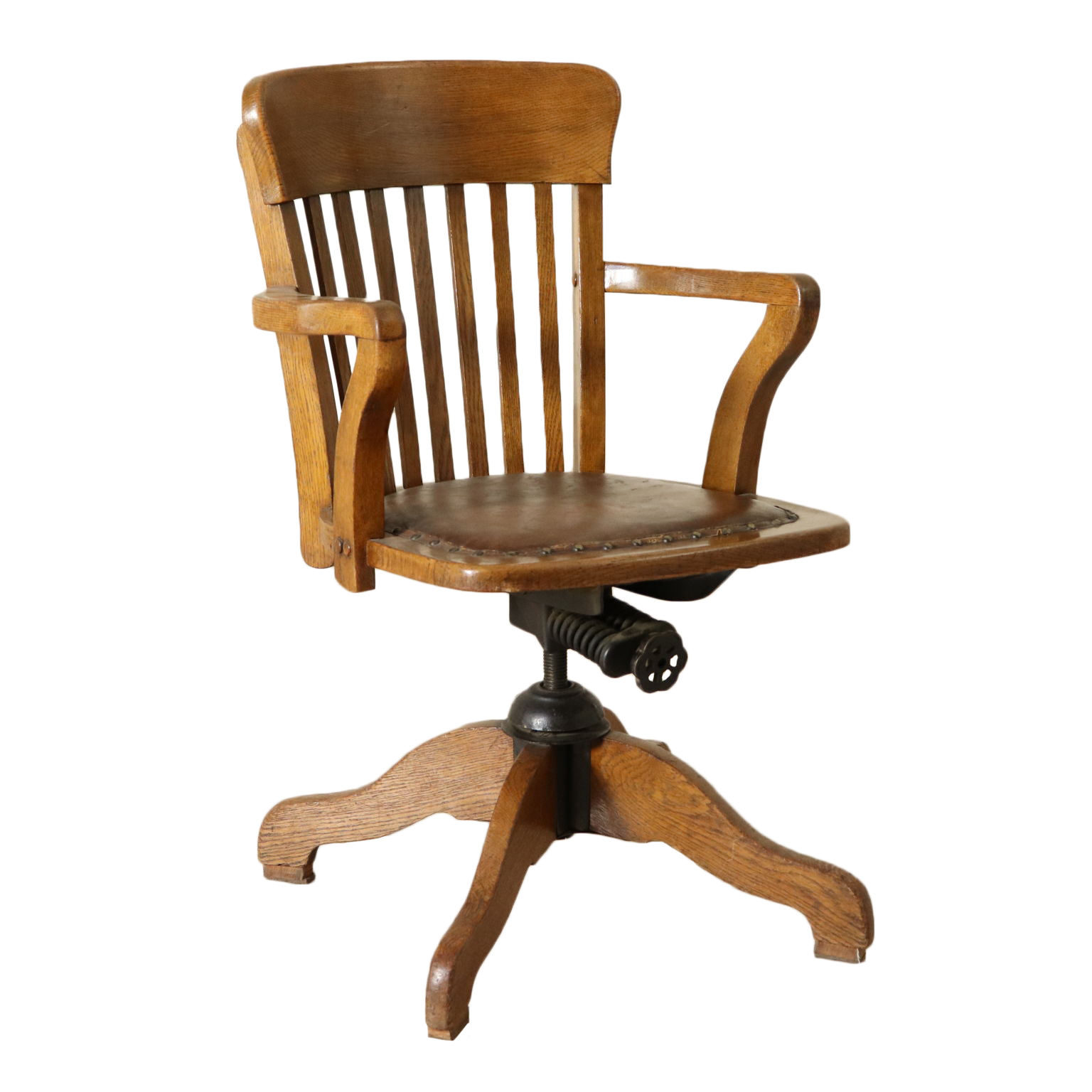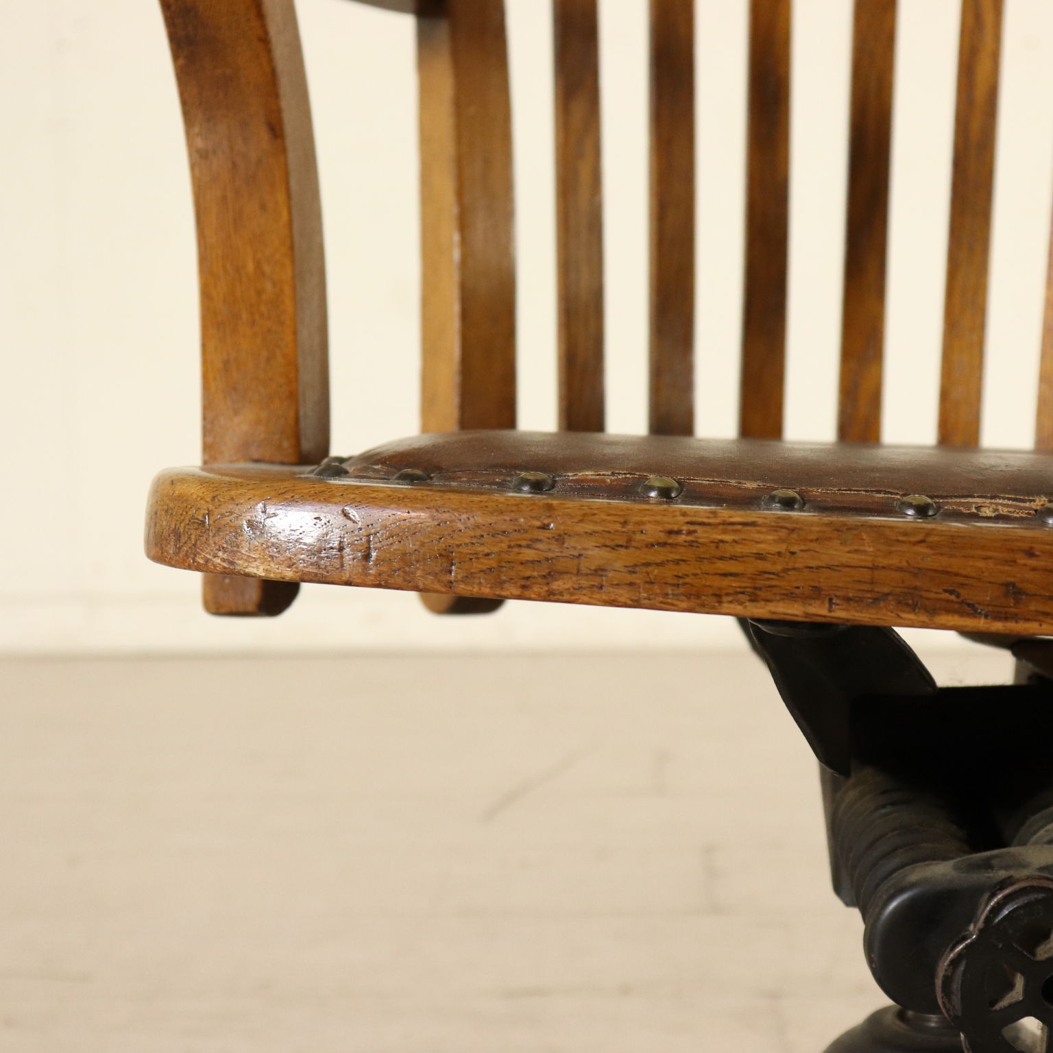 A swivel office armchair with adjustable mechanism. Leather seat and open back. Label with brand 'Made in England'. Manufactured in England, early 20th century.