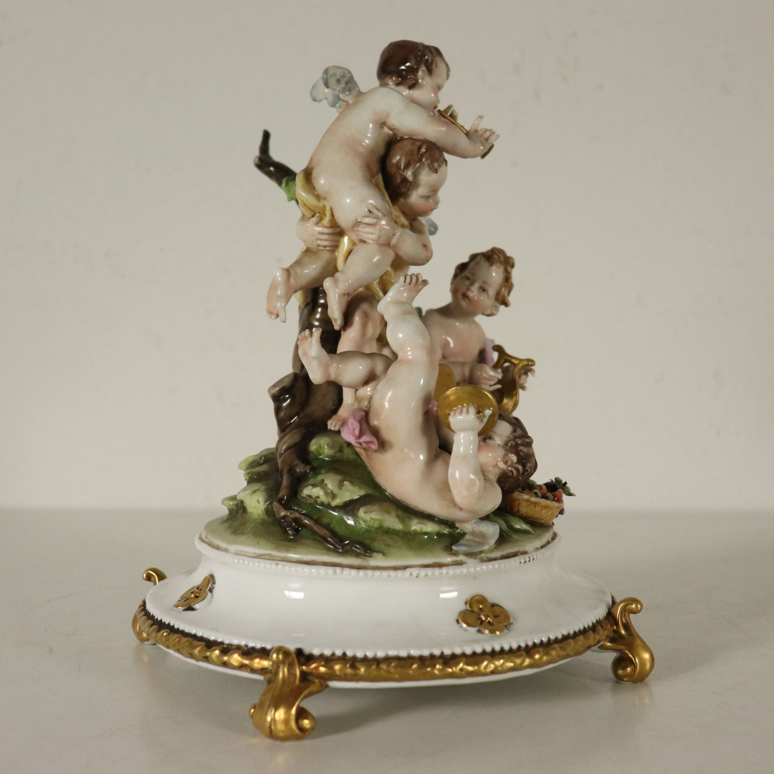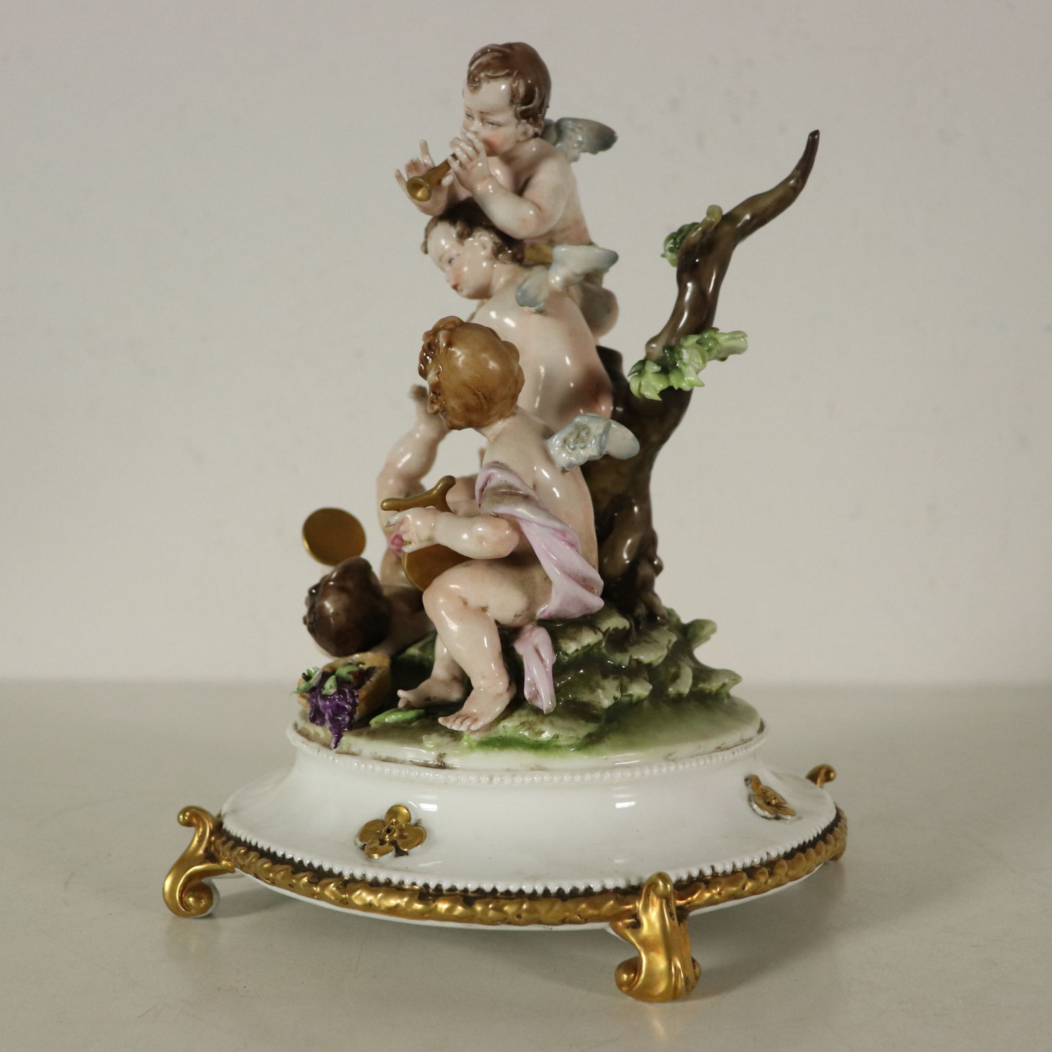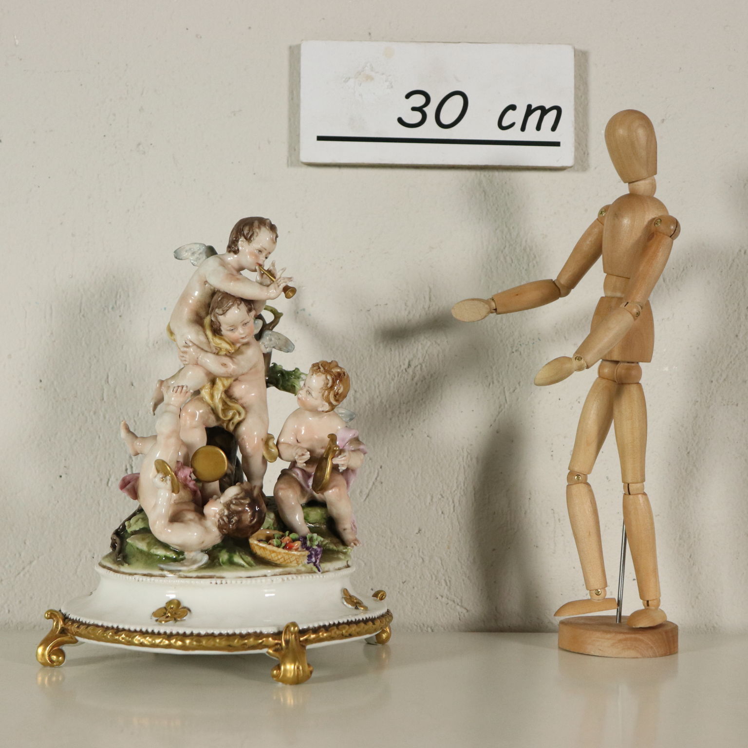 Ceramic sculpture on circular base with four cherubs playing instruments. Brand of the manufacture at the bottom. Capodimonte ceramic. Manufactured in Italy, 20th century.