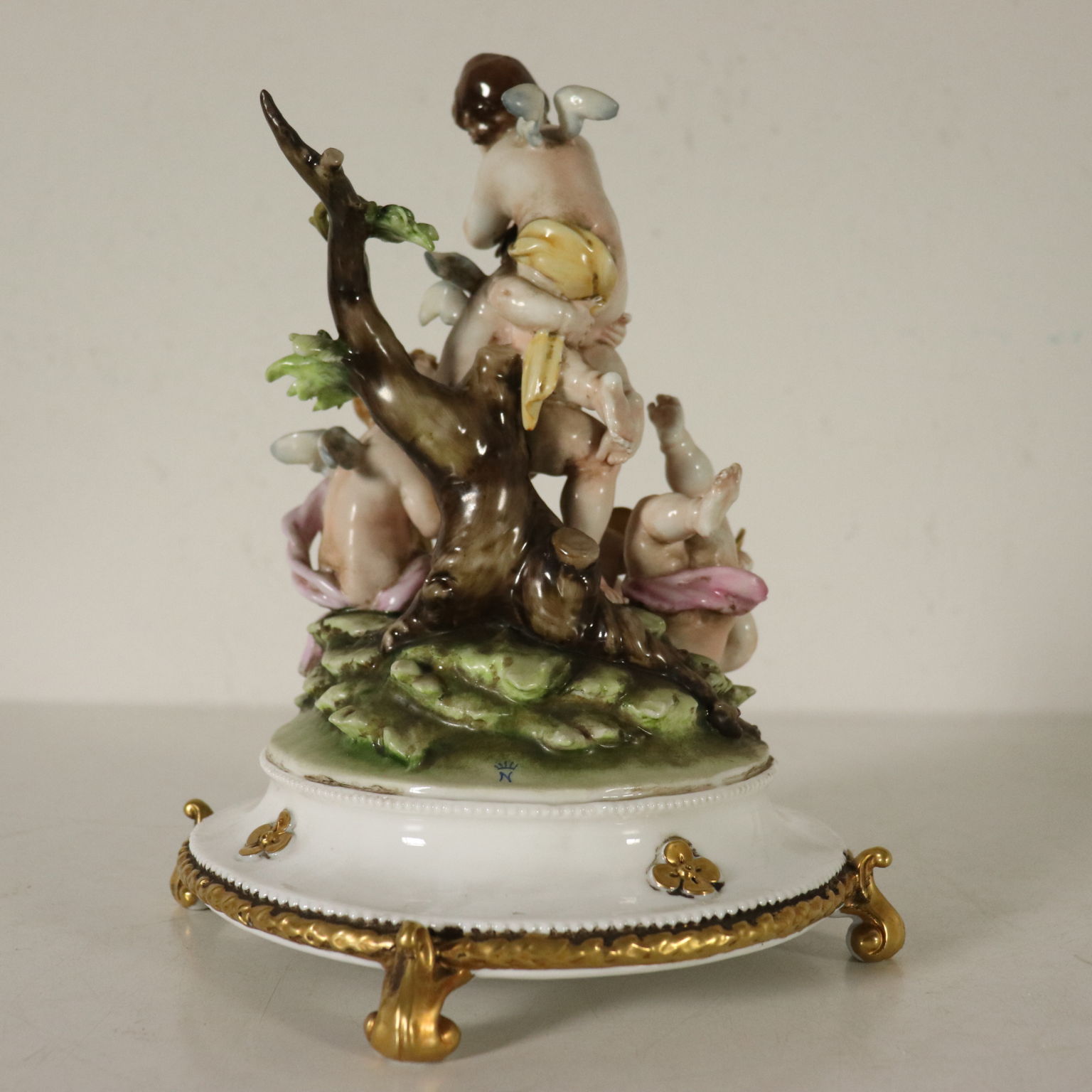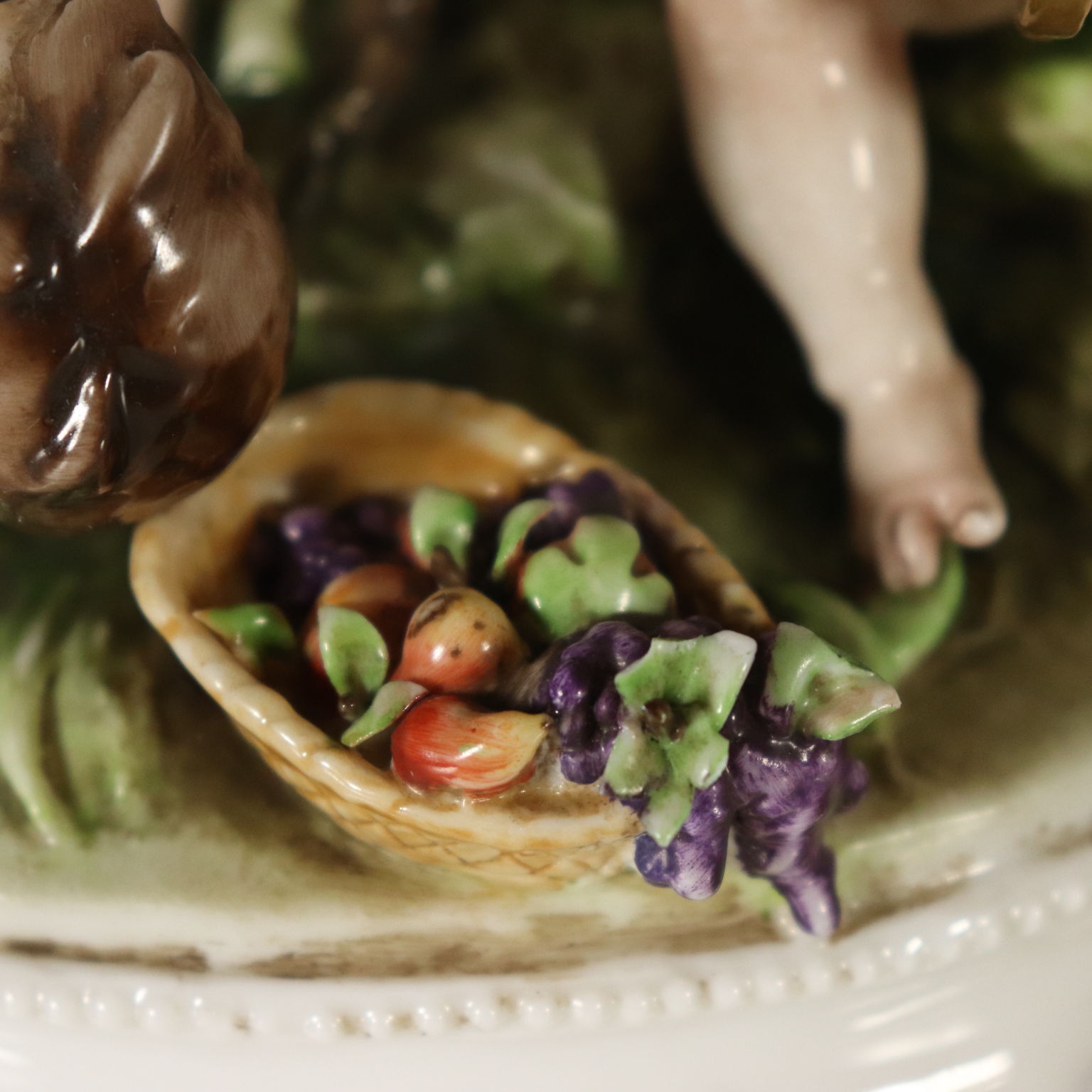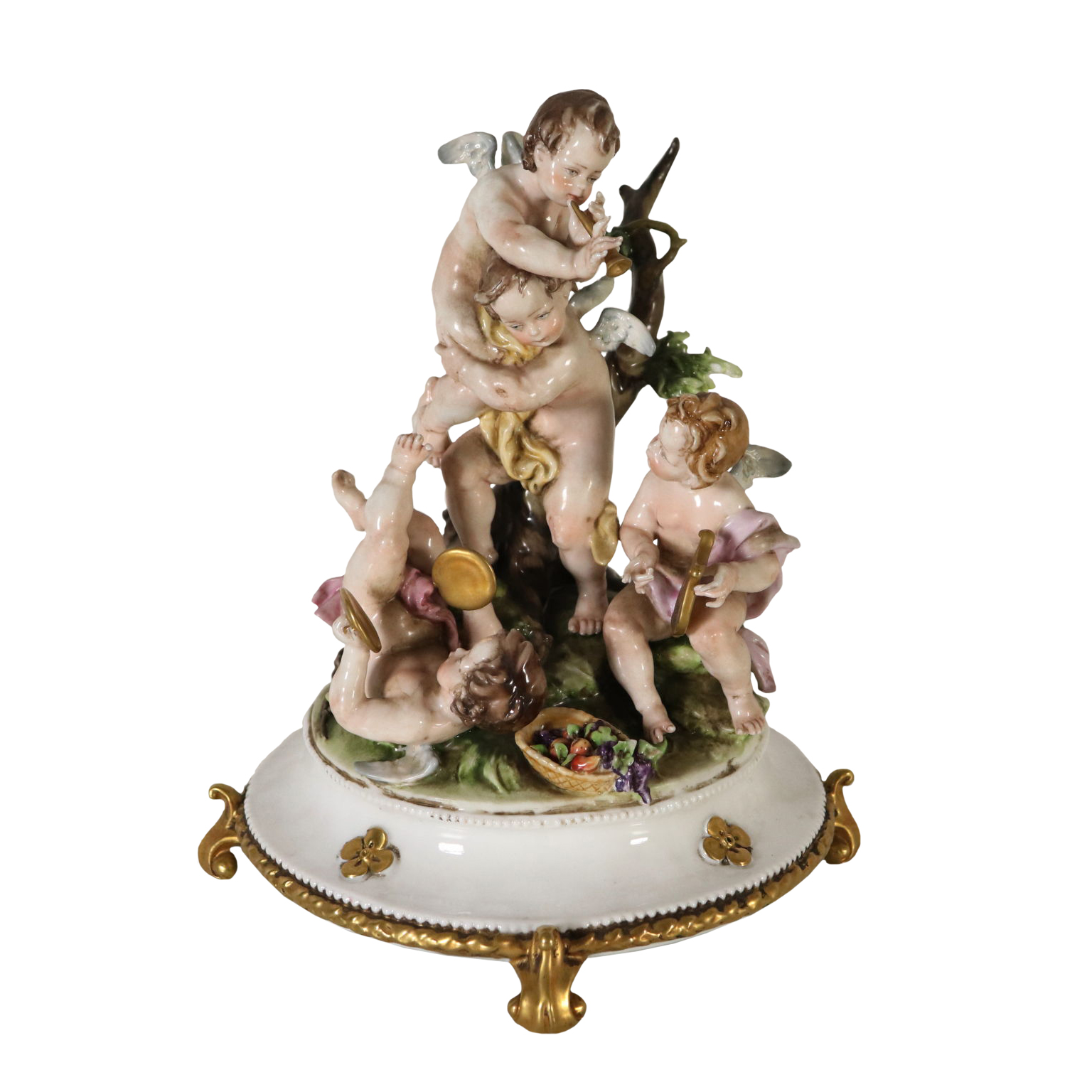 Ceramic sculpture on circular base with four cherubs playing instruments. Brand of the manufacture at the bottom. Capodimonte ceramic. Manufactured in Italy, 20th century.