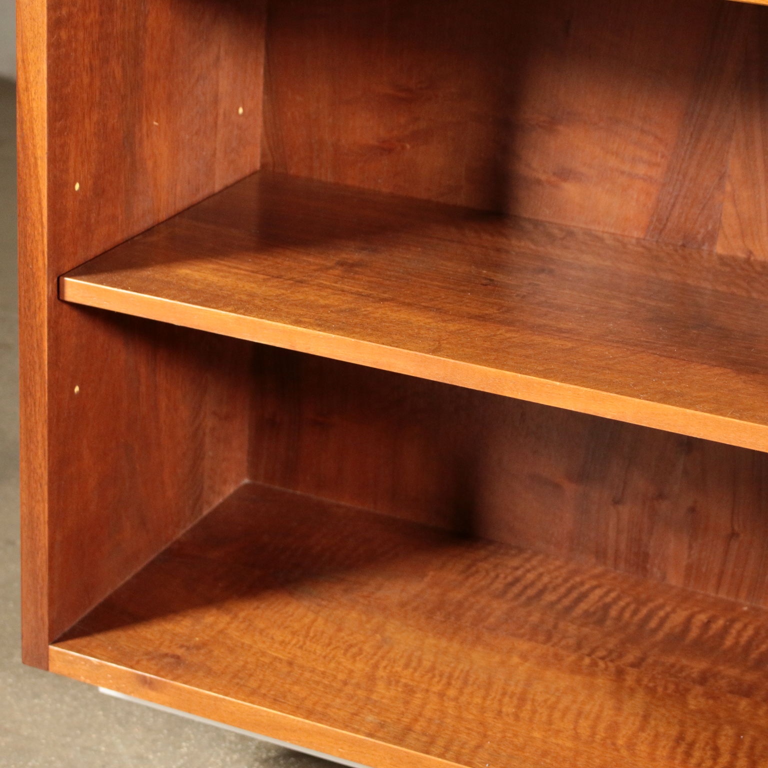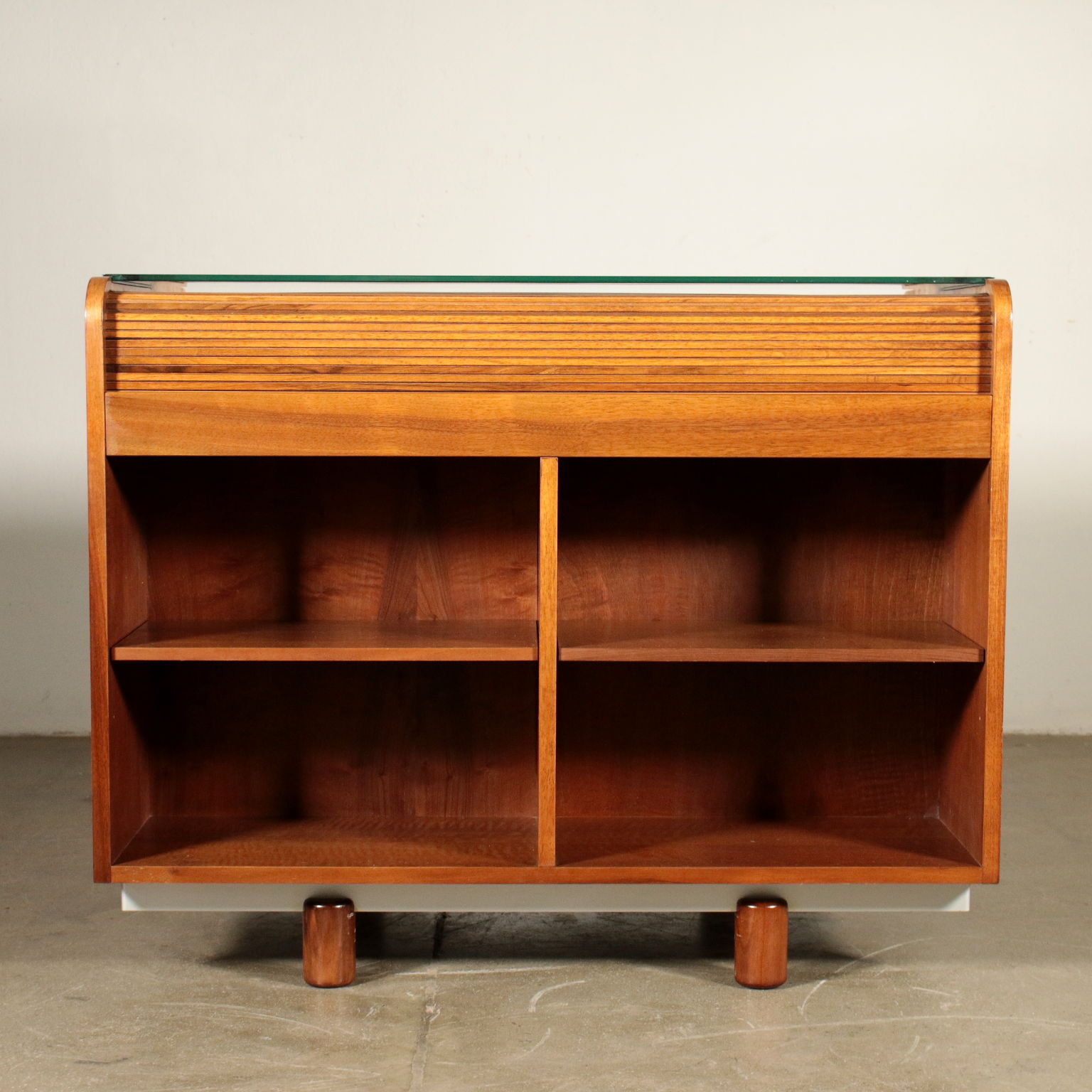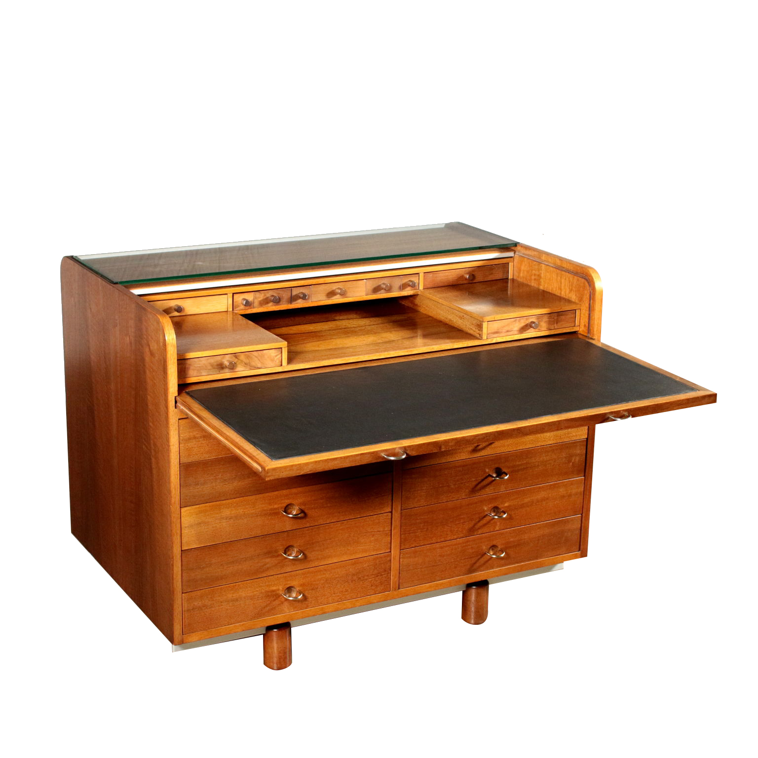 Writing desk with small shutter and pullout top designed by Gianfranco Frattini (1926-2004) for Bernini. Solid wood (front drawers with small shutter), walnut veneer. Glass shelf. Manufactured in Italy, 1960s.