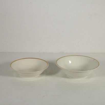 Set of Bavaria plates, white porcelain with gilded ornaments. Brand of the manufacture at the bottom. The set is composed of: a tureen, a gravy boat, 2 salad bowls, 6 serving plates, 24 dinner plates, 12 soup plates, 12 dessert plates. Manufactured in Germany, 20th century.