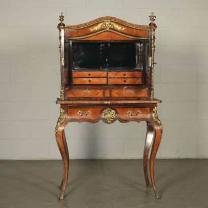 Writing desk Napoleon III supported by legs moves. Has a drawer pull pull-out with leather insert. The lift with a couple of small drawers lined and two doors with shaped concealed inside four small drawers and compartment with mirror. Reserves in bois de rose, enriched friezes and cornices in bronze.