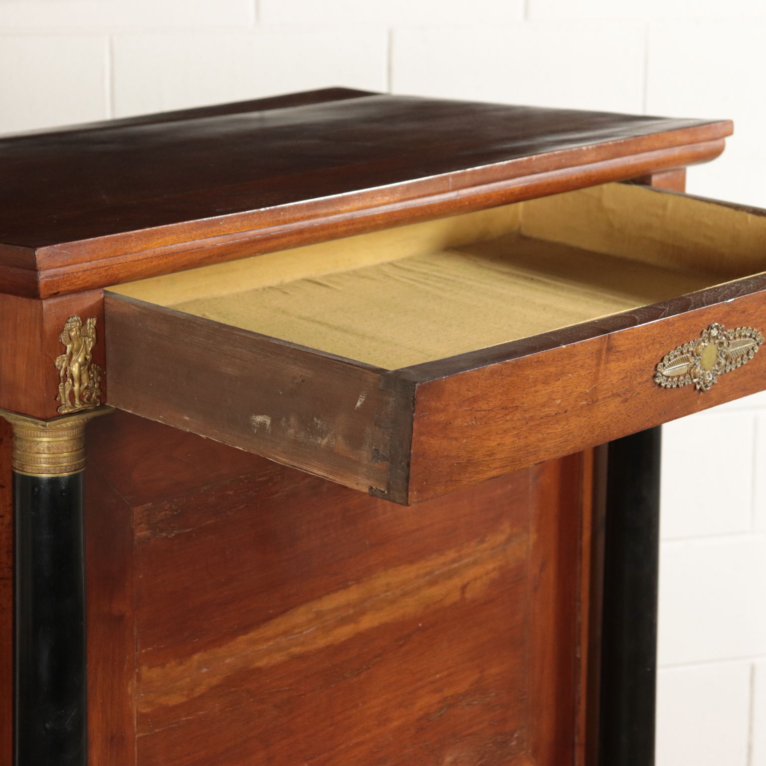 Empire style desk with three drawers and flap doors. Missing shrine inside. One drawer underneath the counter. Pillars made with ebonised columns. Bronze hardwear.