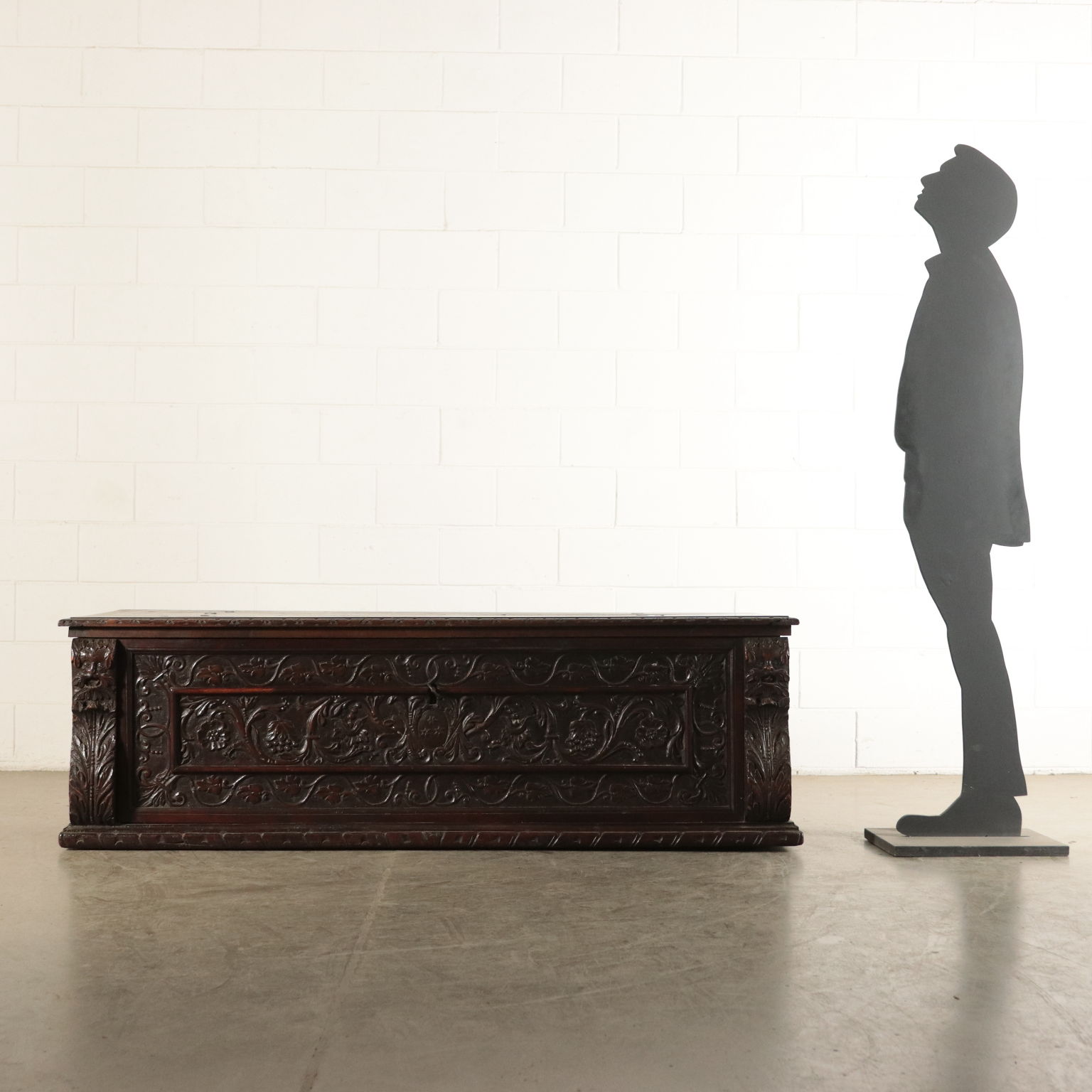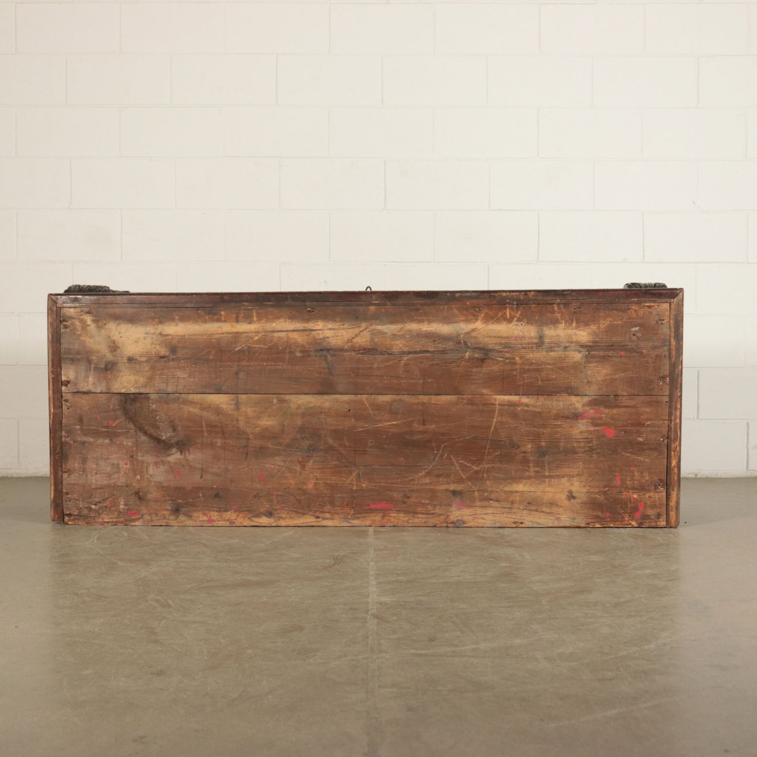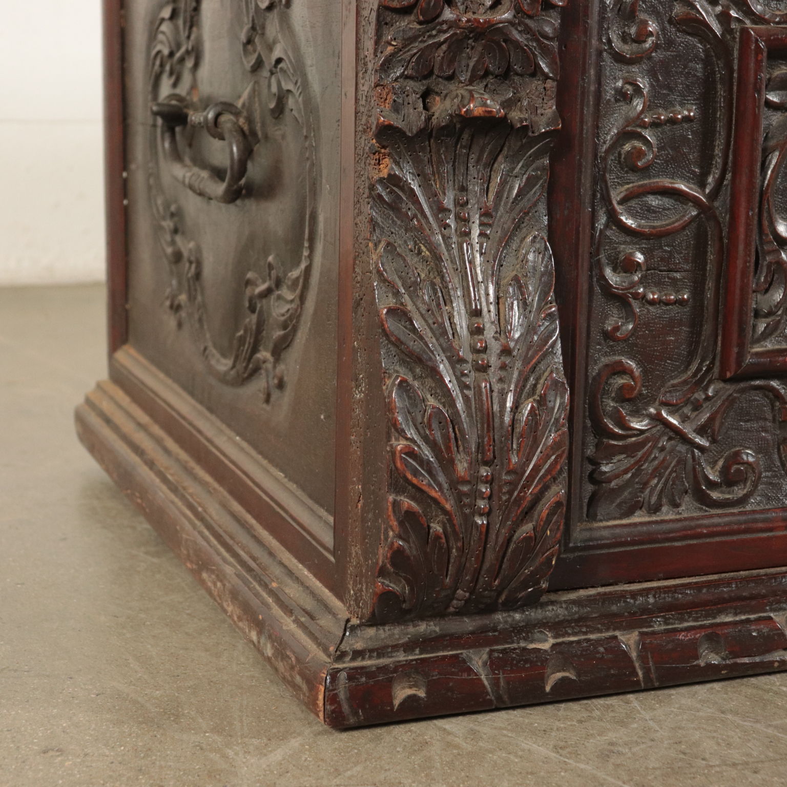 Mannerist chest supported by "becellatura"; finely carved front. Sides with iron handlesr. Countertop replaced later with carved pillars.