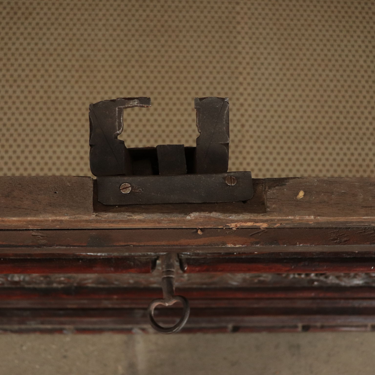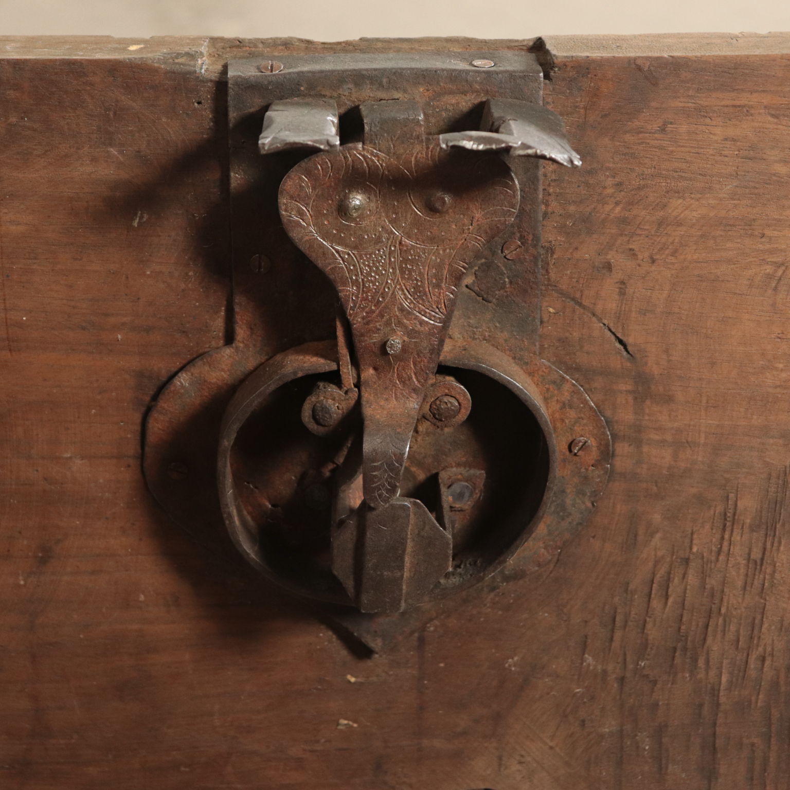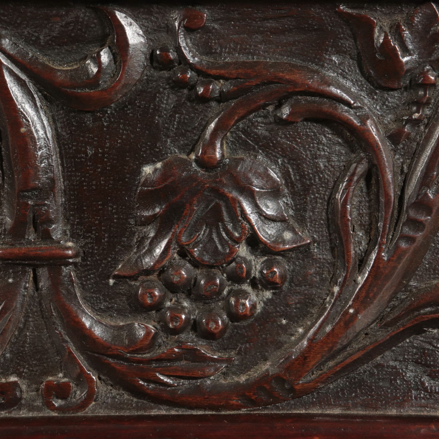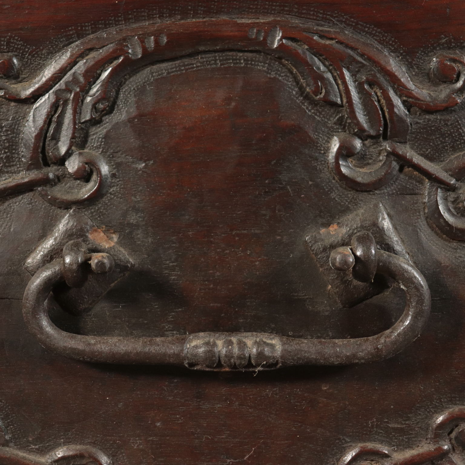 Mannerist chest supported by "becellatura"; finely carved front. Sides with iron handlesr. Countertop replaced later with carved pillars.