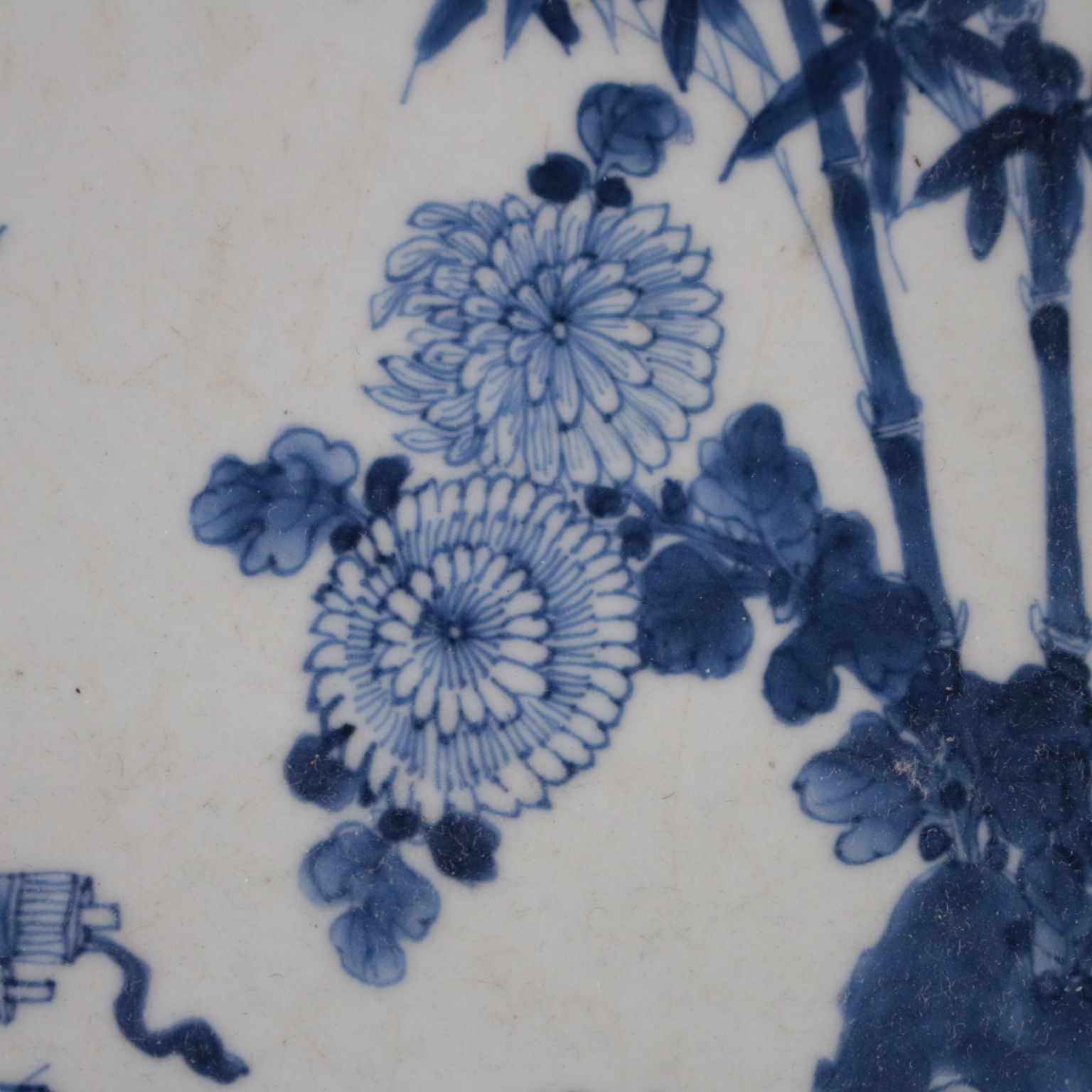 Ceramic plate painted blue and decorated in the central part with a vase full of flowers on top of a small table placed next to a decorative rock with flowers and plants. Greek decorations and flowery patterns all around the edge.