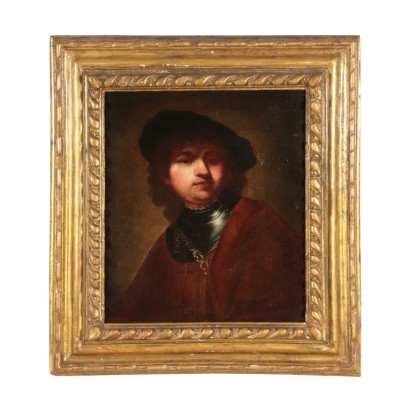 Oil on canvas. Copy of the famous self-portrait made by Rembrandt in 1633-34 today preserved at the Uffizi Gallery in Florence. The dimentions of this painting match the ones of the original that measures 62.5x54 cm. Between the eighty self-portraits that the famous Flemich painter made, this one was realized in amsterdam at the age of 28: the artist is wearing a rich brown velvet dress embellished with an heavy chain; he's waring a slouchy hat over his blond curls. The copy in question, already restored and repaired, comes along with a coeval frame.