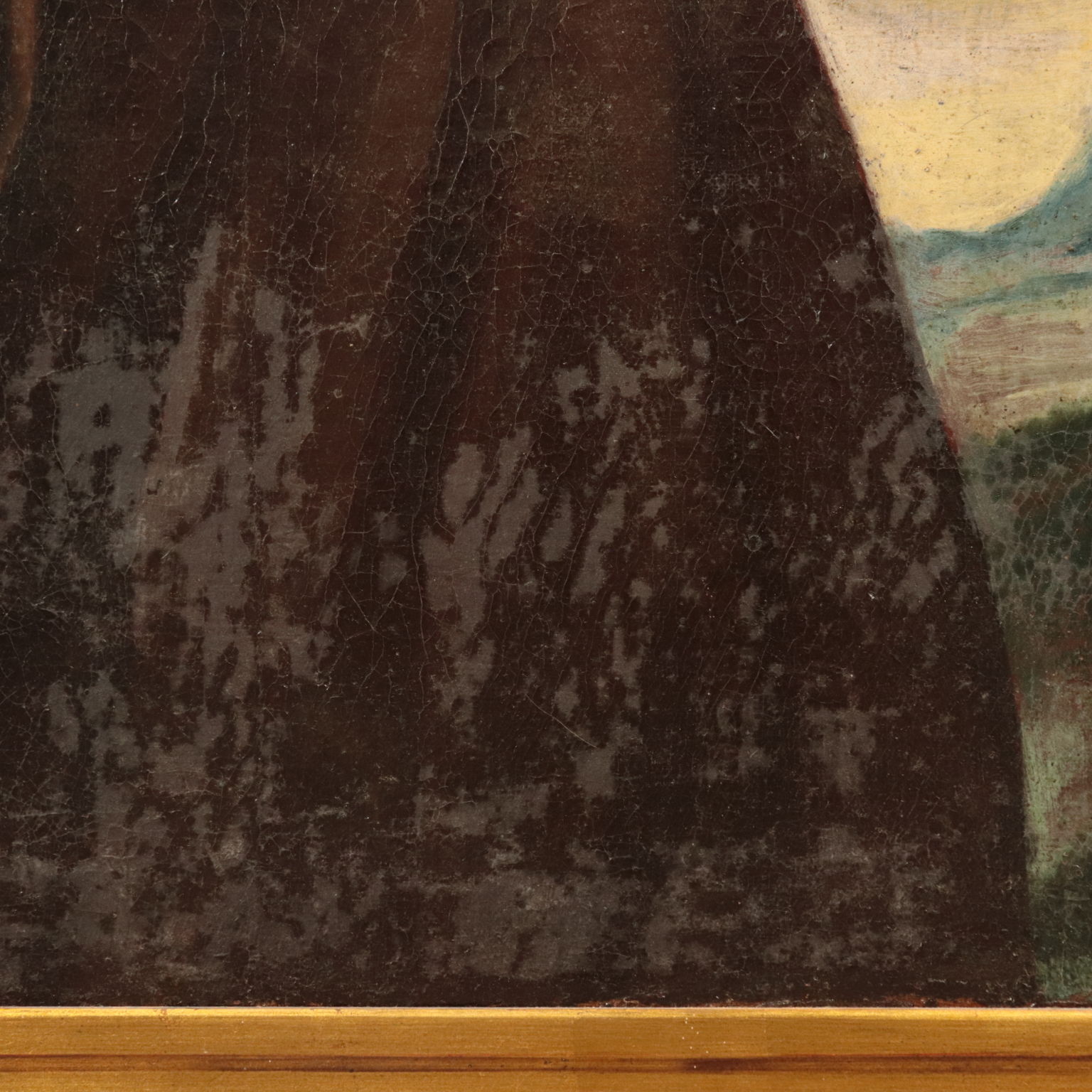 Oil on canvas. Center-Italian School. The Saitn from Assisi is represented while contemplating the Crucifix as he was traditionally portraited, itinerant in the Umbrian countryside. The painting had already been restored but need to be clean. Displayed in an ancient frame.