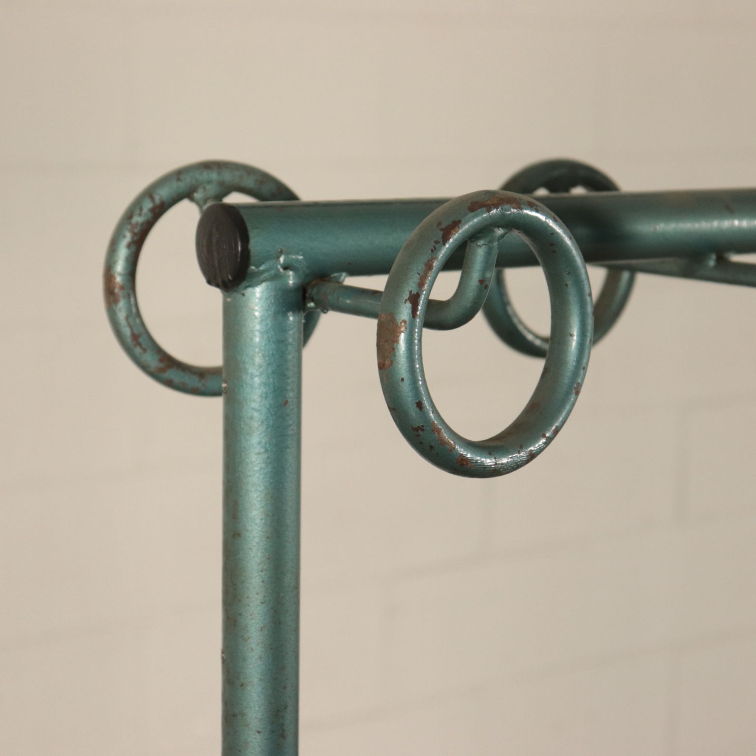 Double row gym locker room bench, metal and wood. Coat rack in wrought metal.