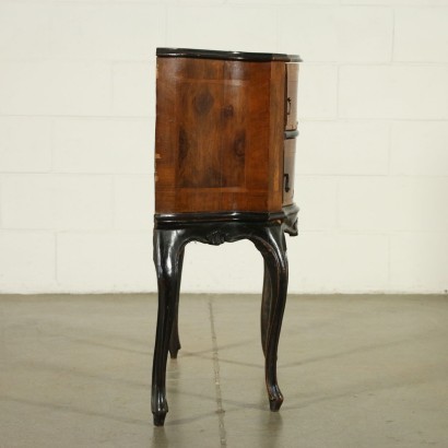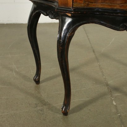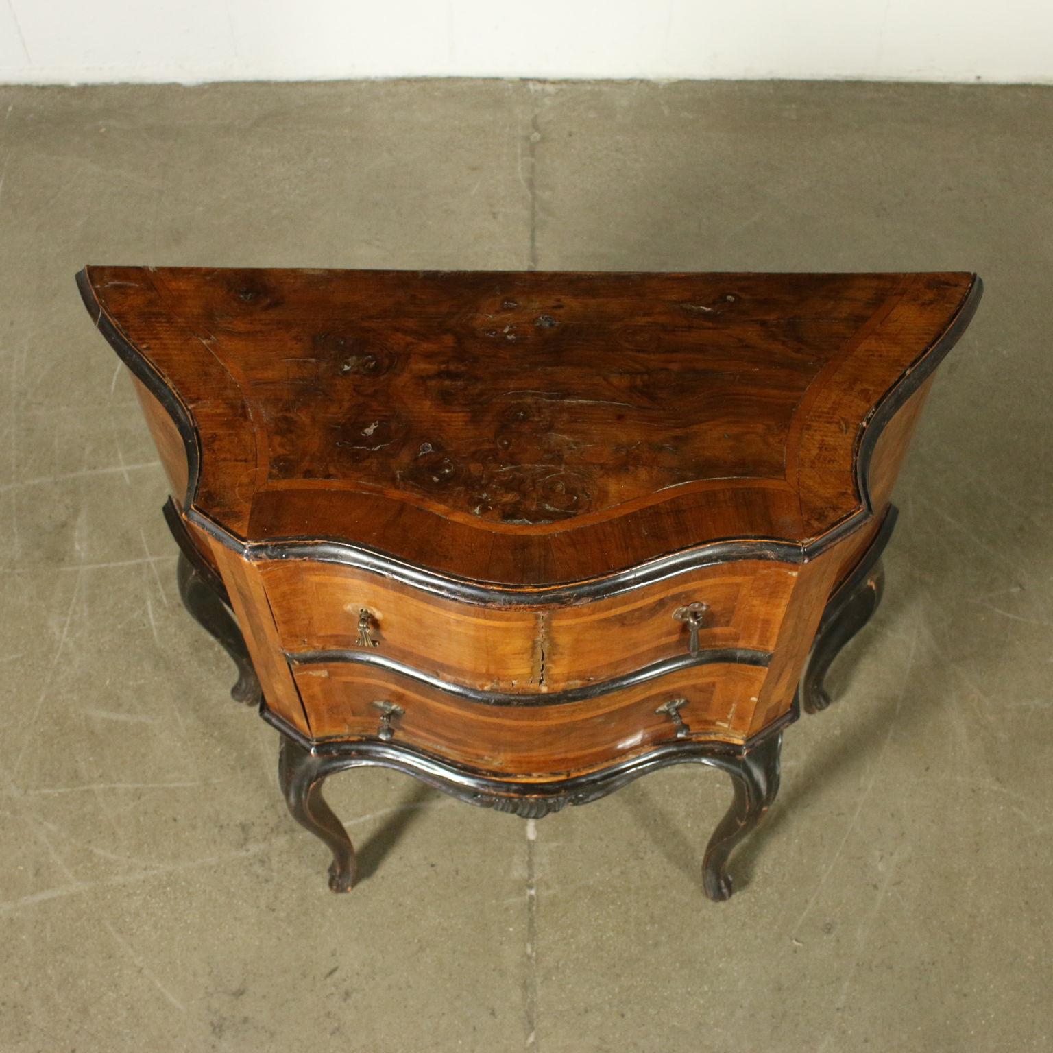 Supported by 4 ebonized curved legs; two frontal drawers; moulded top.