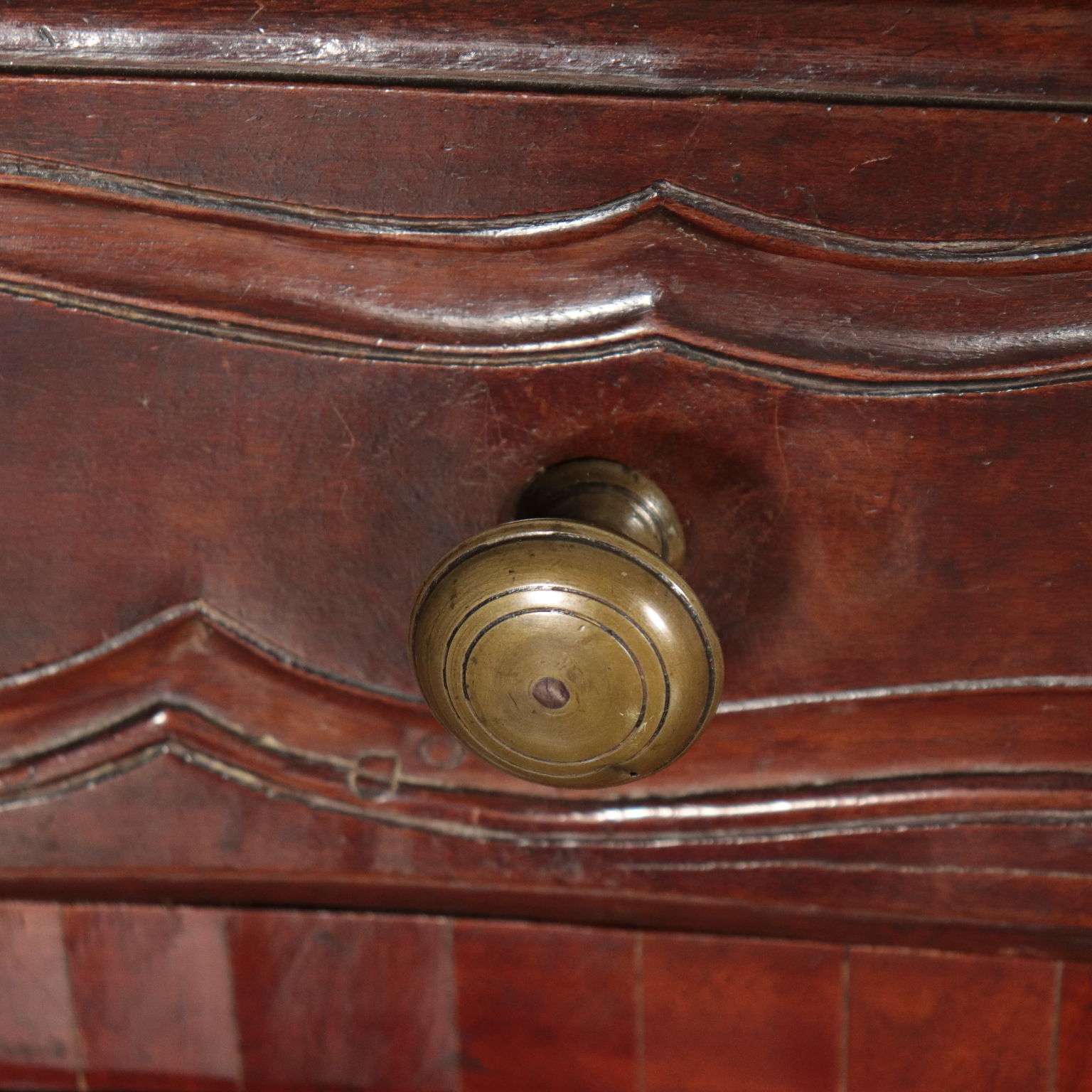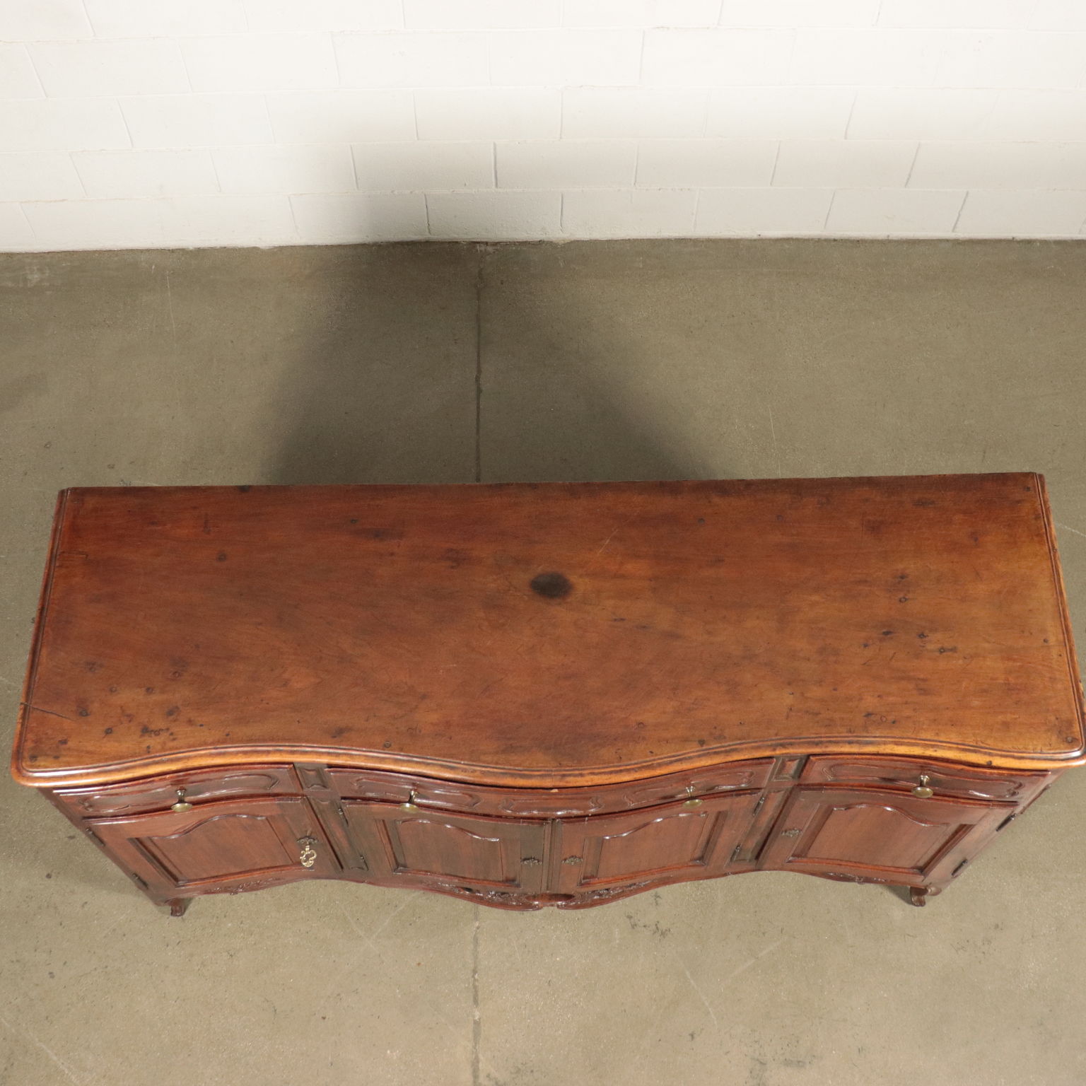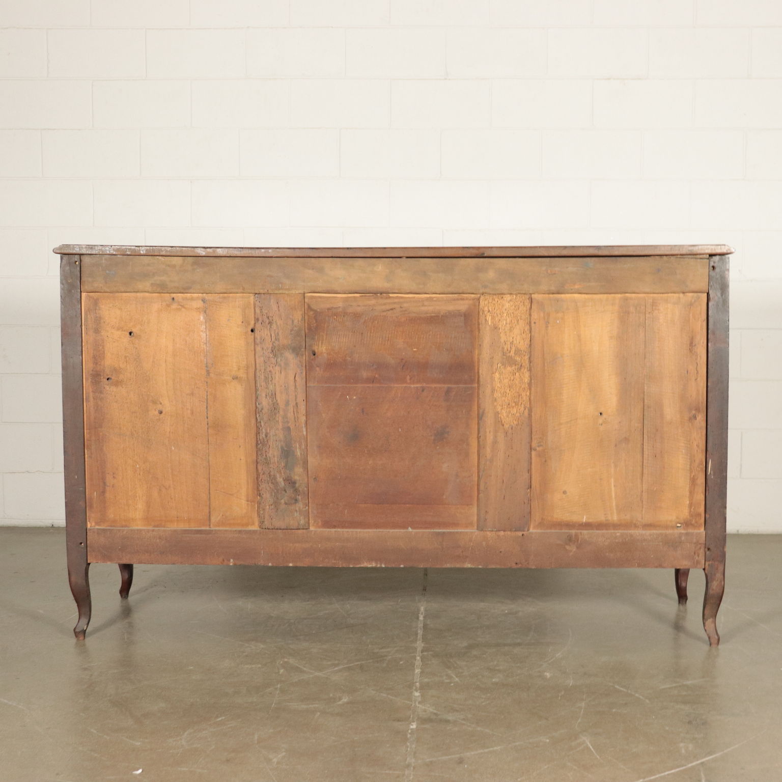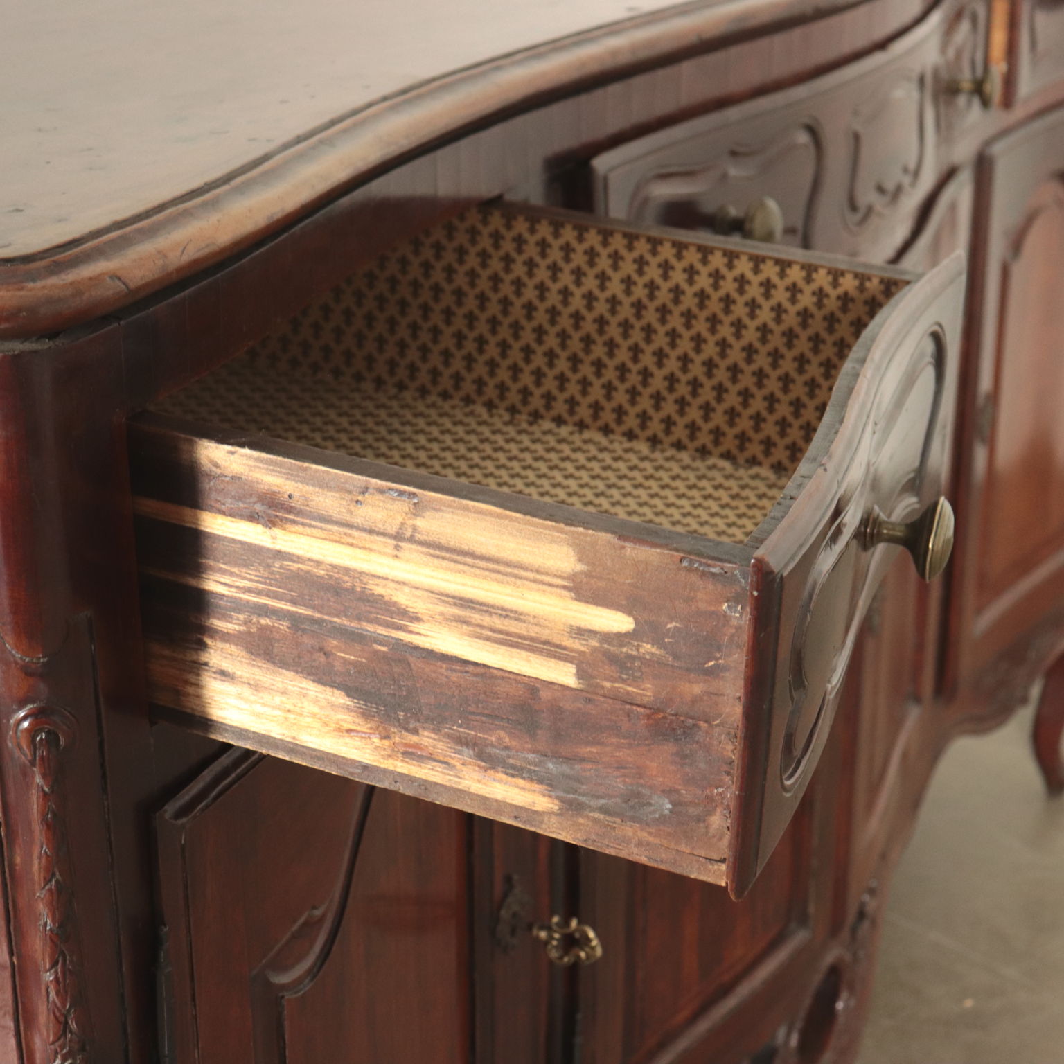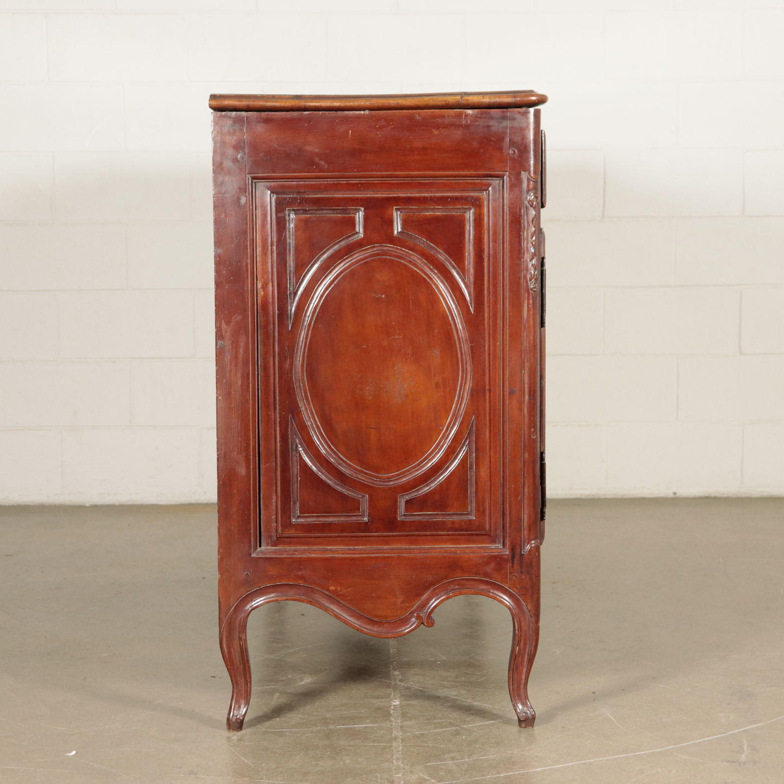 Supported by curvel feet; 4 frontal paneled doors decorated with engraved frames, same decoration as the ones on drawers undertop; even the sides are embellished with engraved oval frames. The lower apron is engraved and perfored with a central laurel crown from which depart a plant motif. Made recicling ancient pieces.