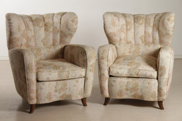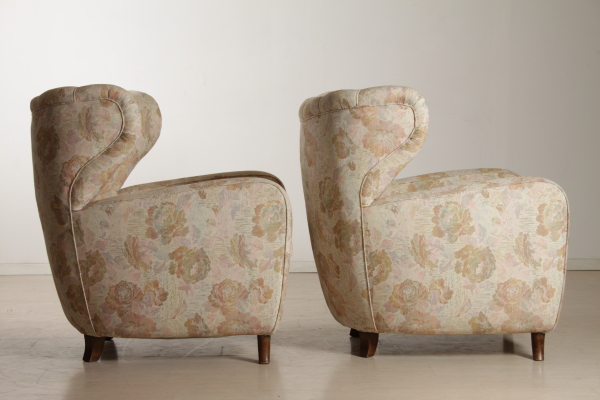 Pair of armchairs with soft horsehair padding, seat cushion in feather, non original fabric lining. Wooden feet.