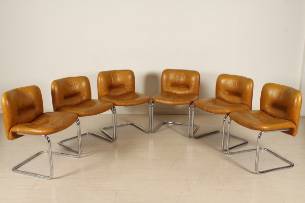 Group of six chairs with structure in chromed metal. Seat and back upholstered and covered with leather.