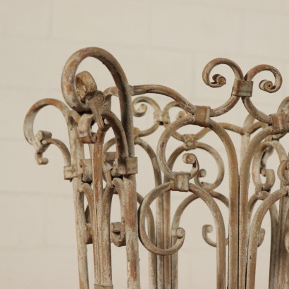 Portaombrelli in ferro battuto, sostenuto da quattro piedini e ornato con riccioli e volute fitomorfe.