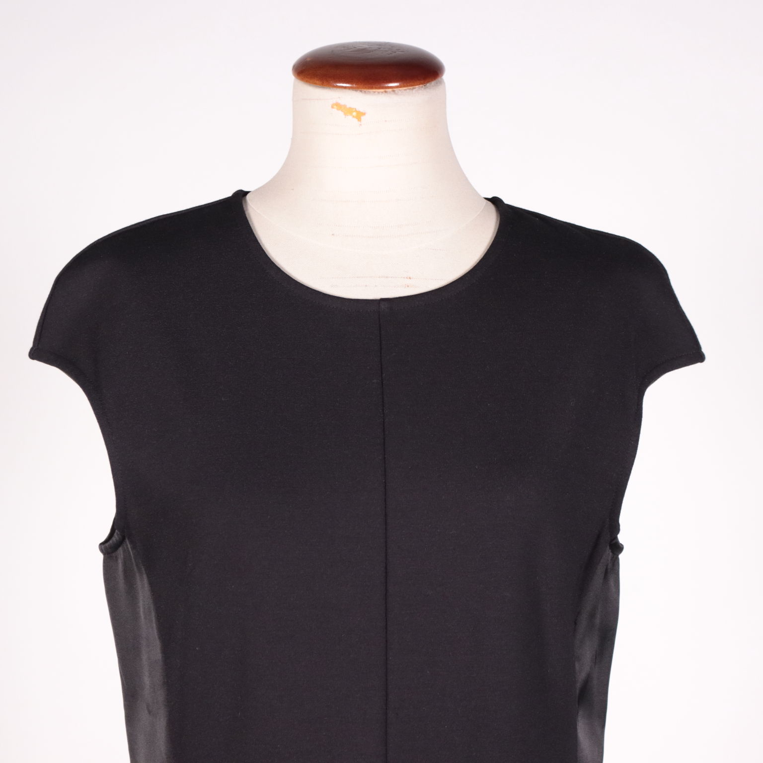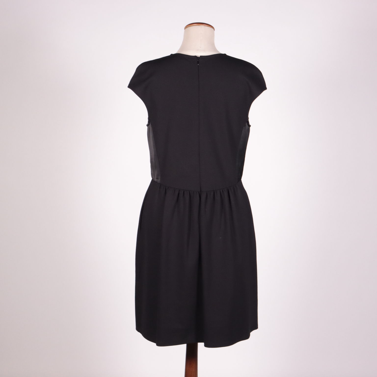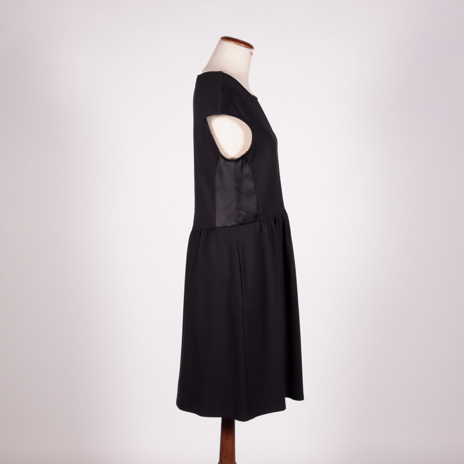 Cocktail dress in black jersey with crewneck with cap sleeves. The dress, with gathering on the waist, it has two satin inserts on the sides and two practical pockets in the skirt. Lenght: 87cm Waist: 78cm