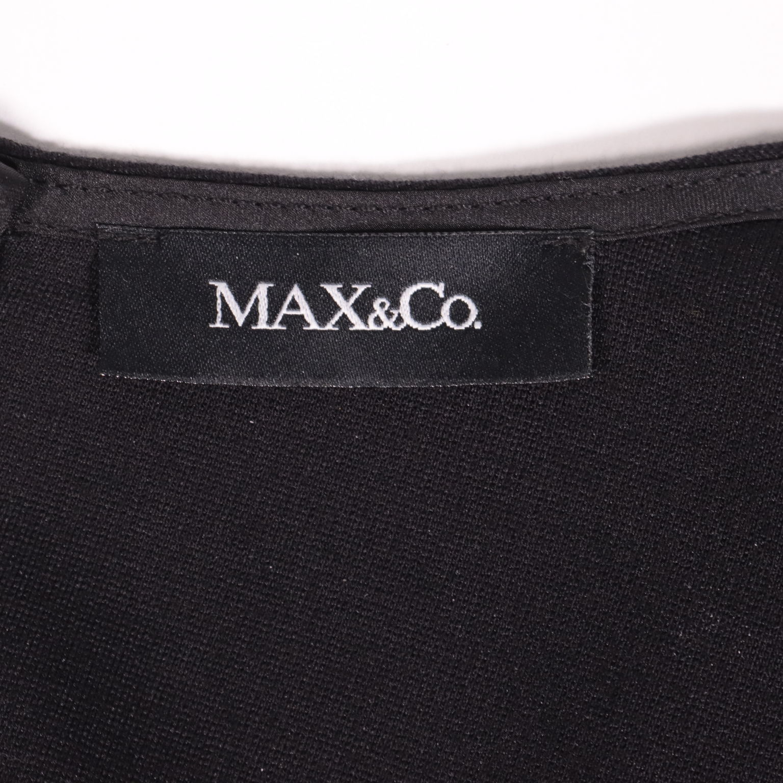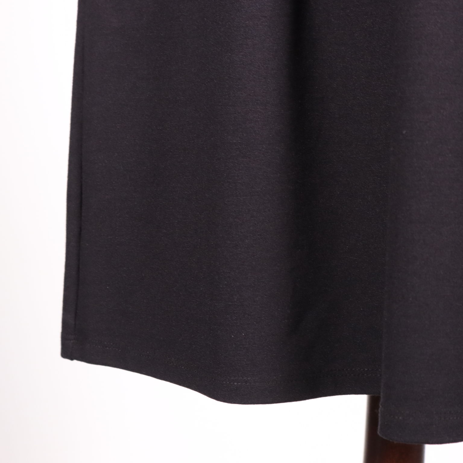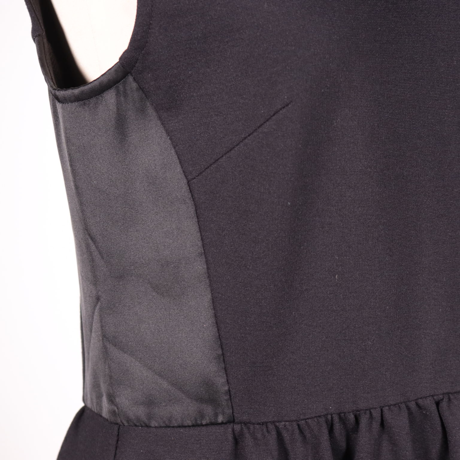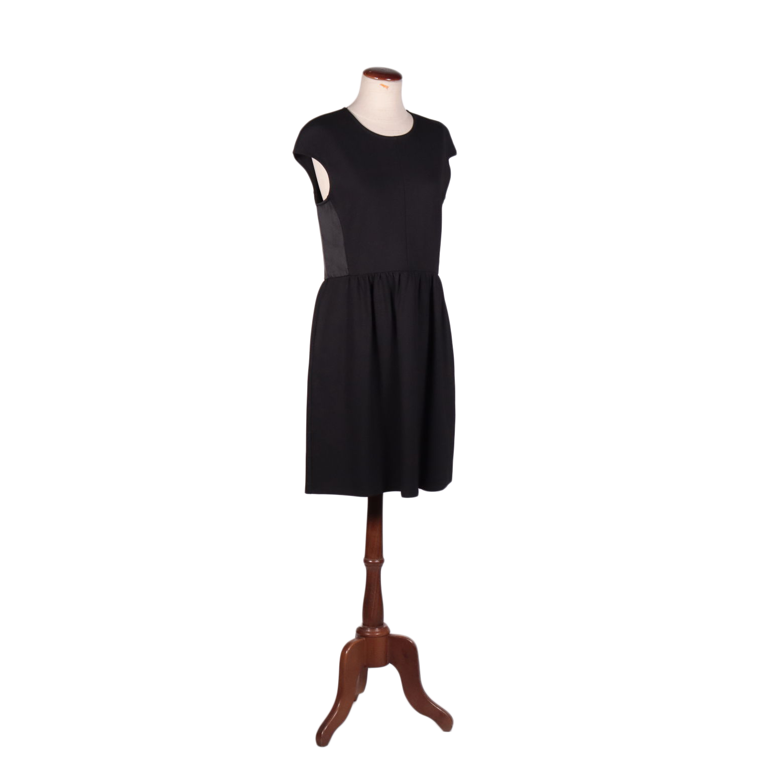 Cocktail dress in black jersey with crewneck with cap sleeves. The dress, with gathering on the waist, it has two satin inserts on the sides and two practical pockets in the skirt. Lenght: 87cm Waist: 78cm