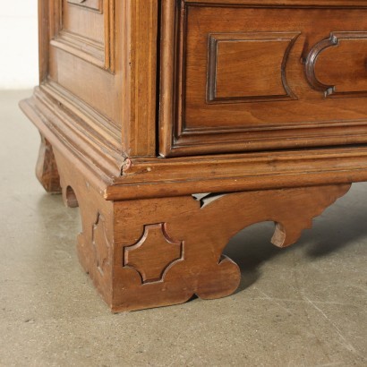 Chest of drawers dated back to the beginning of 18th century; it is supported by shelf-shaped feet that are engraved with tiles; it has 3 drawers on which are carved concave and convex tiles and frames. In the undertop band there is a small drawer that is decorated with shelf motif that continues also along the sides. The sides are paneled and decorated with engraved tiles. Walnut.