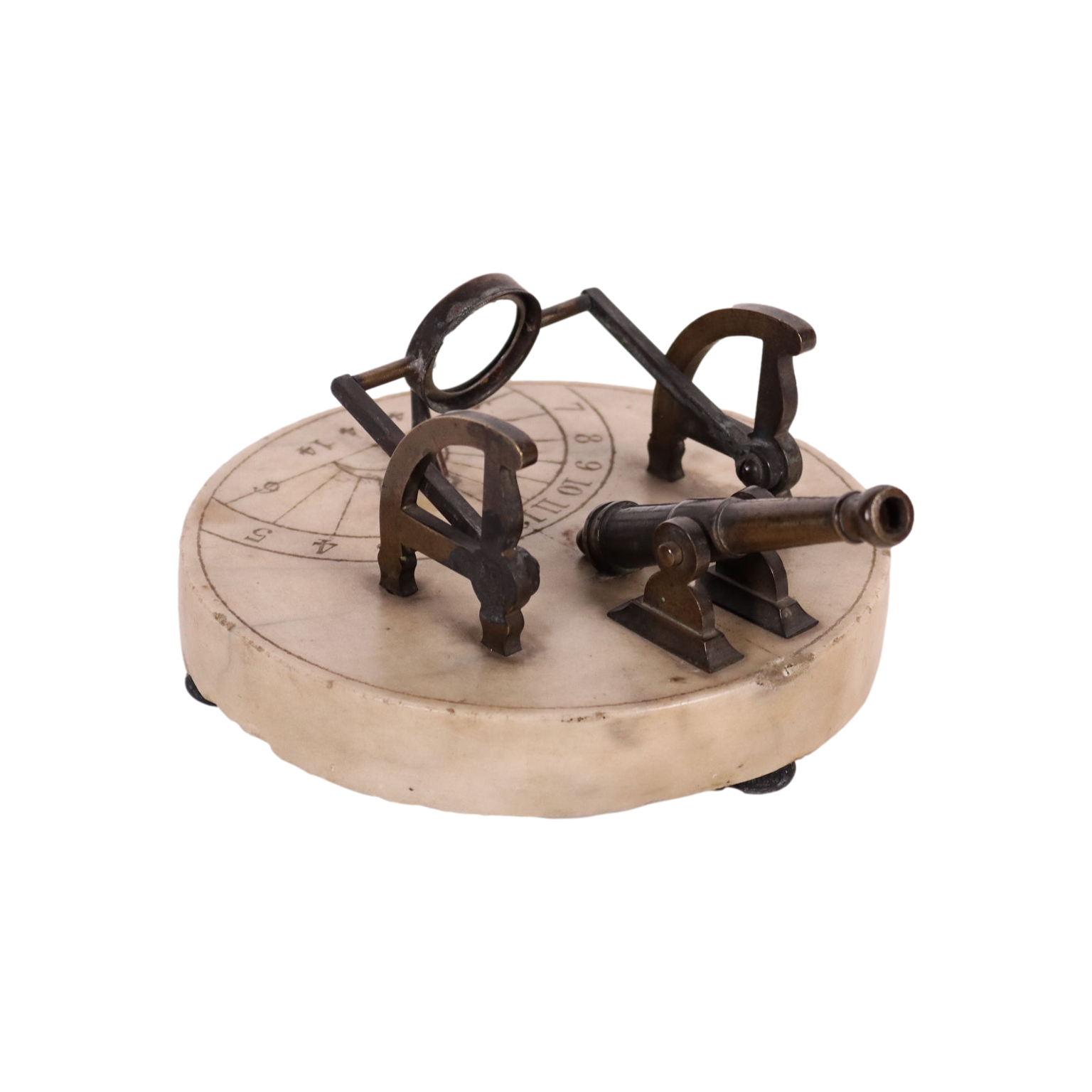 Sundial cannon resting on a circular marble slab on which the hours are engraved, including a central gnomon. There is a brass cannon and a magnifying glass supported by two tilting arms. The cannon used to be filled with gunpowder, which was ignited at noon, with sunlight passing through the magnifying glass; for this reason it is also called the "midday cannon ".