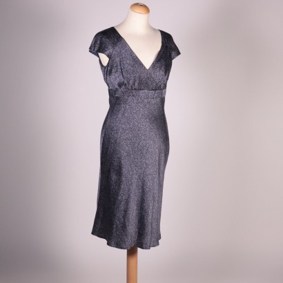 Baby blue pure silk dress with white dotted leaf print. The dress, with a crossed V-neck, has a cut, with a band, under the bust. The short mannequin is barely hinted at. The lining of the dress is also in pure silk.