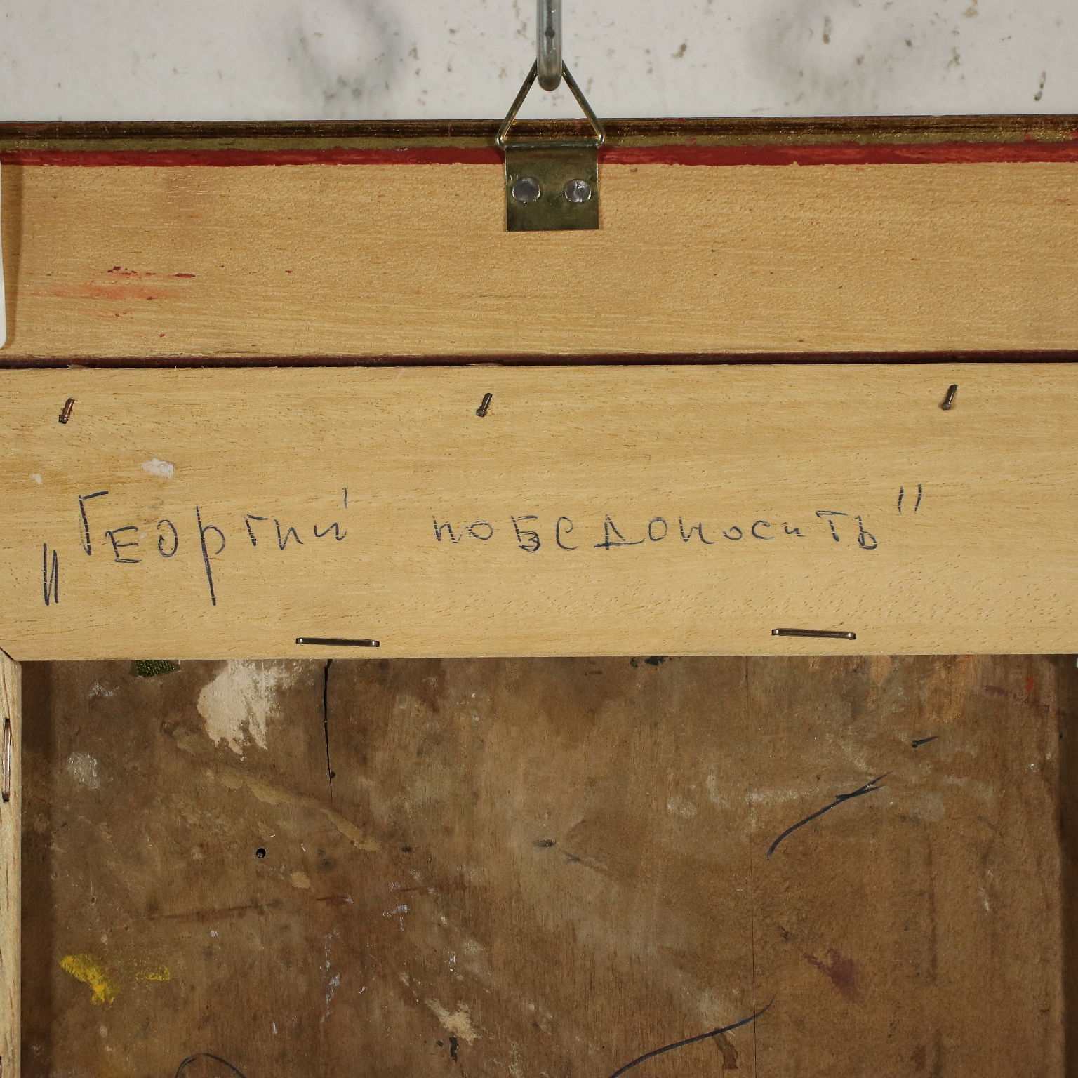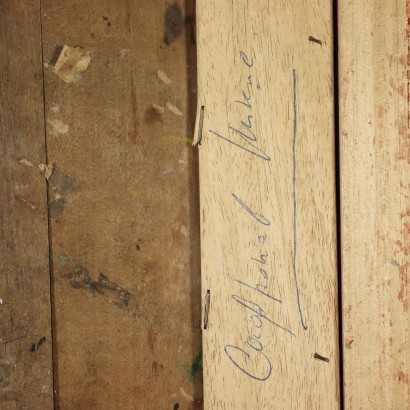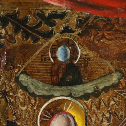 Oil on panel. Signed bottom right. On the back, with Cyrillic characters, there is the title, the date and the location, Bergamo. The Lithuanian artist, who currently lives and works between Moscow, Italy and the United Kingdom, is considered one of the most important contemporary Russian artists. In his large production there are landscapes, still lifes, many portraits of famous people and his surreal compositions, an expression of his peculiar "dream vision" of reality. Even in this table, albeit in the style of traditional icons, the depiction of the famous St. George is proposed in a surreal key that reminds of De Chirico, in which the dragon is replaced by a goose, the Saint's head is an egg, in the outlines there are figures of sorceresses... a clearly unorthodox interpretation! The panel has a vertical slit. The piece is presented in a frame.