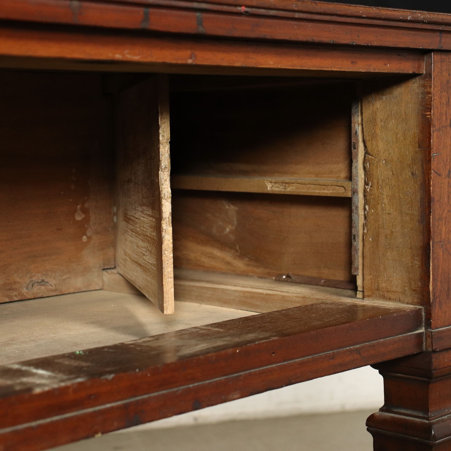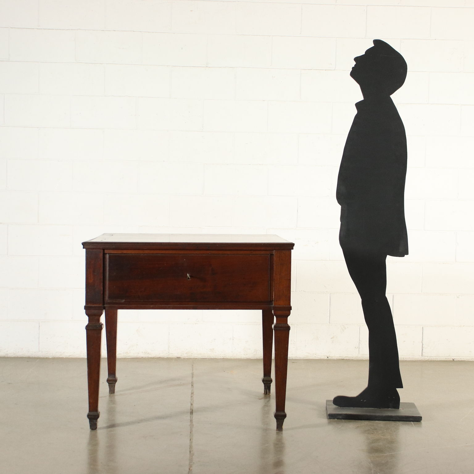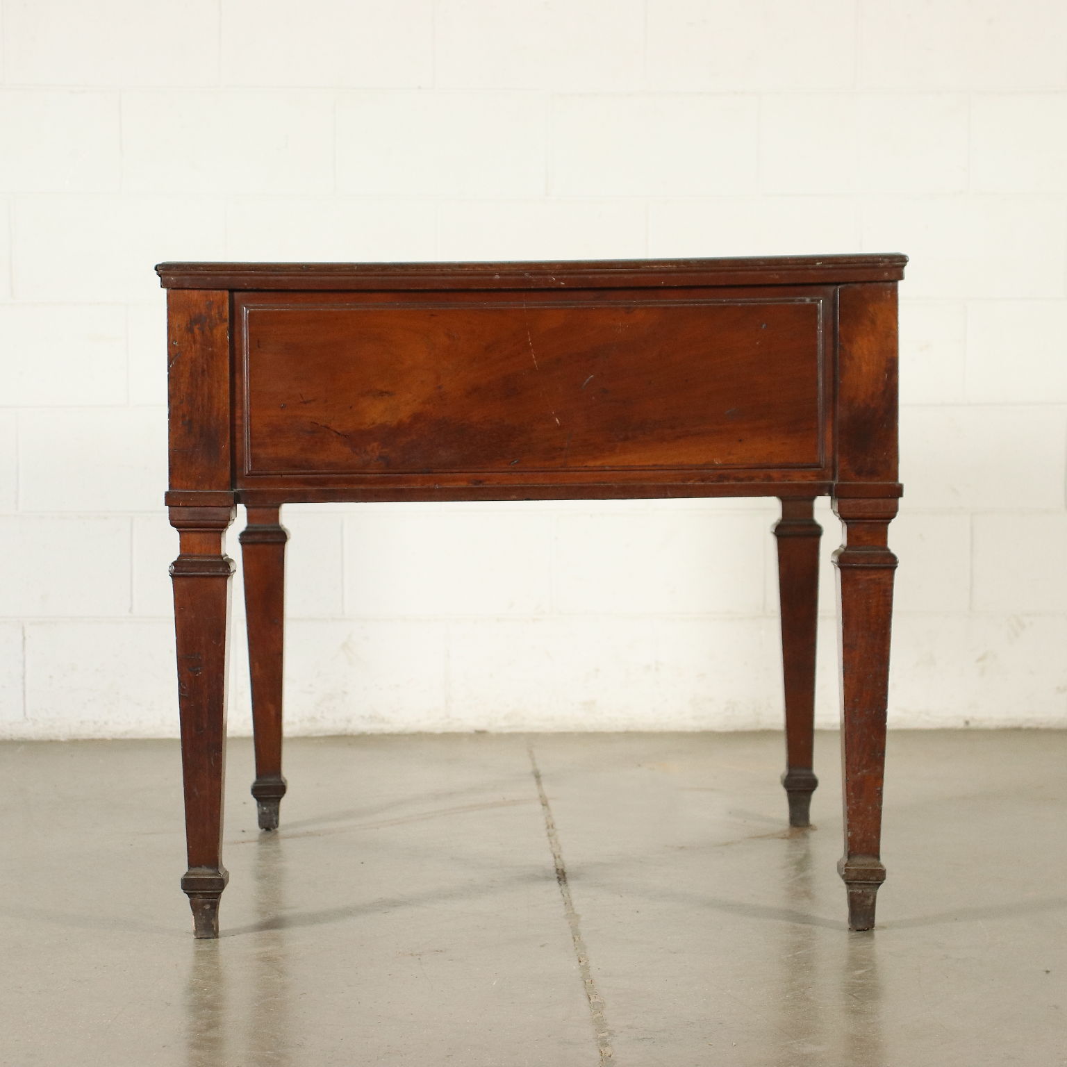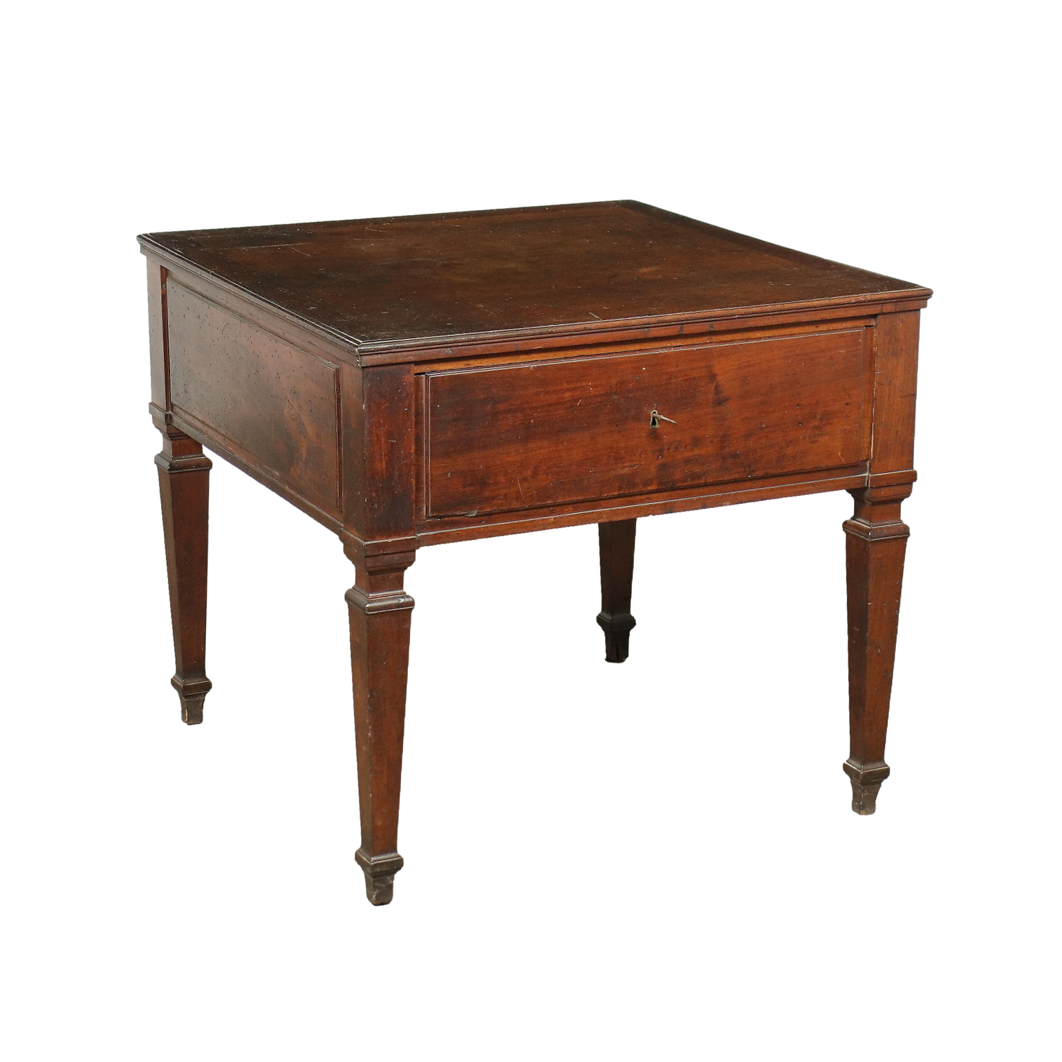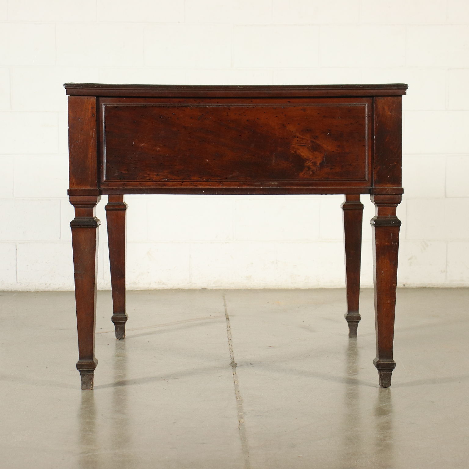 Directional work table, supported by truncated pyramidal legs tightened by a collar at the top, in the high band under the top there are two drawers. Walnut.