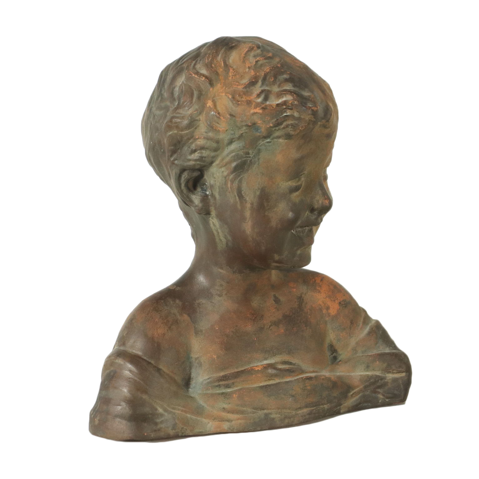 Patinated earthenware bust of a young man laughing. It is a copy by Desiderio Settignano 1460-1464.