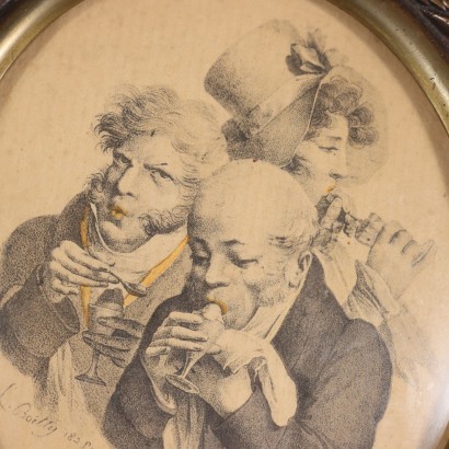 Lithographs. The engraved drawings propose two caricatured sketches: one entitled "La dégustation" and the other "Mangeurs de glaces", both therefore with themes relating to taste and .... the sin of gluttony. They reproduce in engravings two works by the French painter Louis Léopold Boilly, known above all for his genre scenes, which reproduce moments of everyday life, often in an ironic key. The two engravings are presented in contemporary brass frames.