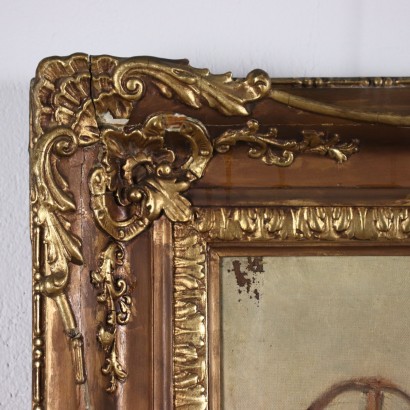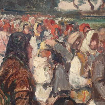 Oil on canvas. Signed lower left. The scene depicts a popular procession in a country in the Hungarian countryside, as can be deduced from the characteristic clothes: a large crowd walks in procession, while many other faithful along the road pay homage to the Cross and the banners carried in arms. It is the work of the Hungarian artist of Jewish origin Erno Tibor, who trained at the Academy of Fine Arts in Budapest, then studied in Paris and worked throughout Europe, settling in Nagyvárad (Oradea) in Romania, where he founded a school of art. There he remained until, in 1944, he was deported to the Dachau concentration camp, where he died. Tibor first established himself as a painter close to Impressionism, to then move on to a more modern painting. His subjects were mainly the places he lived in, depicted in scenes full of characters and episodes of popular life. The painting has several slight patches. It is presented in a gilded frame from the mid-1900s, with several shortcomings.