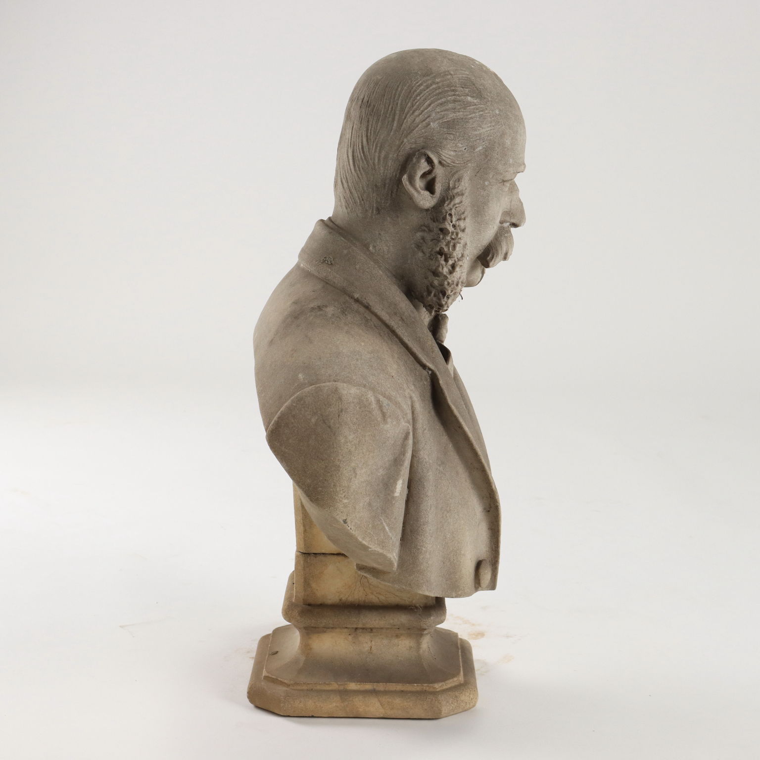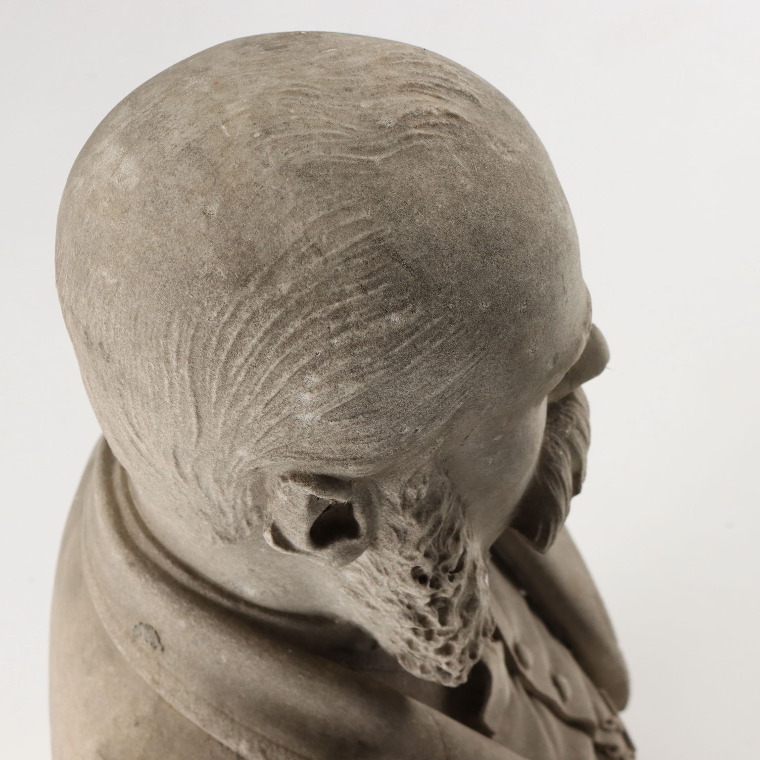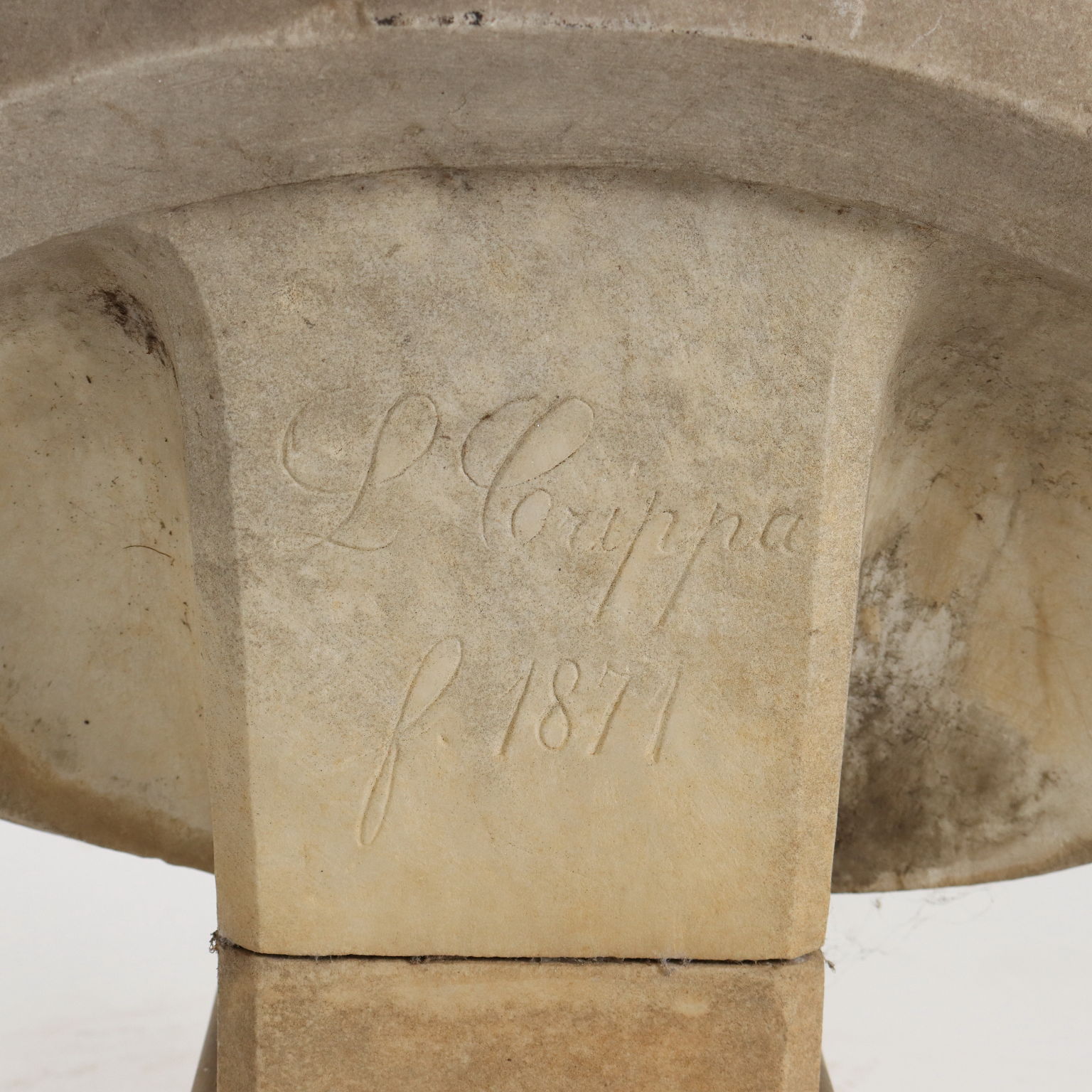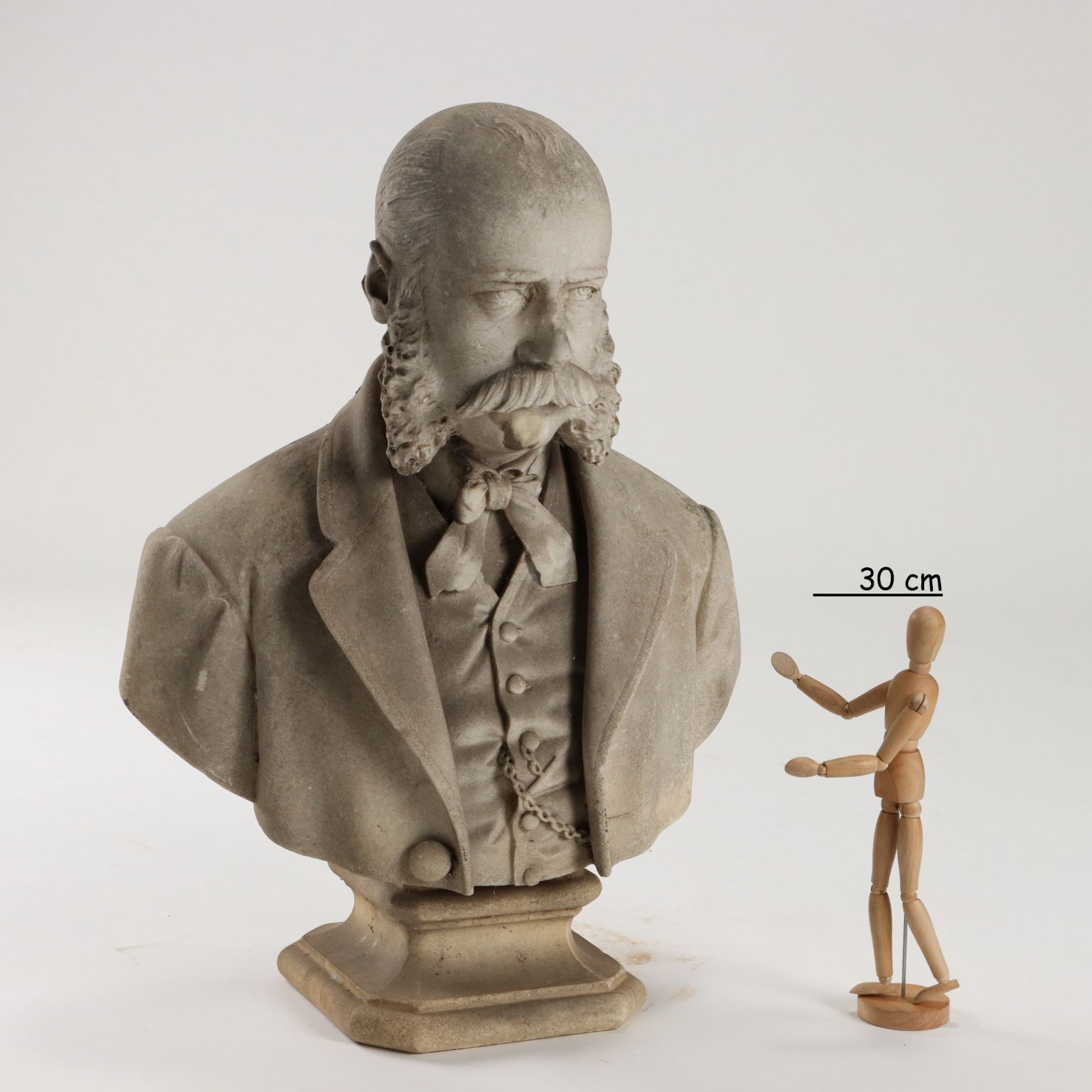 Marble sculpture depicting a gentleman. Behind, engraved signature of the author and date of production.