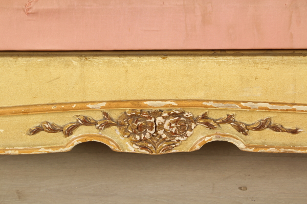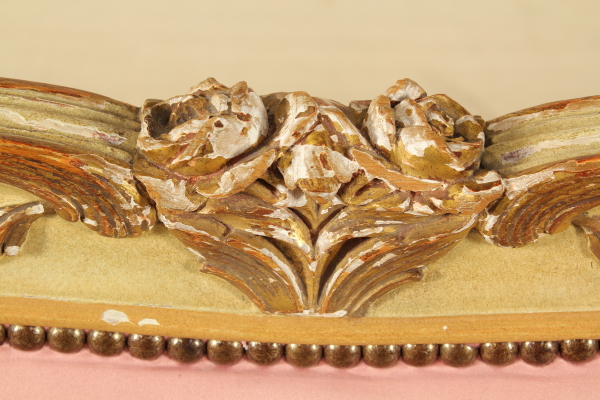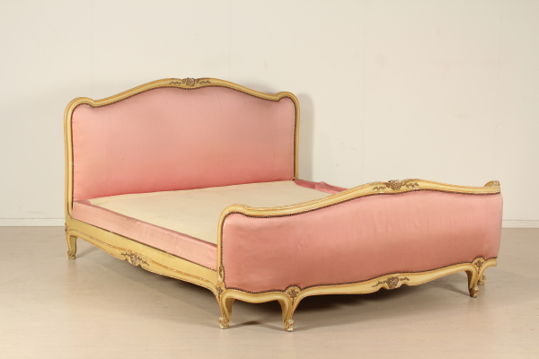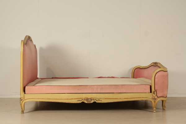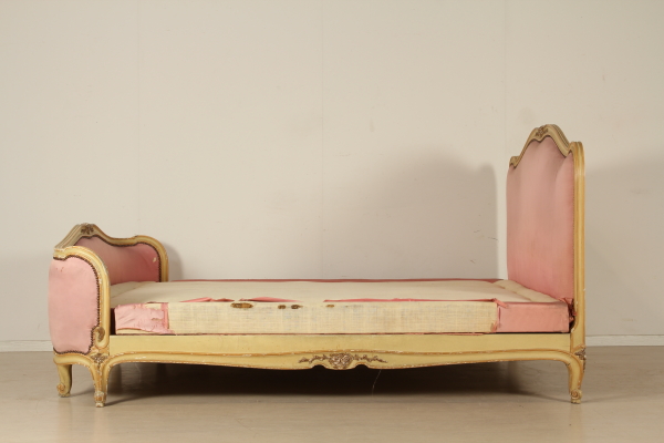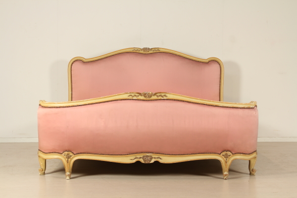 Read late Baroque style moved to the front with shaped headboard. Carved and painted.