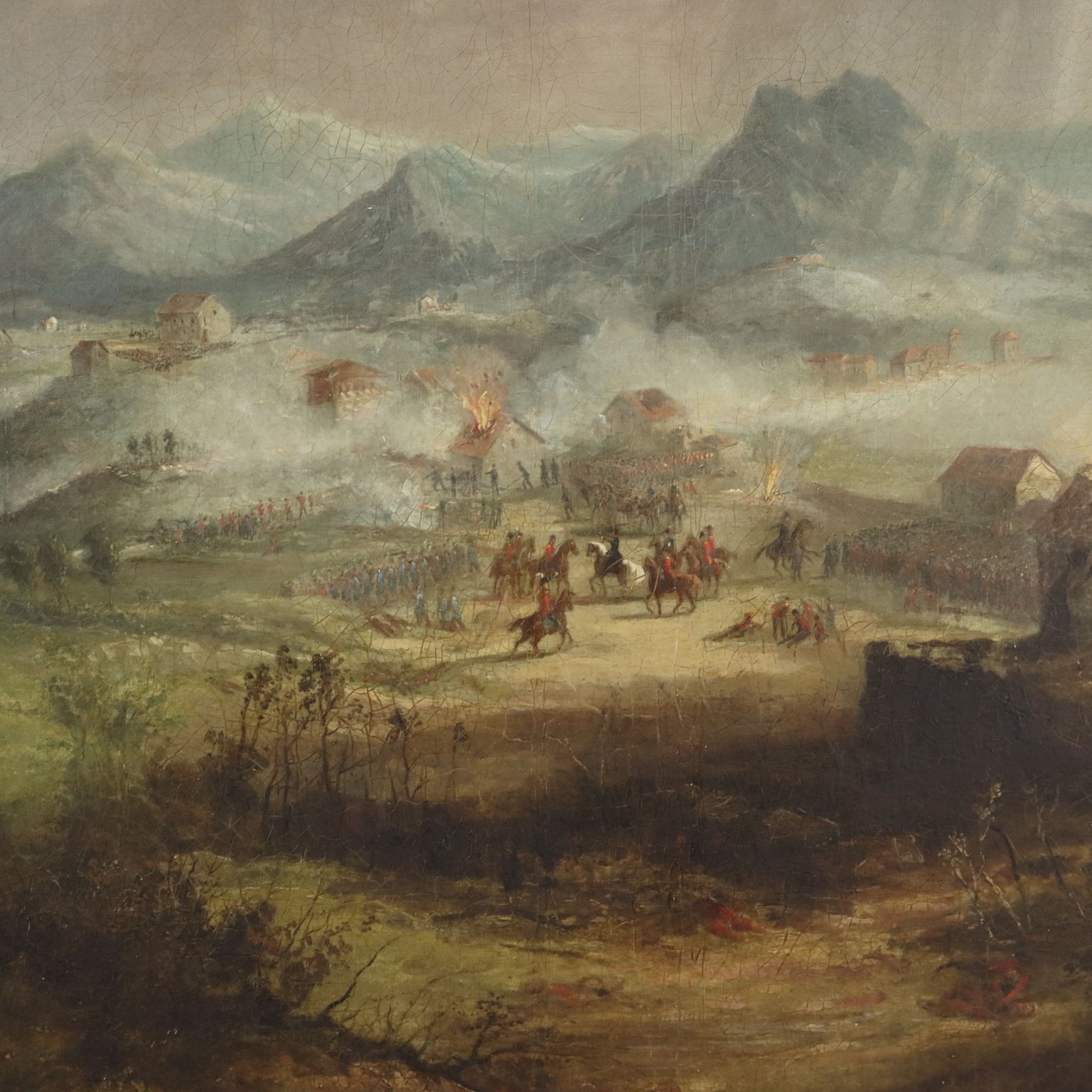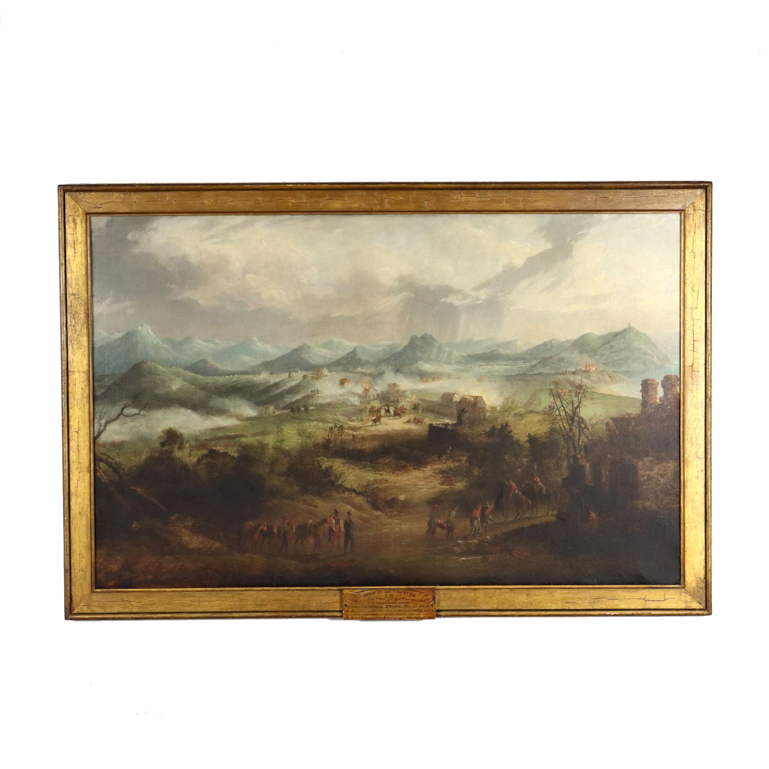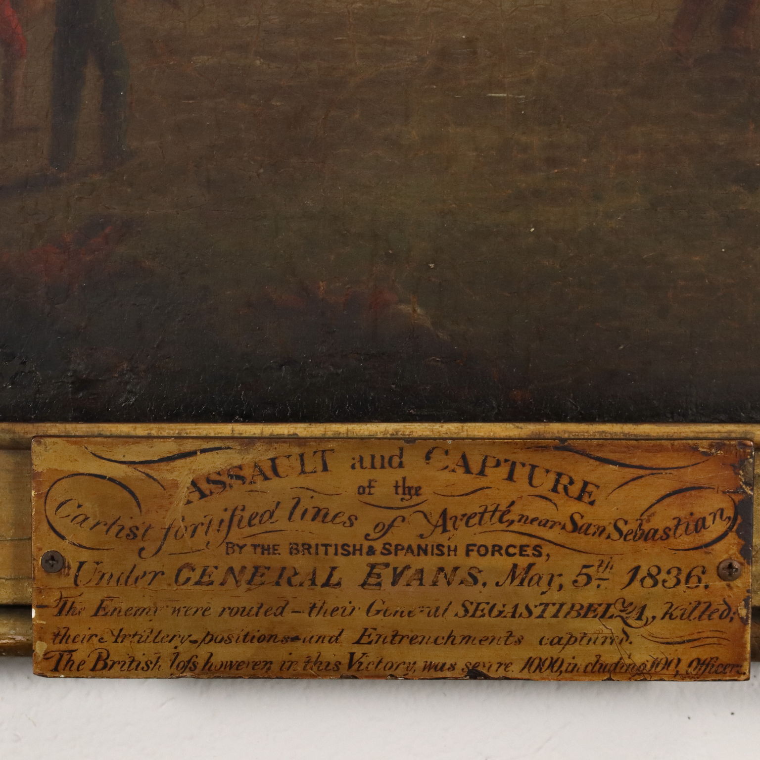 Oil on canvas. Under the canvas a plate shows the data of the scene: the battle that took place on May 5, 1836 in San Sebastián, during the First Carlist War, is depicted, in which the Spanish troops opposed to the English ones commanded by General George de Lacy Evans. Carlist wars are the discontinuous but persistent civil wars that were fought in Spain during the nineteenth century, and which saw the counter-revolutionaries and Catholics who fought for the maintenance of tradition in the Spanish monarchy, against the liberalism promoted by the Queen Isabella II of Spain and all that it entailed. The British sided in favor of the liberals. The work, restored and relined, is presented in a coeval frame from the end of the 19th century.