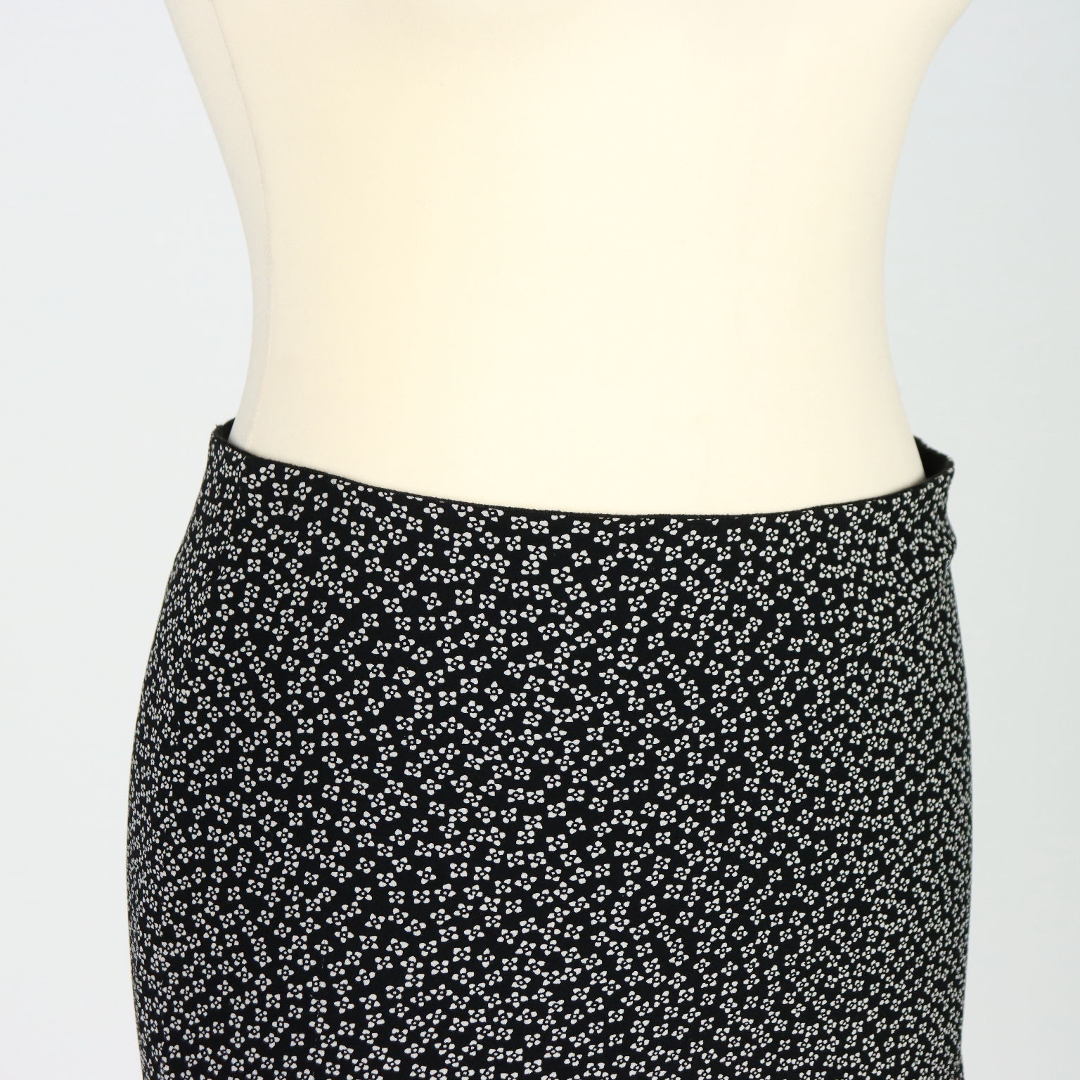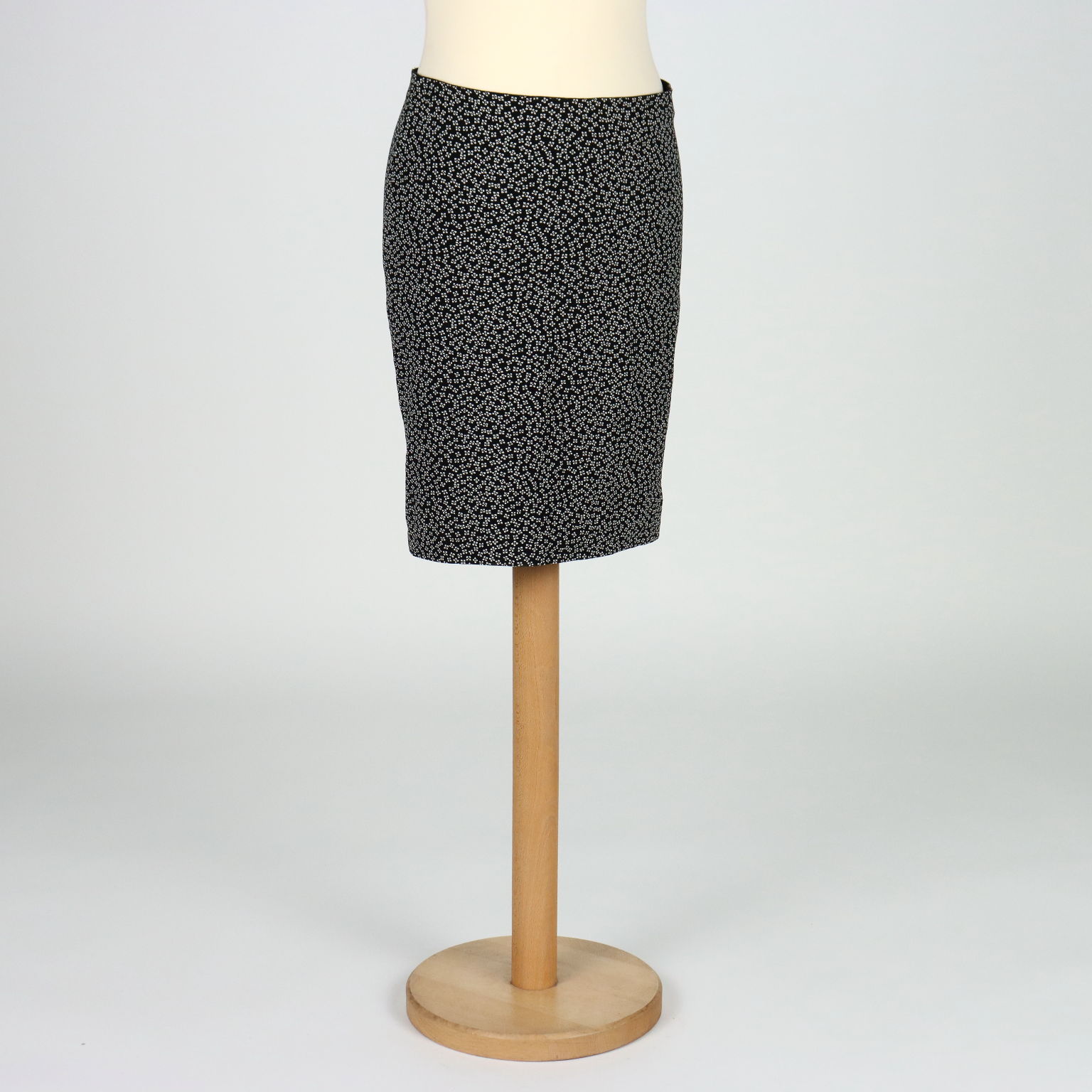 Silk skirt with white flower print on a black background. The garment is lined in silk, with a small percentage of elastane, has a small slit on the back and a zip on the back as well.
