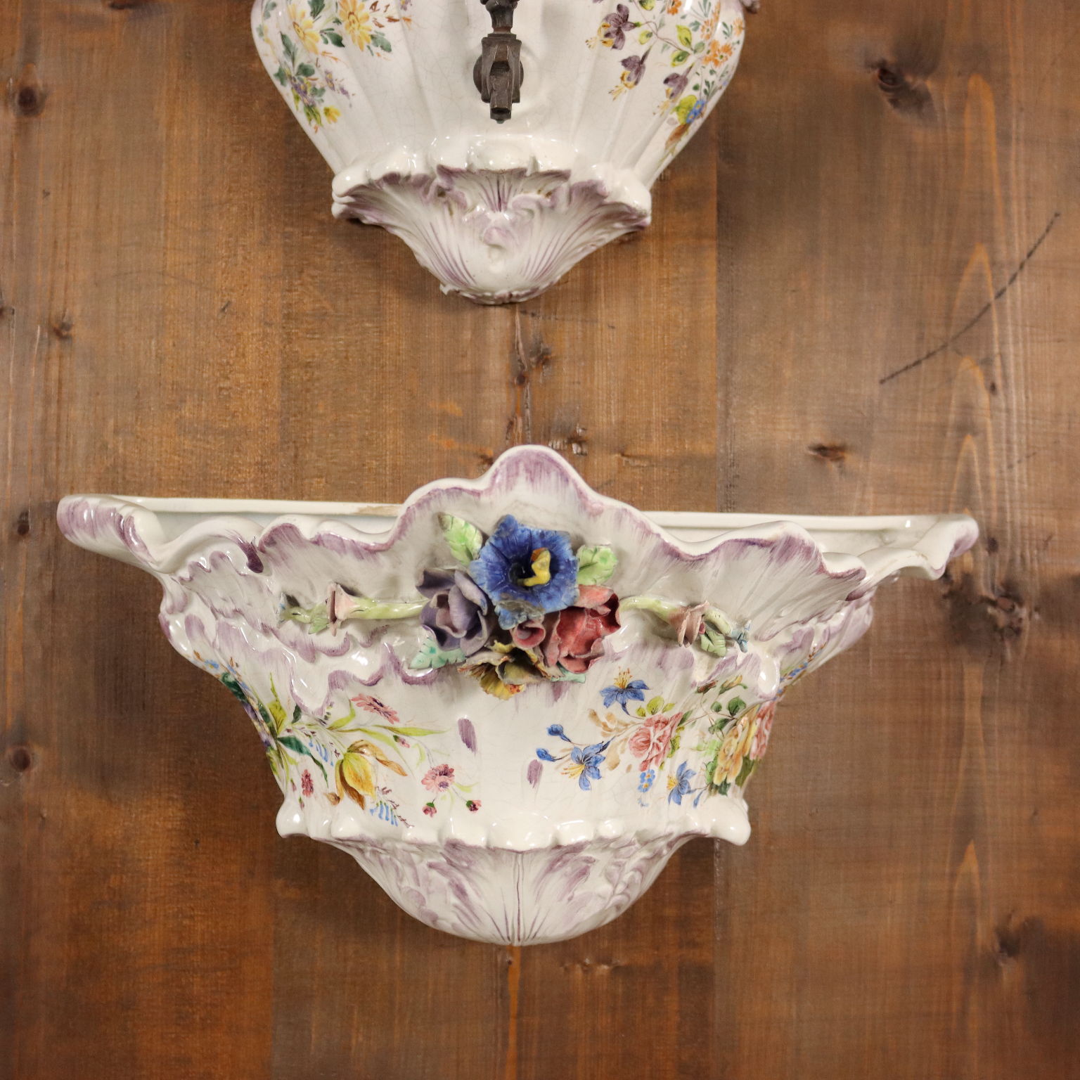 Polychrome painted ceramic fountain with bunches of flowers and plant motifs relief decorations. The fountain is presented on a wooden support.