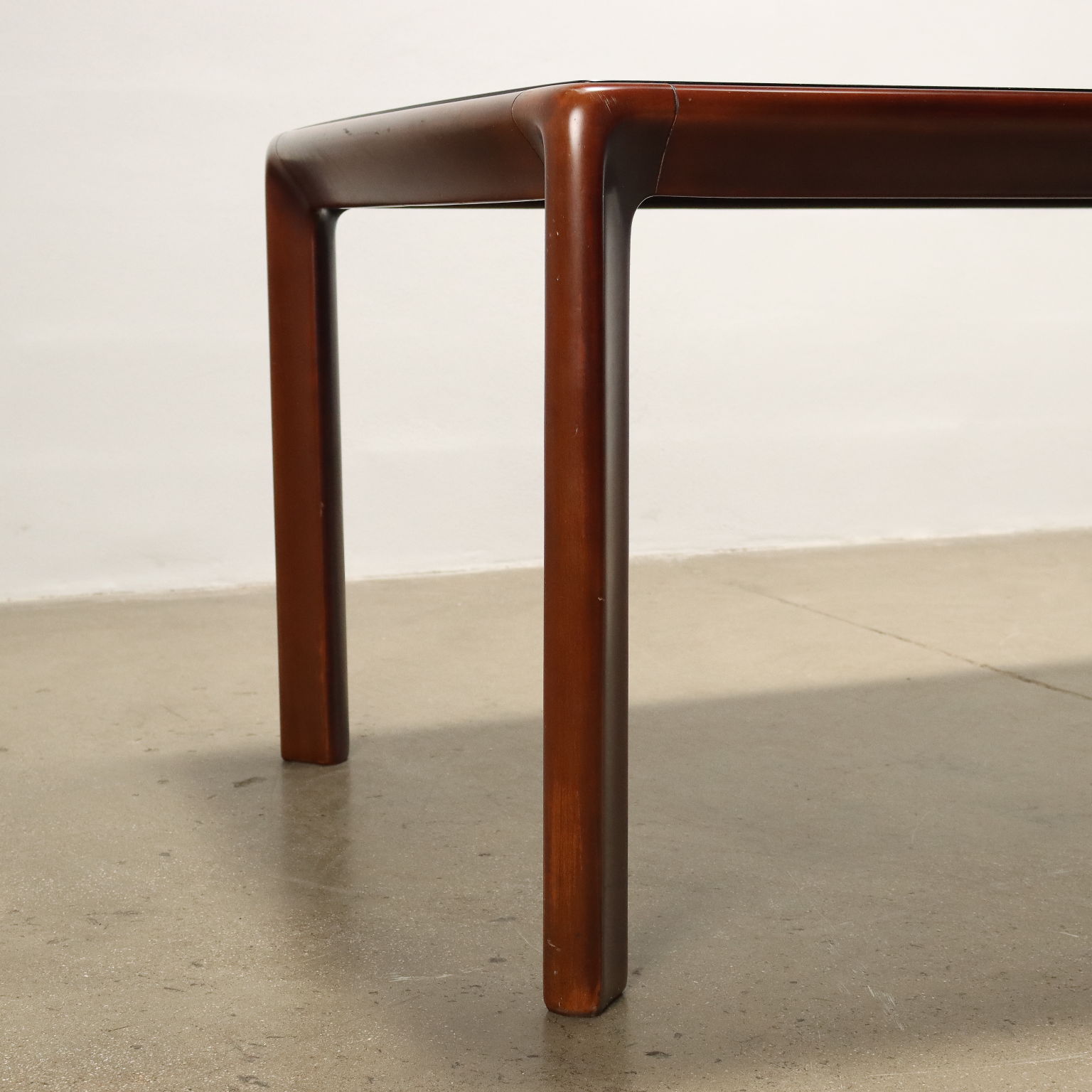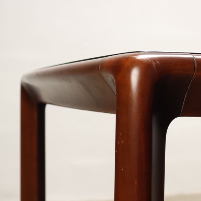 Rectangular dining table from the “de nos” 70s series in solid walnut wood with glass top.