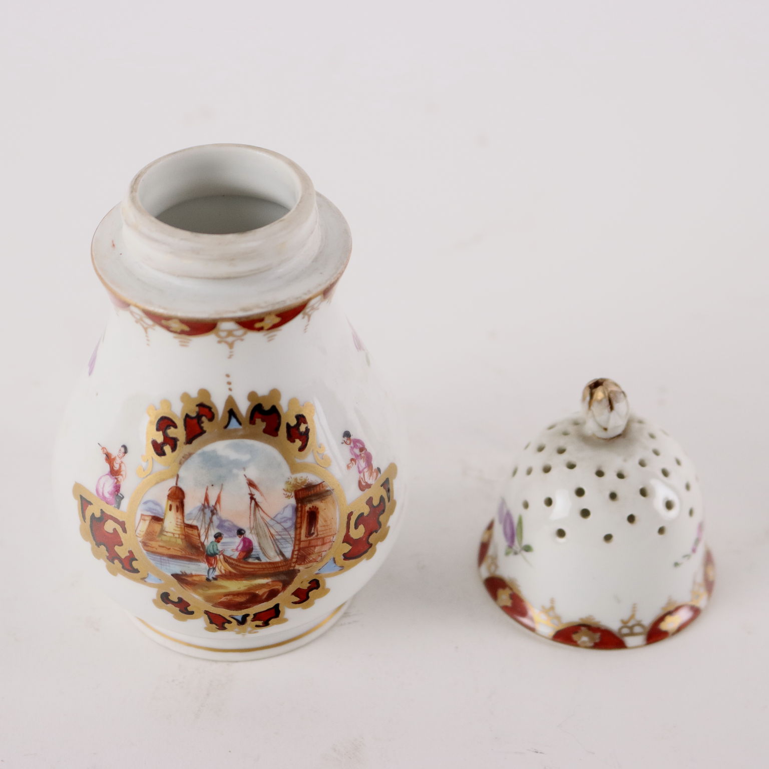 Porcelain salt shaker with polychrome plant motif decorations. In the reserve scene with fishermen on the shore. Under the base brand of the manufacturer.