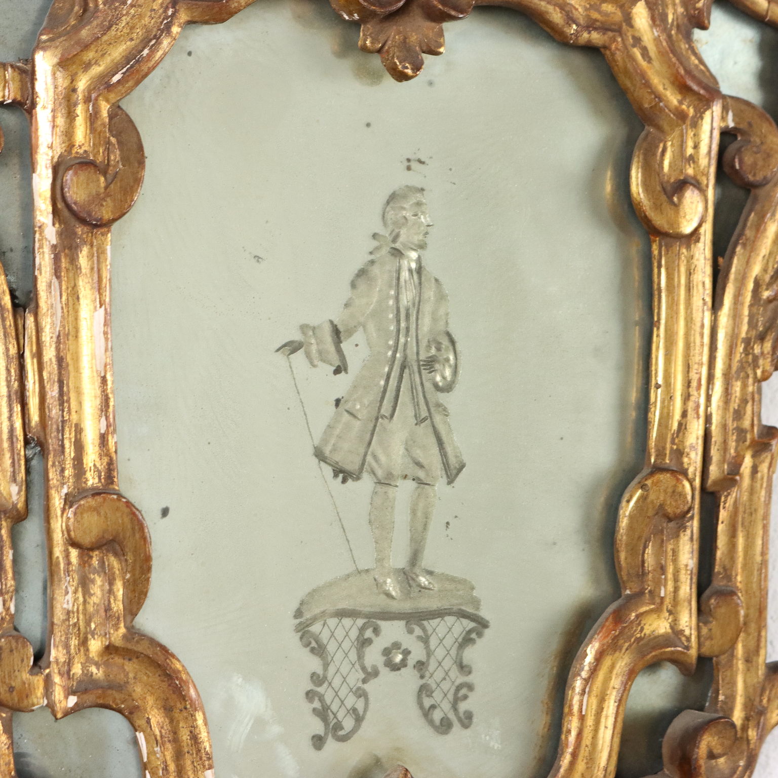 Pair of Venetian baroque style mirrors in carved wood with rocaille, vegetable and gilded motifs, Italy, late 19th - early 20th century. Etched mirrors portraying a couple of idealized figures, with male and female subjects facing each other.