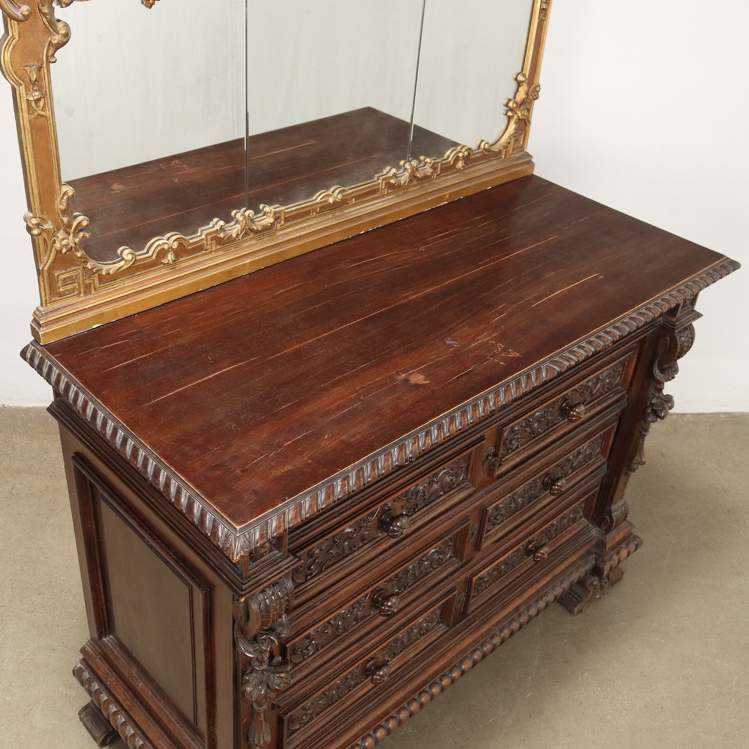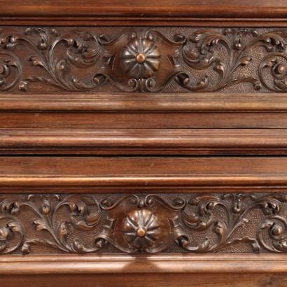 Neo-Renaissance chest of drawers supported by shelf feet, on the front it has three drawers plus two placed in the under-counter area. In walnut, it is richly decorated with neo-Renaissance style carvings, such as rosettes, leaf motifs in the drawer reserves and fruit festoons in the uprights. On the surface rests a mirror with a curl-shaped and gilded frame.