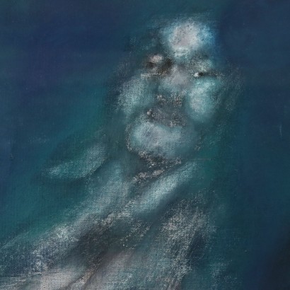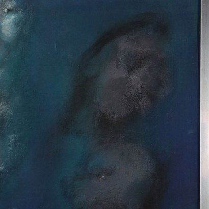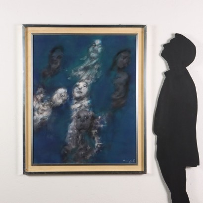 Oil painting on canvas. Signed and dated lower right. Faces that stare upwards emerge, indefinite, floating, superimposed, on a background that is also vague and indefinite. The work produced in the 1960s by the Genoese artist (not only a painter) Aurelio Carminati, that is, the second phase of his continuous and inexhaustible artistic research, that of the so-called "false ideologies", that is, explicit quotations from famous paintings, but also inventions original figurative as the evanescent presence of strange ghosts emerging from the canvas or paper. Caminati was an artist who loved to experiment, passing from the social realism of denunciation (he was a partisan of the Second World War), to a painting close to pop-art, to then return to hyper-realism. The work is presented in a contemporary frame.