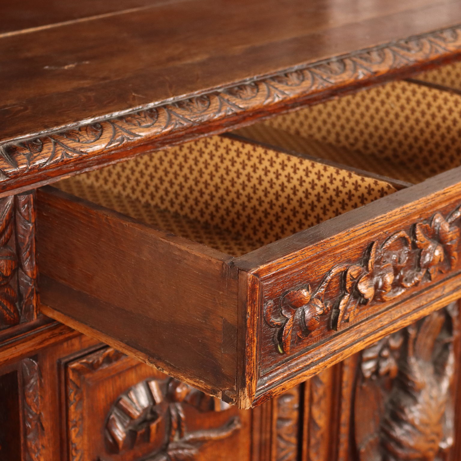 Notched corner unit with neo-Renaissance oak riser, France, late 19th century. 2-shelf stand, body equipped with a pair of paneled doors embellished with game and carved grape leaves, placed within twisted columns; turned front feet. Decorated with fret motifs and carved leaves and mouldings.
