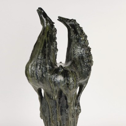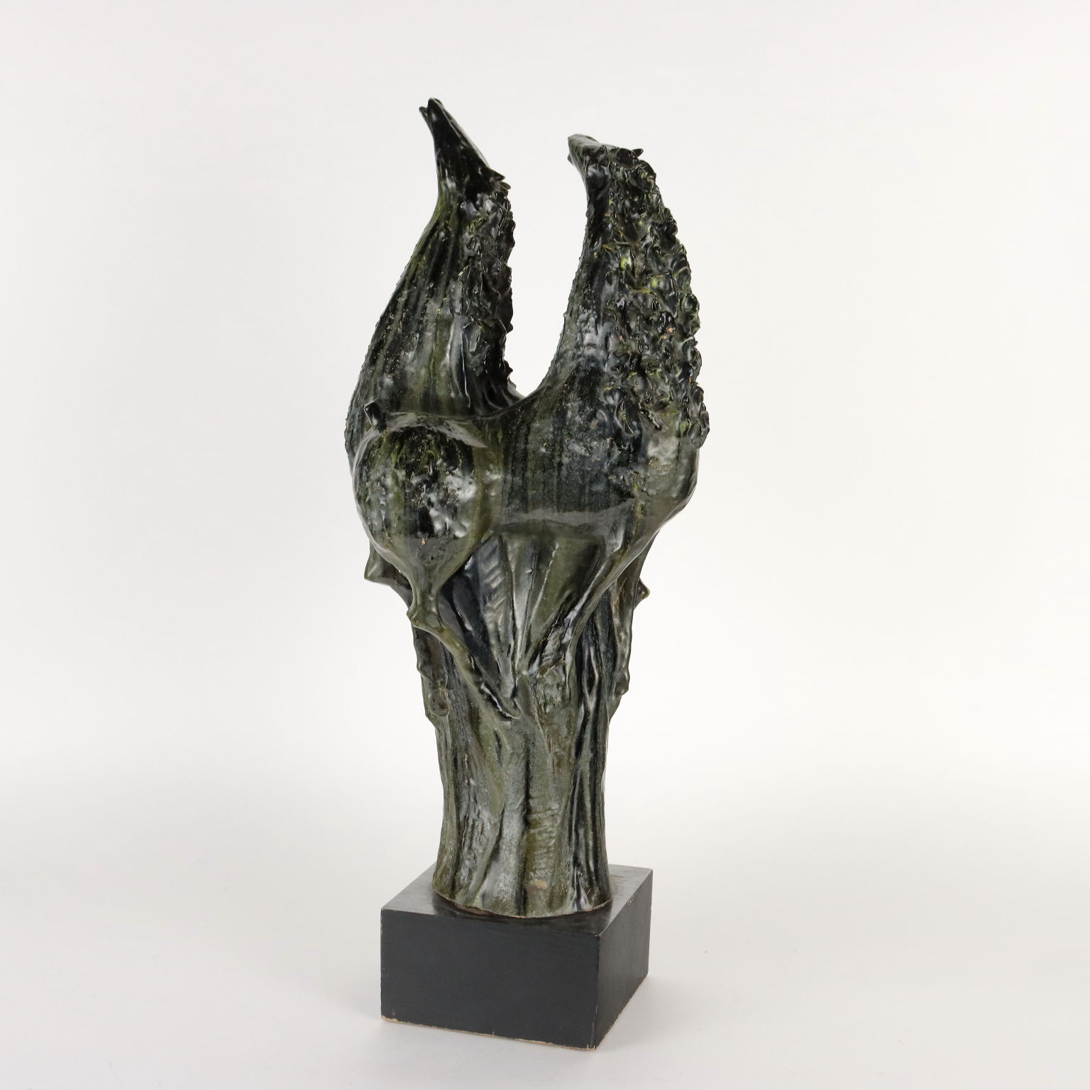 Glazed ceramic sculpture on a wooden base depicting a pair of horses. Anonymous author.