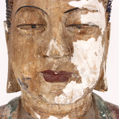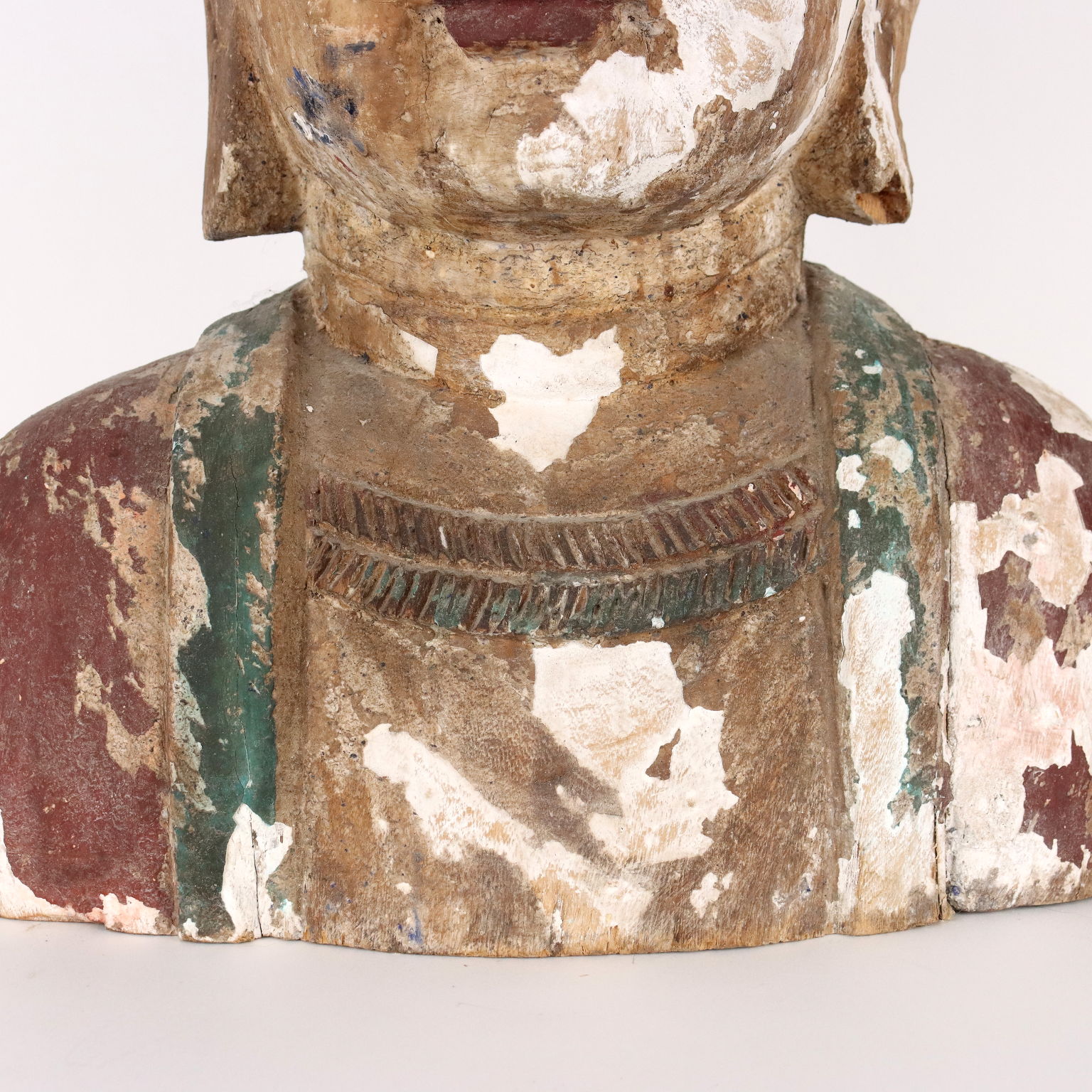 Carved and painted wooden bust depicting a Guanyin goddess of compassion. The face depicted with a quiet expression.
