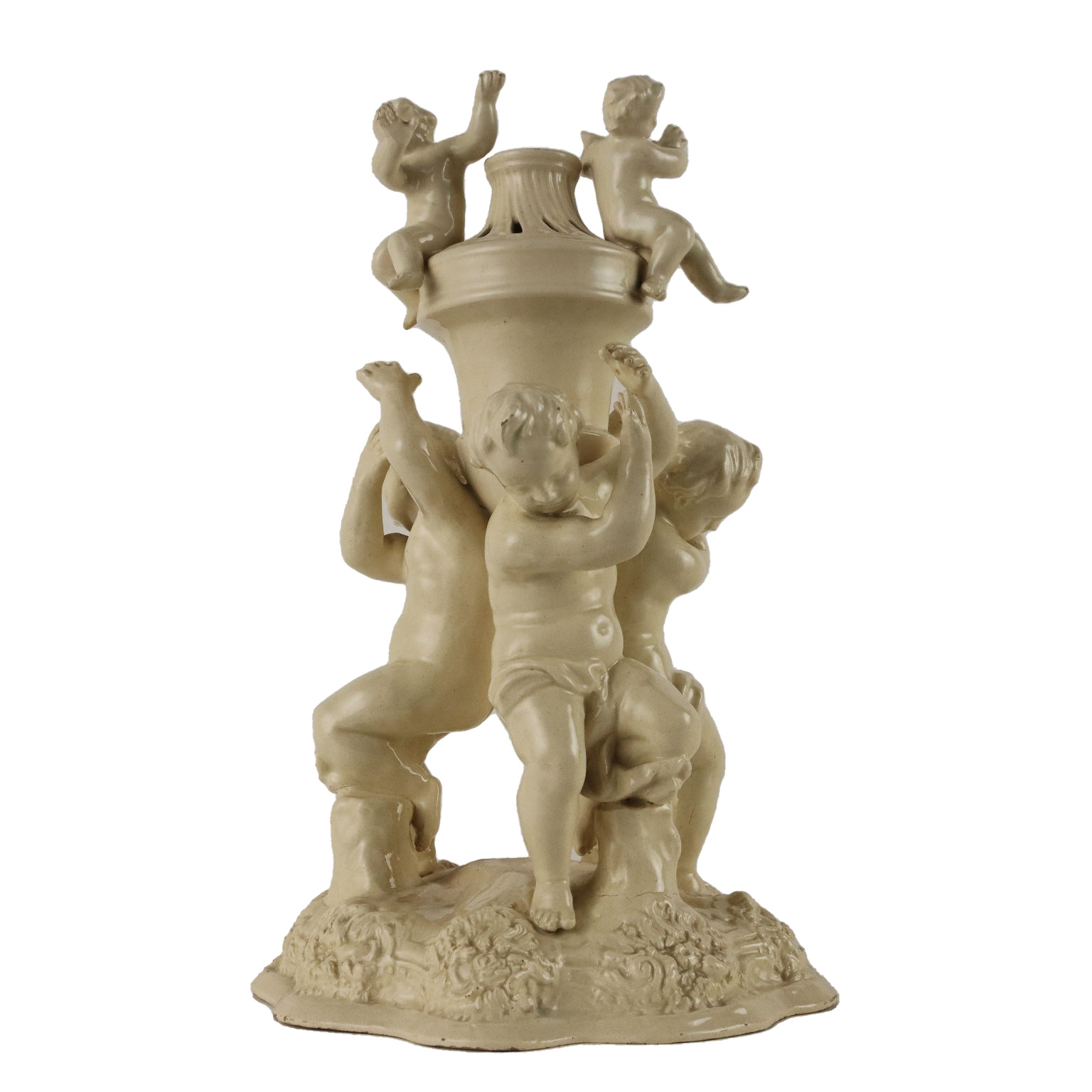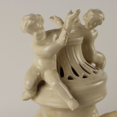 Centerpiece in cream colored earthenware with a perforated vase in the center supported and surrounded by cherubs. Under the base brand of the manufacturer.