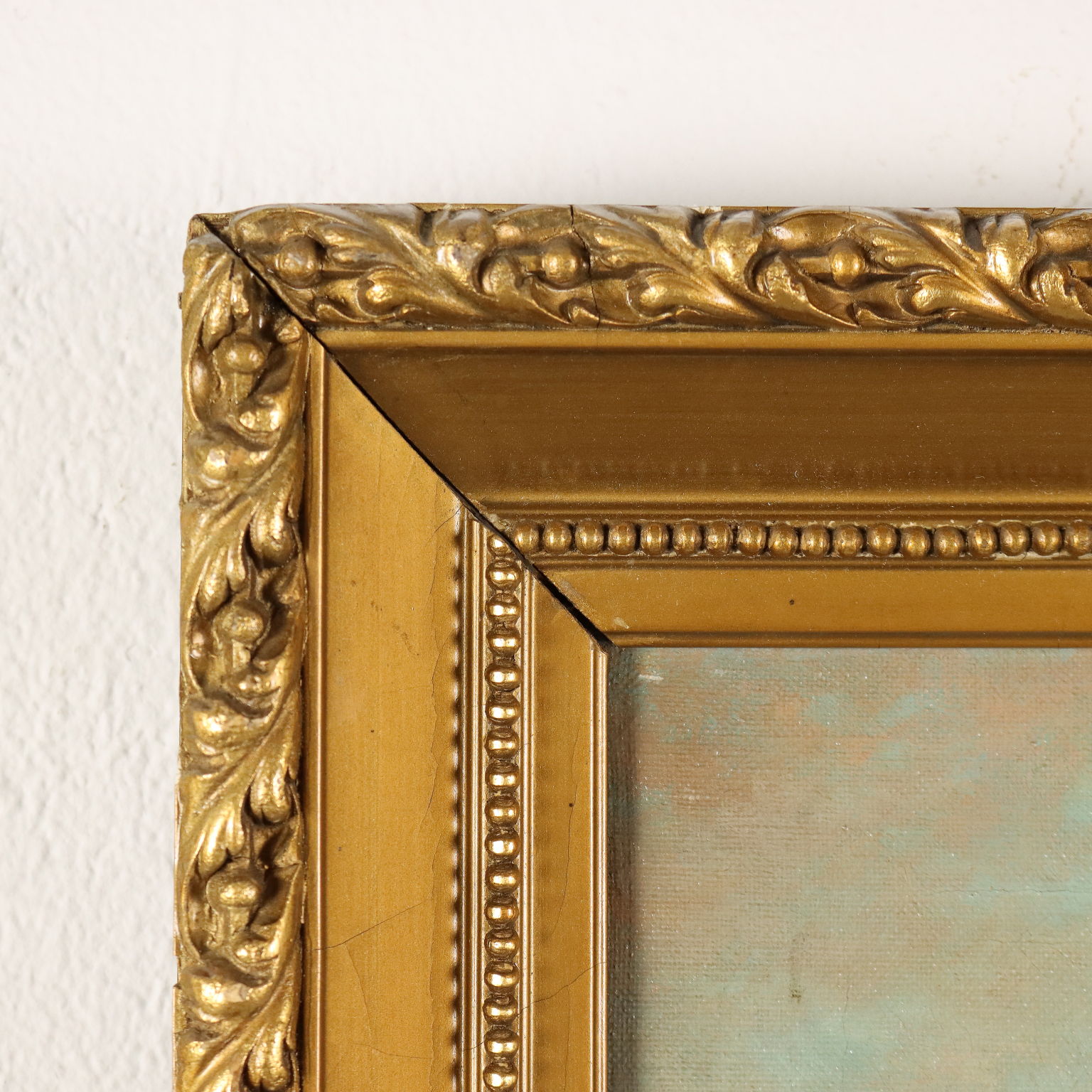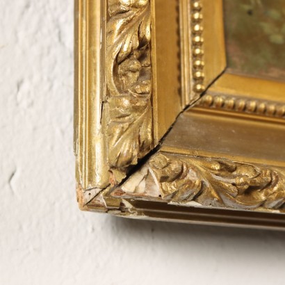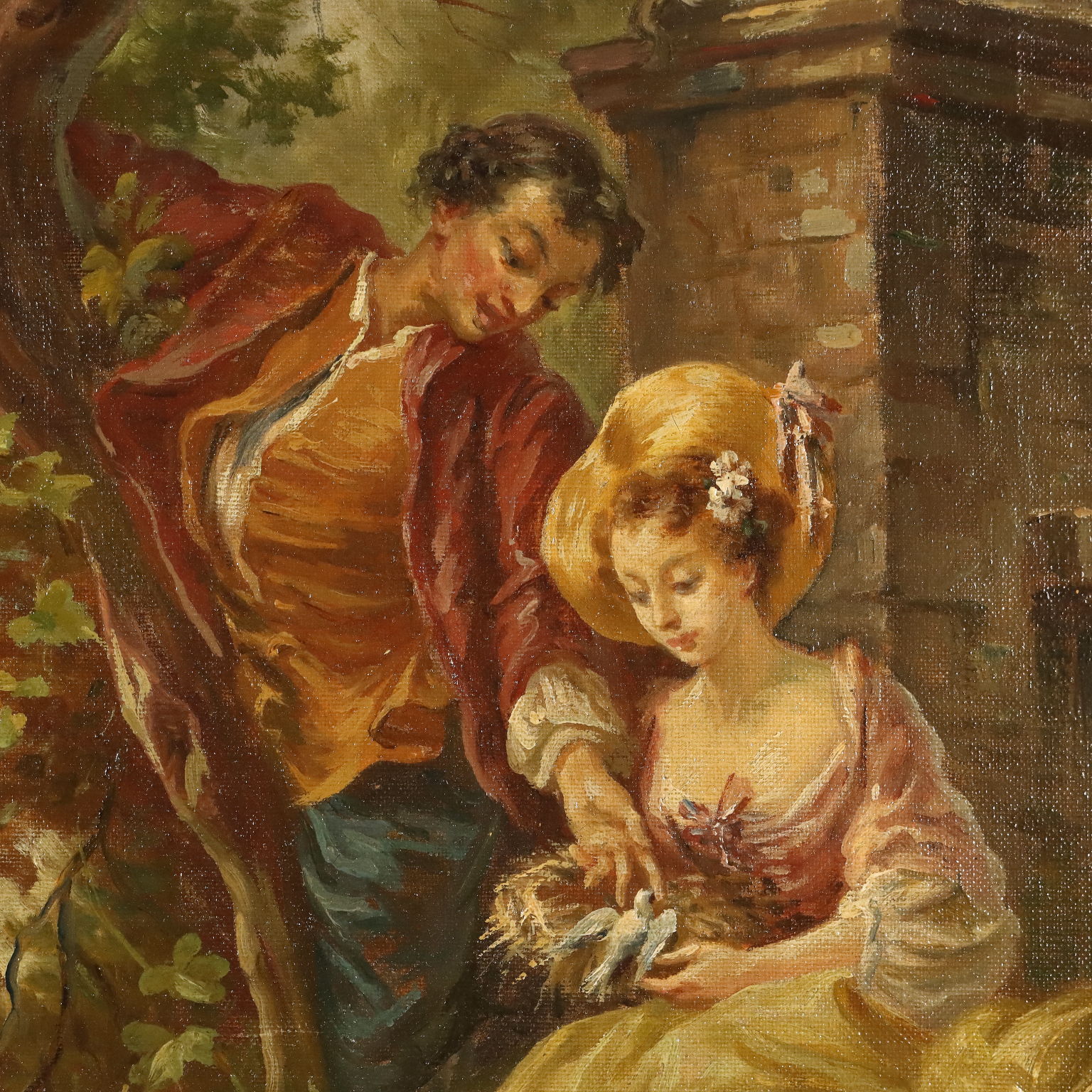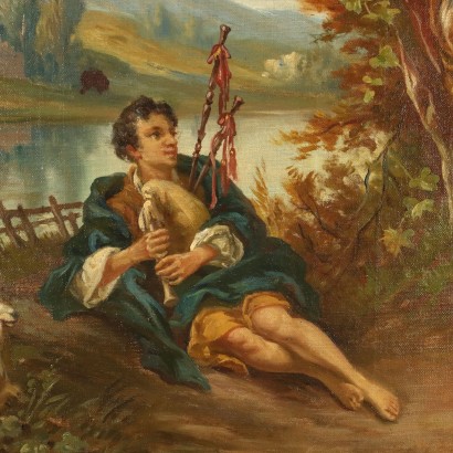 Oil painting on canvas. Signed lower right. In a bucolic landscape with green meadows, the slow river, rolling hills, under leafy trees, a shepherd boy gives a nest with a white dove to the young lady, while the companion watches with his bagpipes on his lap; behind the female figure, a pillar supports a lion figure in stone. Of the Piedmontese painter who lived in Sestri Levante, Gioacchino Aluffo, we mainly know the frescoes and mural restoration works of some Ligurian churches. The work is presented in a coeval frame, early 1900s.